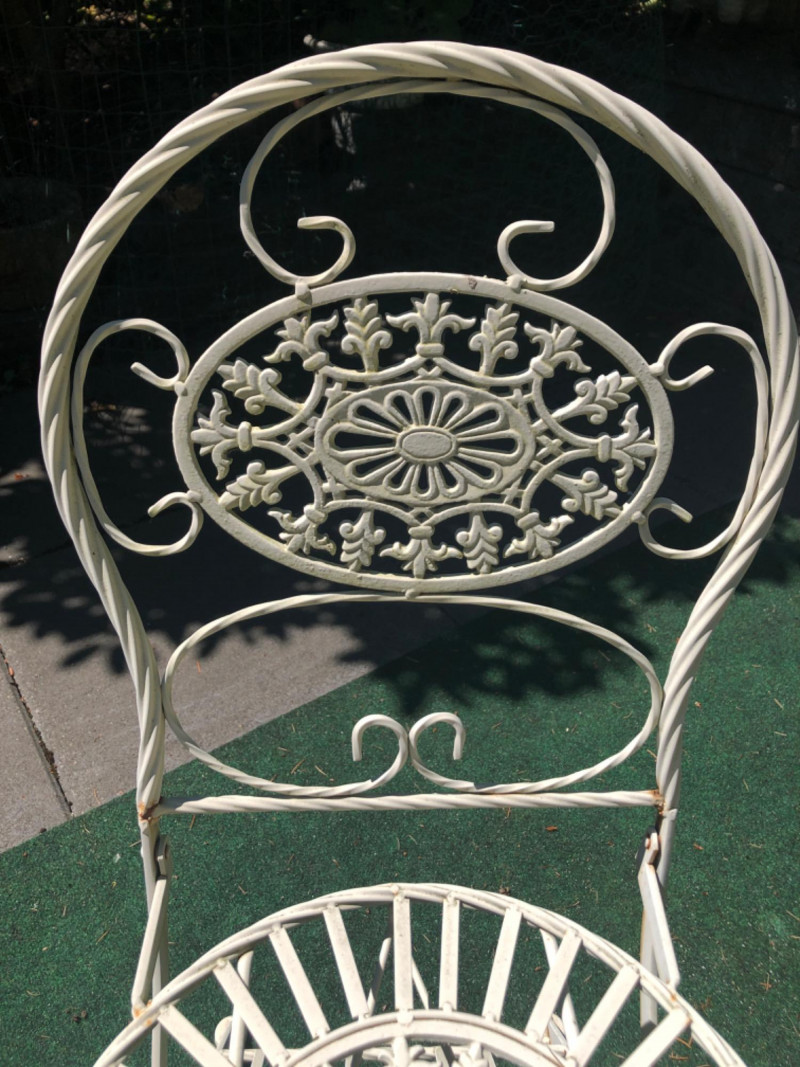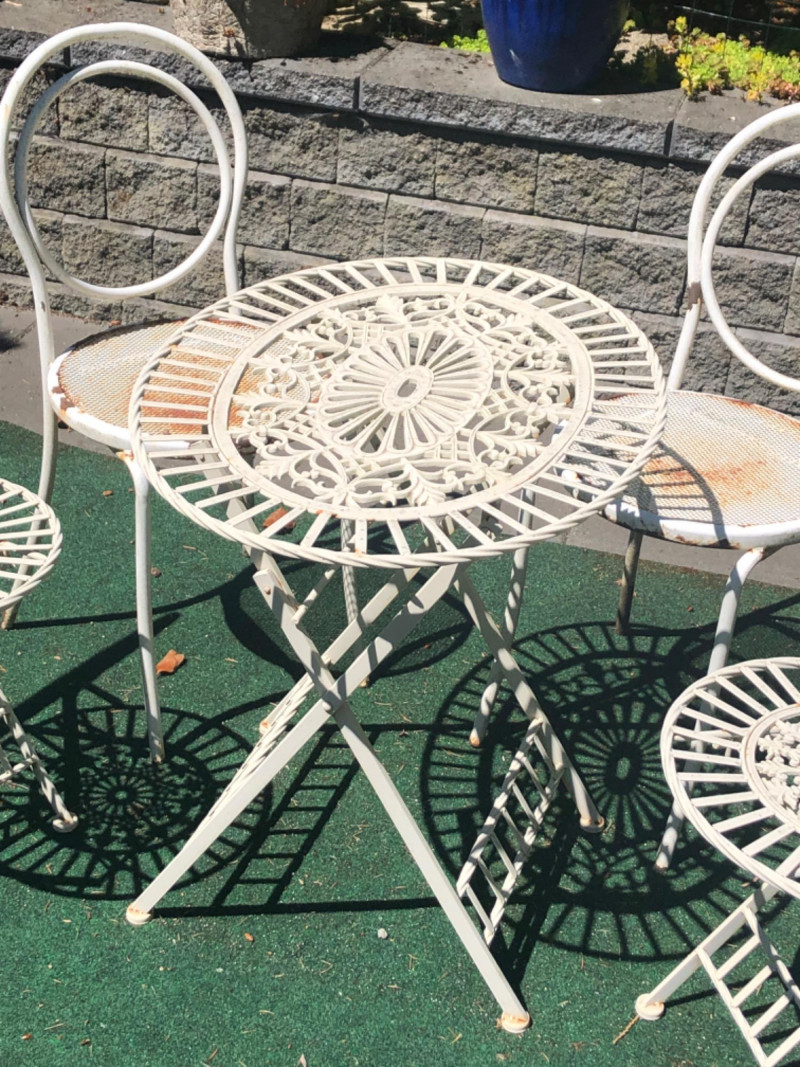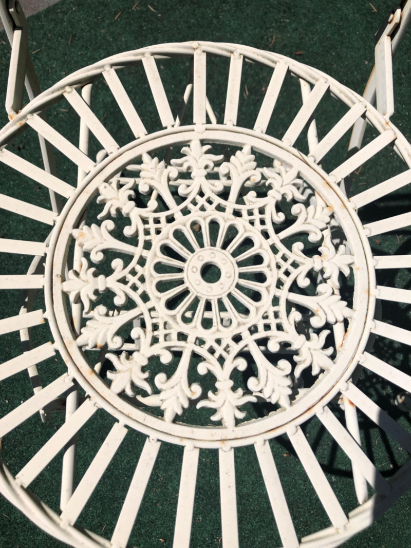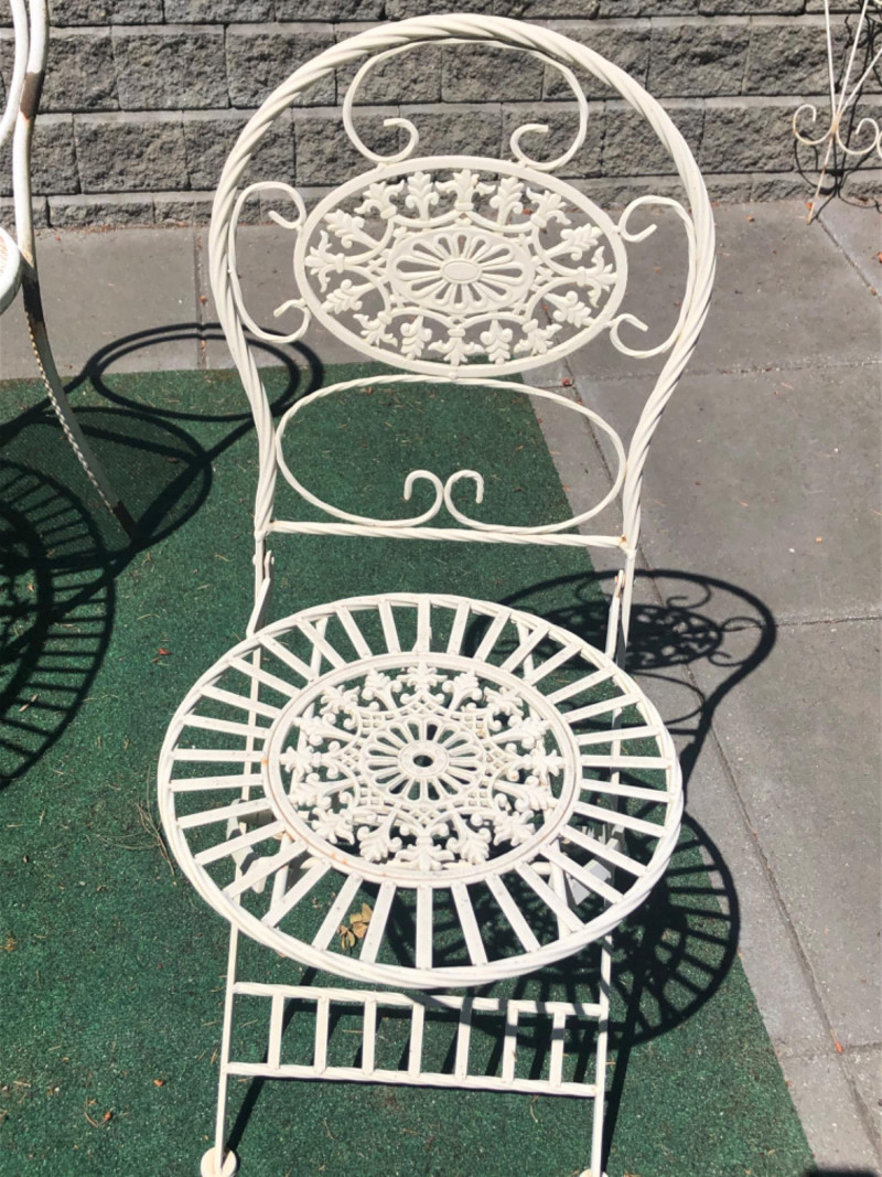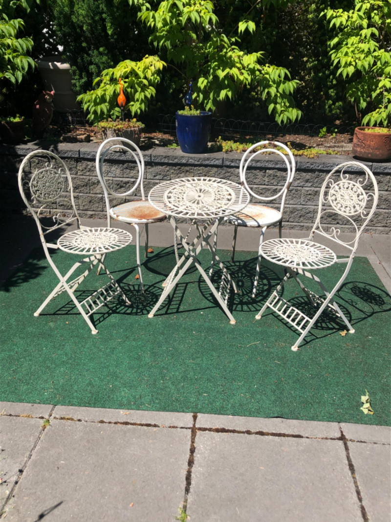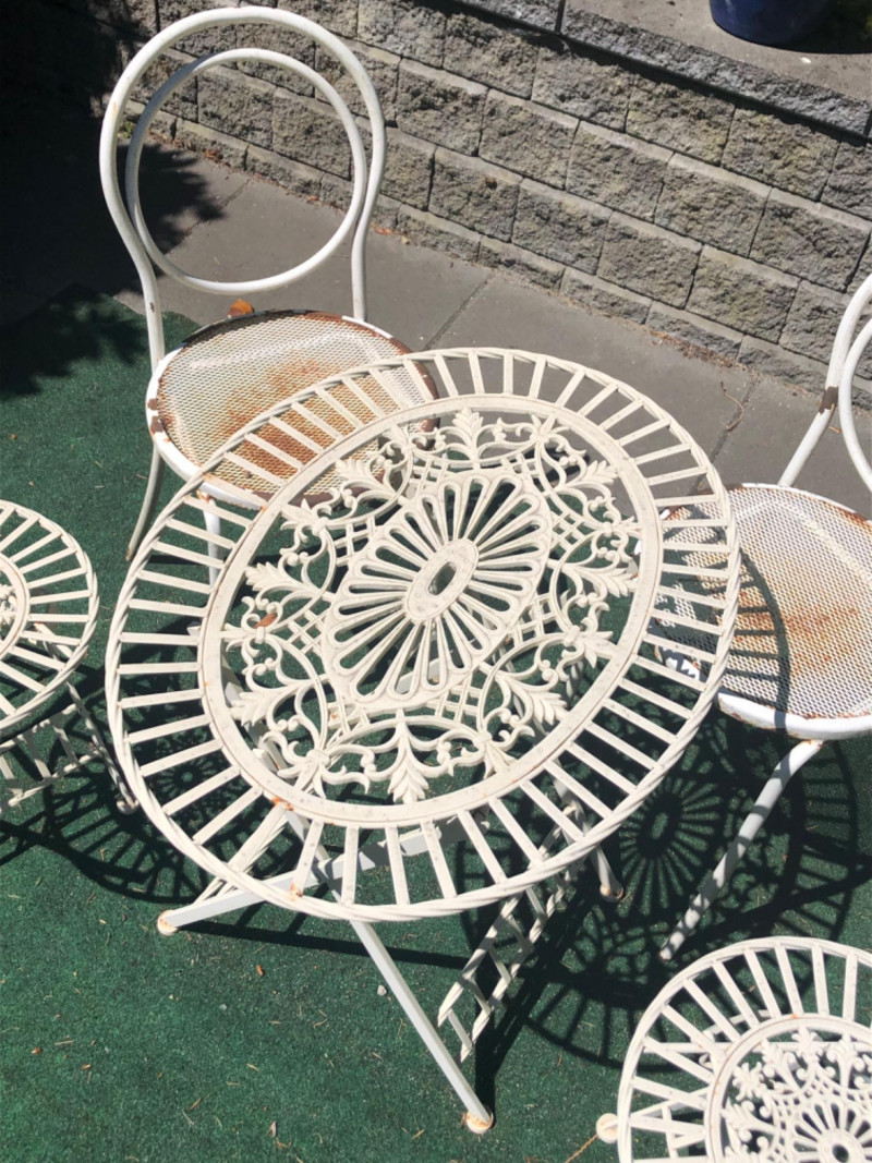 Classic vintage white wrought iron bistro set, featuring a small round table and four matching chairs. Perfect for patios, porches, or garden nooks, the set offers timeless style with intricate scrollwork and sturdy craftsmanship. Includes: 1 round table: 27" high x 29" wide x 22" deep 4 matching chairs: 36" high (back), 18.5" seat height, 15.5" wide x 22" deep Details: Wrought iron construction with white finish Curved lines and decorative accents throughout Weathered patina appropriate for age with a few chairs showing significant rusting Friendly Reminder: This auction will start closing at 6:30pm on Tuesday, August 12th