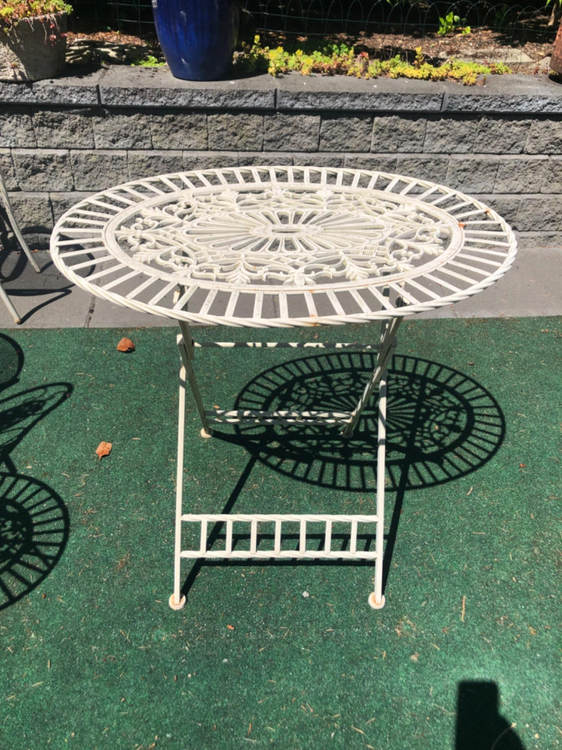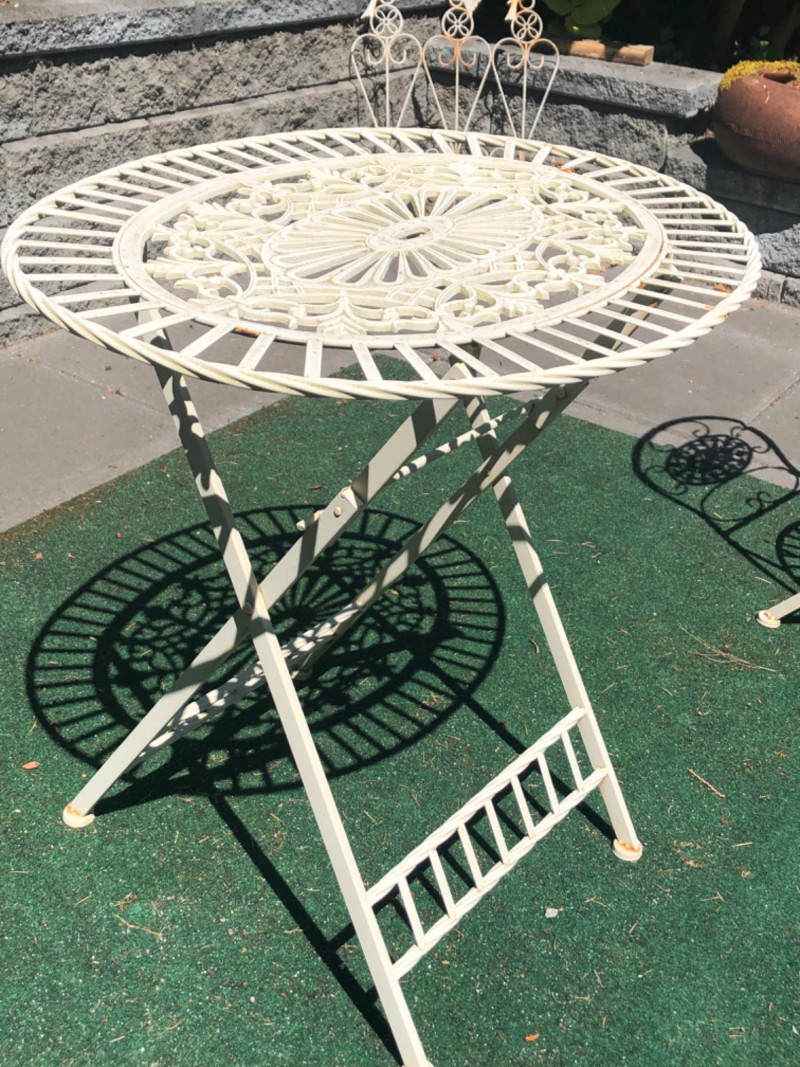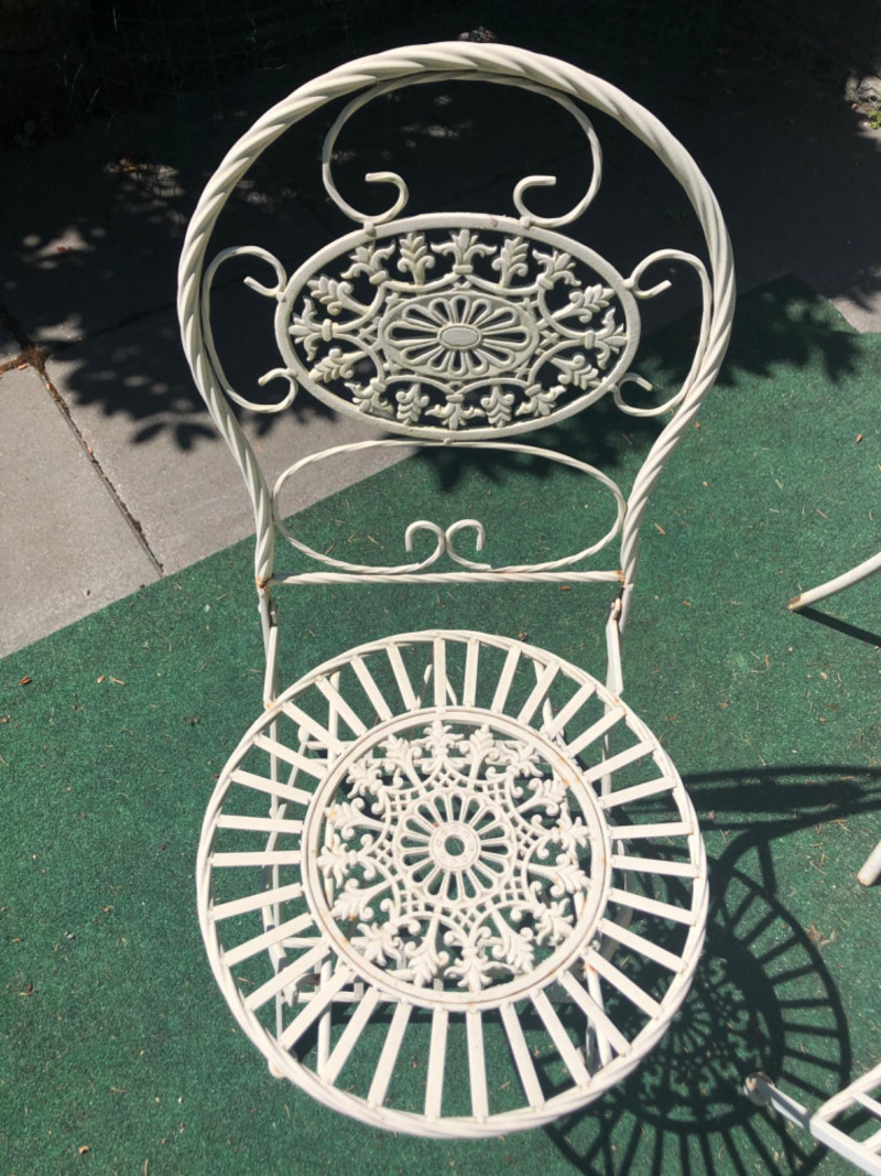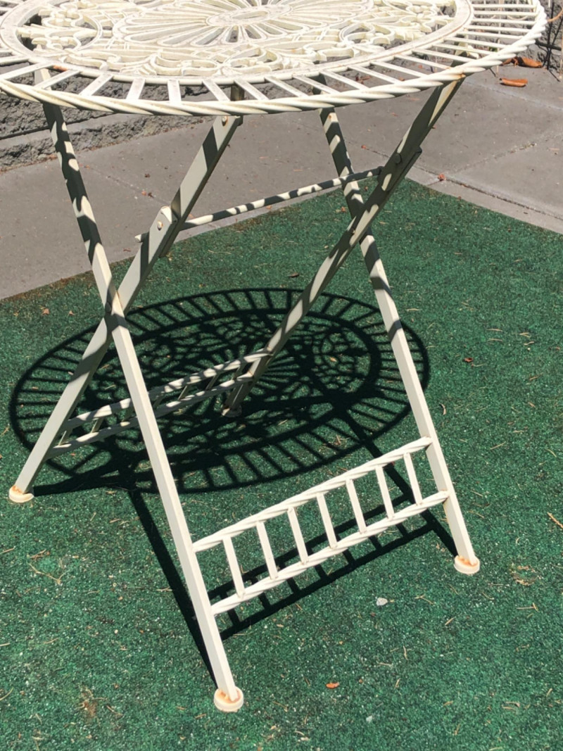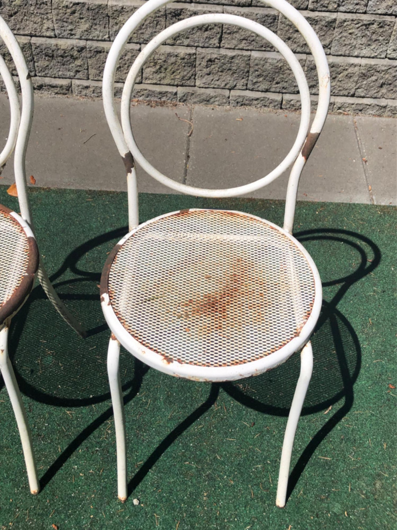Classic vintage white wrought iron bistro set, featuring a small round table and four matching chairs. Perfect for patios, porches, or garden nooks, the set offers timeless style with intricate scrollwork and sturdy craftsmanship. Includes: 1 round table: 27" high x 29" wide x 22" deep 4 matching chairs: 36" high (back), 18.5" seat height, 15.5" wide x 22" deep Details: Wrought iron construction with white finish Curved lines and decorative accents throughout Weathered patina appropriate for age with a few chairs showing significant rusting Friendly Reminder: This auction will start closing at 6:30pm on Tuesday, August 12th