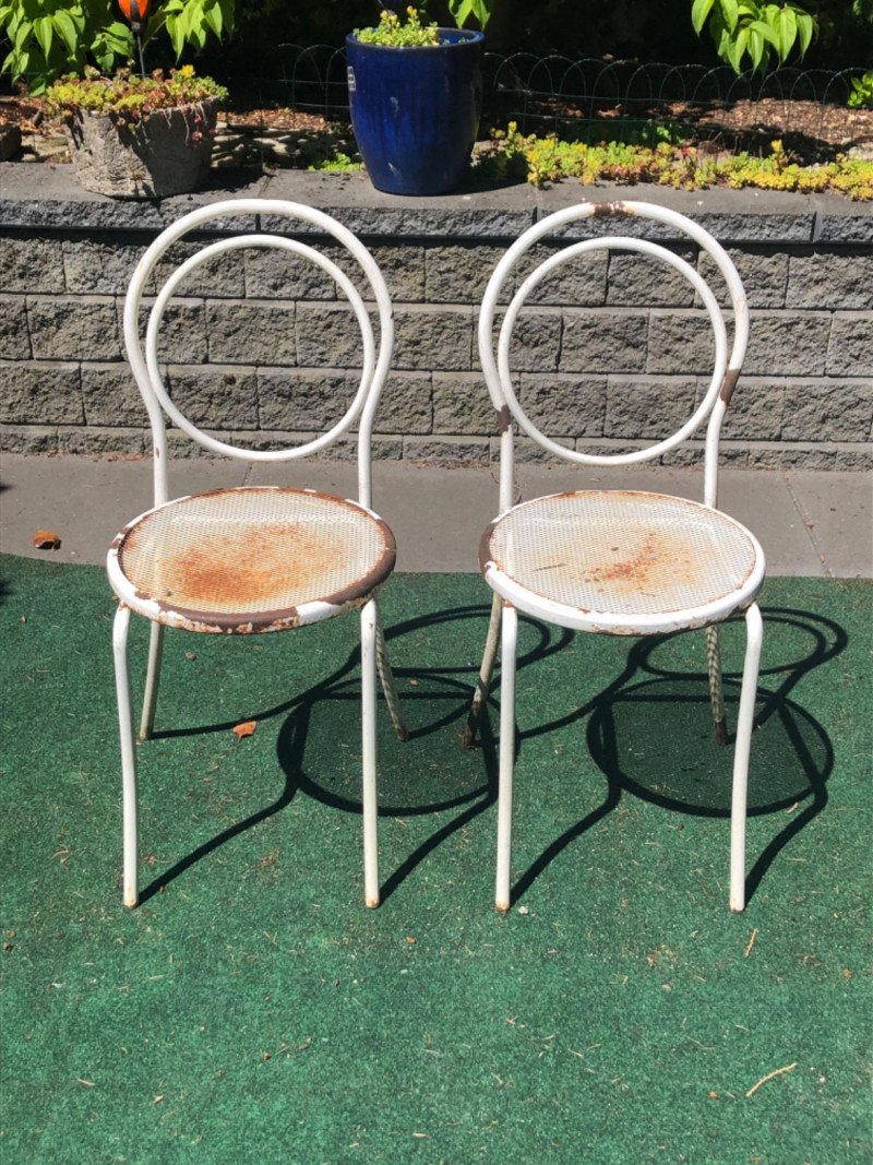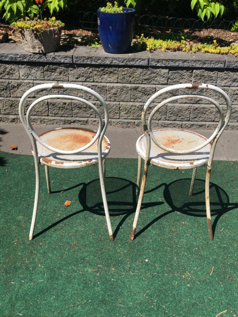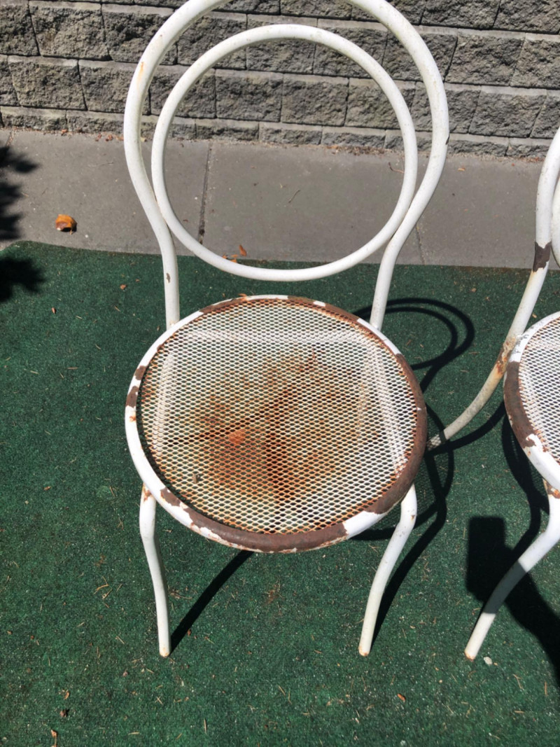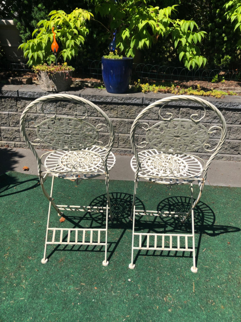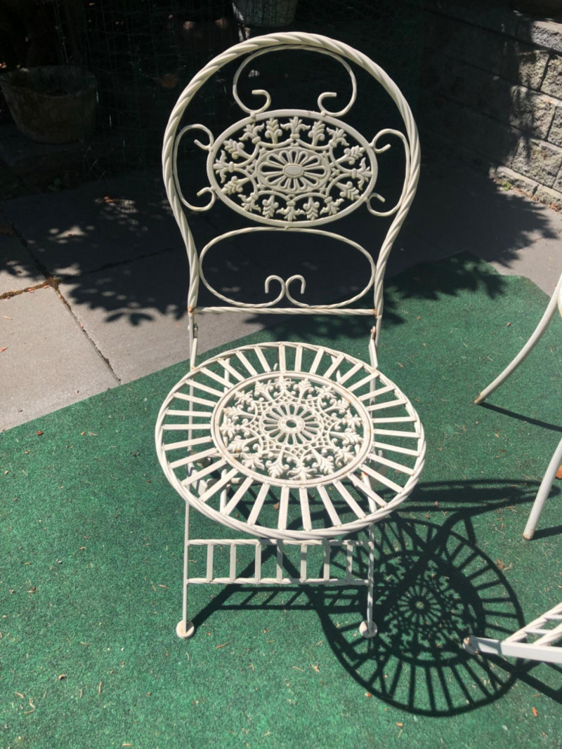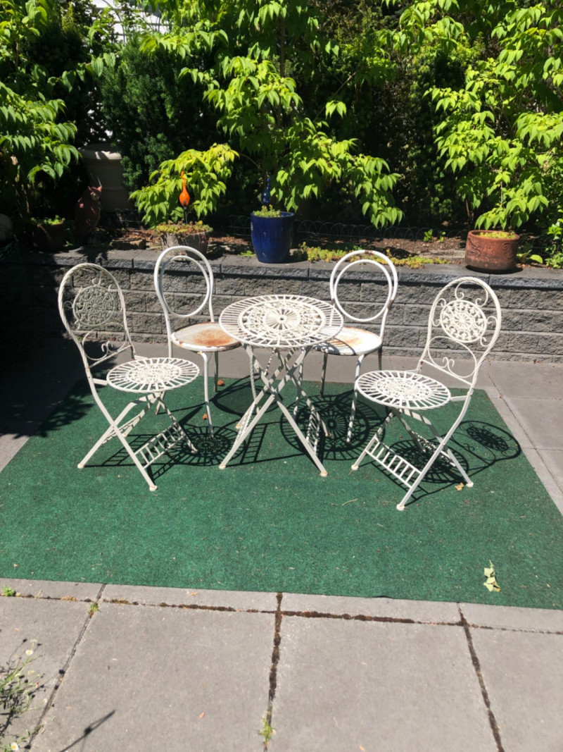 Classic vintage white wrought iron bistro set, featuring a small round table and four matching chairs. Perfect for patios, porches, or garden nooks, the set offers timeless style with intricate scrollwork and sturdy craftsmanship. Includes: 1 round table: 27" high x 29" wide x 22" deep 4 matching chairs: 36" high (back), 18.5" seat height, 15.5" wide x 22" deep Details: Wrought iron construction with white finish Curved lines and decorative accents throughout Weathered patina appropriate for age with a few chairs showing significant rusting Friendly Reminder: This auction will start closing at 6:30pm on Tuesday, August 12th