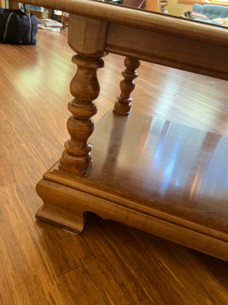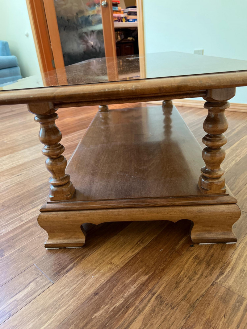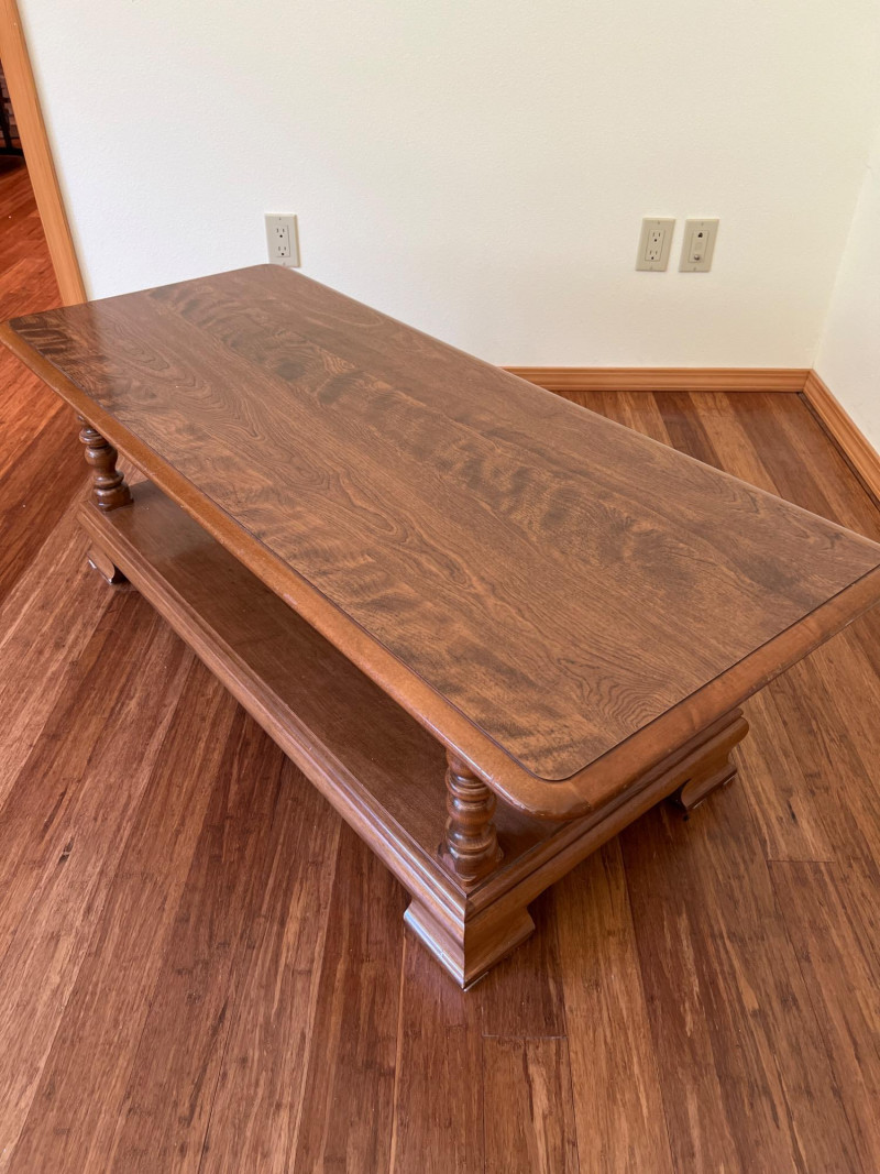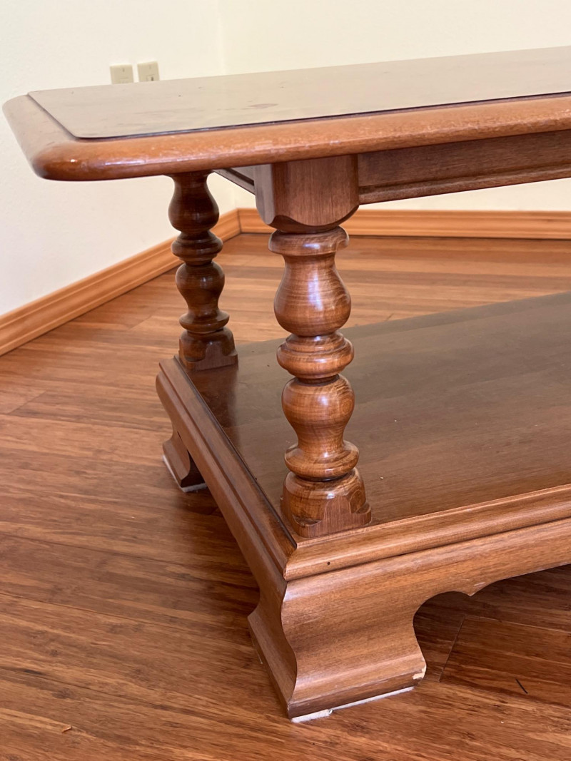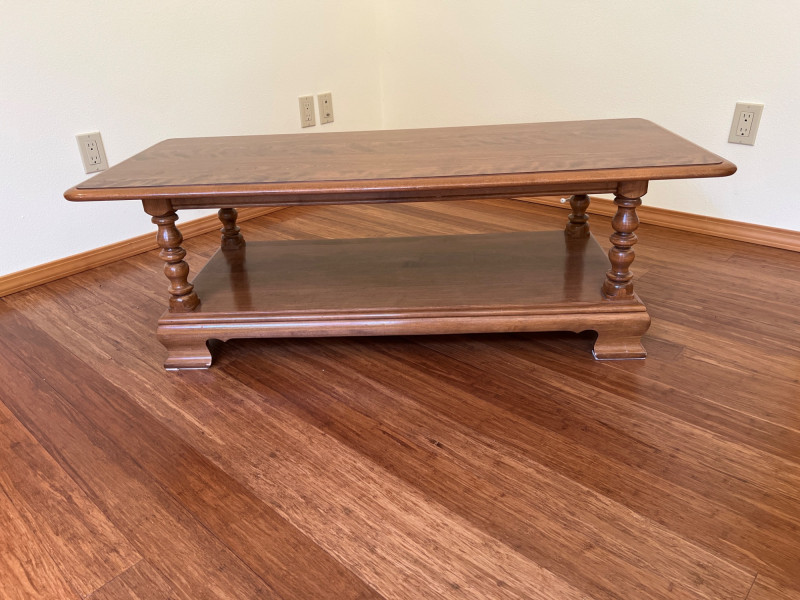 Timeless craftsmanship meets early American charm in this Ethan Allen Colonial-style coffee table, crafted from solid maple wood with a warm, nutmeg finish. The rectangular top is supported by four classic turned legs and a practical lower shelf—perfect for books, baskets, or decorative accents. Details: Maker: Ethan Allen Style: Colonial / Early American Material: Solid maple wood Finish: Nutmeg stain Features: Lower shelf, turned legs, sturdy construction A versatile piece that is ideal for living rooms, dens, or cozy reading nooks, or for a SMART TV stand. Bidding on this lot is an agreement that: (1.) You will have 2 capable, able-bodied persons to lift and load at a minimum. (2.) You