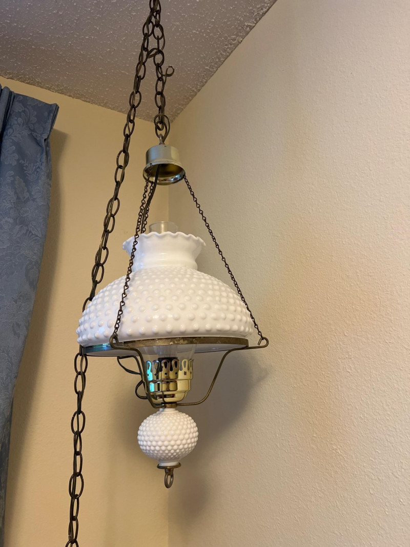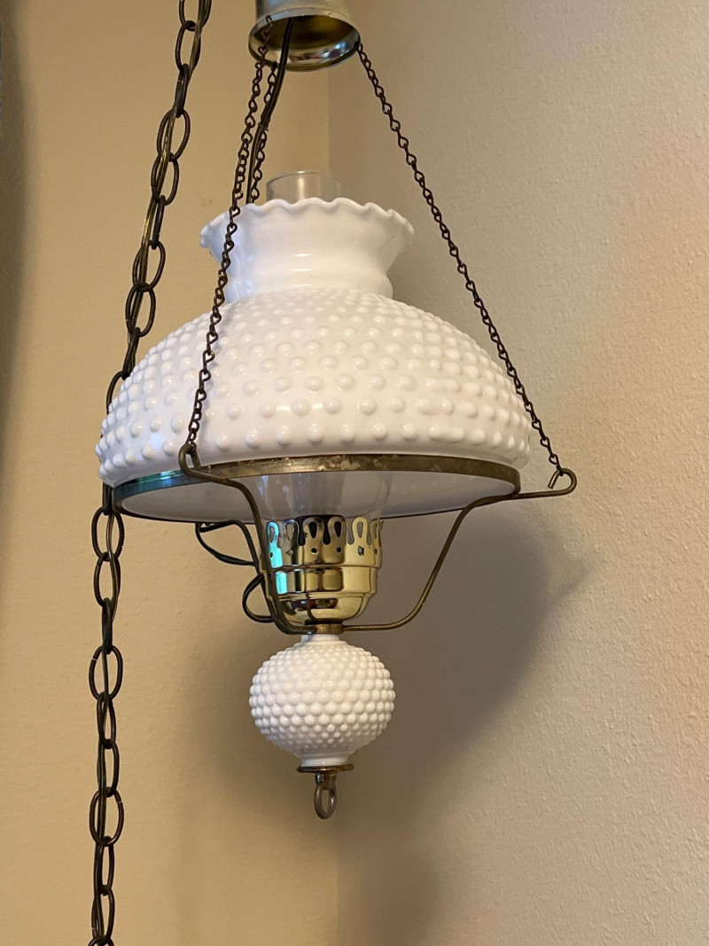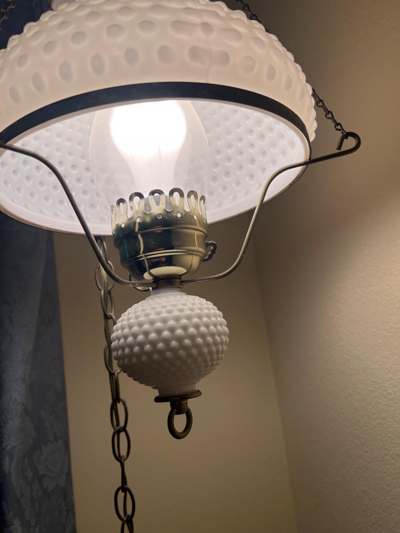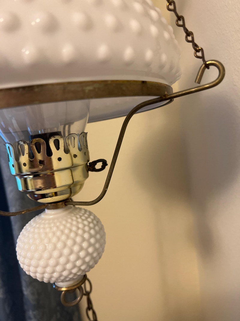 Vintage hanging lantern featuring a white hobnail milk glass shade with matching lower finial, suspended from a 92" chain with extended cord for plug-in use. The brass-tone fittings and internal glass chimney evoke classic parlor lamp styling, while the electric conversion offers modern convenience. Details: Era: Mid-century (circa 1950s–1960s) Material: Hobnail milk glass, brass-tone metal, glass chimney Chain length: 92" + extended cord Function: Electric plug-in; tested and working A timeless accent for entryways, reading nooks, or vintage-inspired interiors—this piece blends nostalgic charm with practical illumination. Friendly Reminder: This auction will start closing at 6:30pm on Tuesday, August 12th