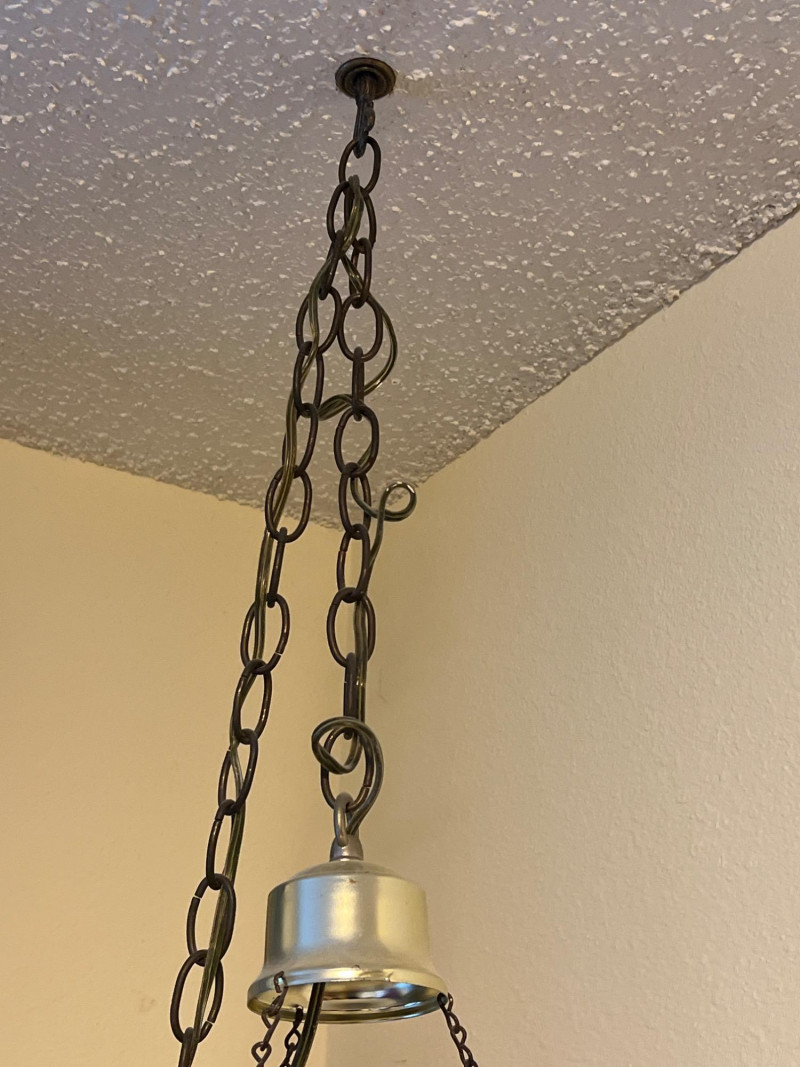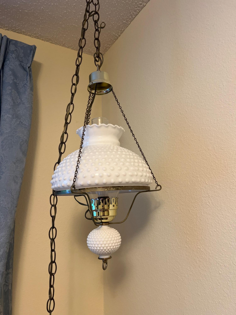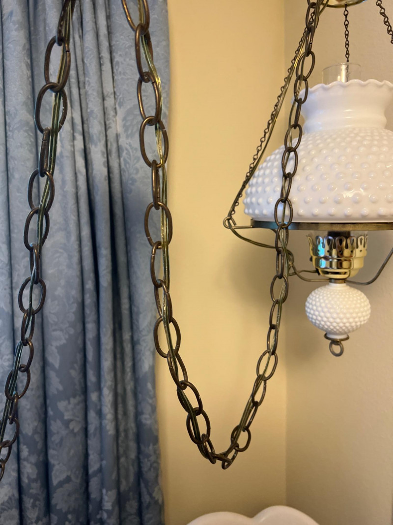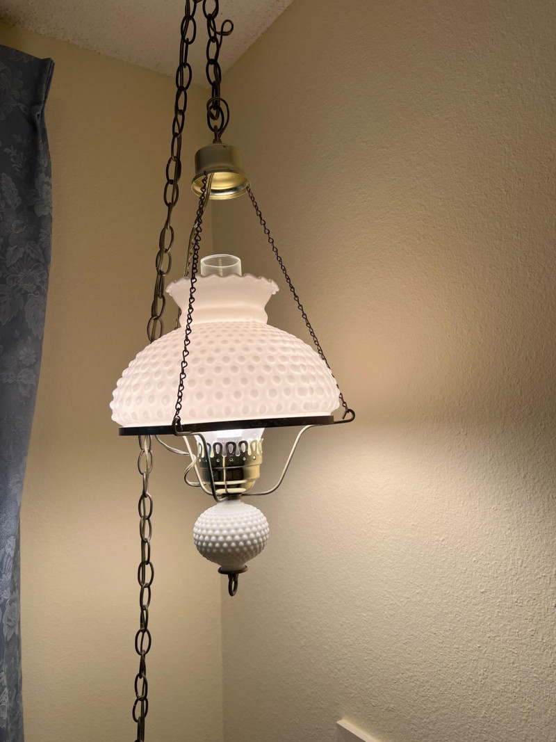 Vintage hanging lantern featuring a white hobnail milk glass shade with matching lower finial, suspended from a 92" chain with extended cord for plug-in use. The brass-tone fittings and internal glass chimney evoke classic parlor lamp styling, while the electric conversion offers modern convenience. Details: Era: Mid-century (circa 1950s–1960s) Material: Hobnail milk glass, brass-tone metal, glass chimney Chain length: 92" + extended cord Function: Electric plug-in; tested and working A timeless accent for entryways, reading nooks, or vintage-inspired interiors—this piece blends nostalgic charm with practical illumination. Friendly Reminder: This auction will start closing at 6:30pm on Tuesday, August 12th