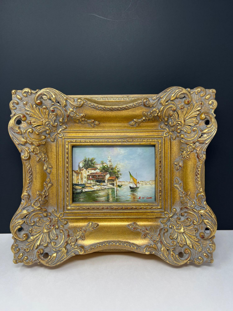 Elegant fine art by E.W. Cook presented in an ornate gold gilt frame. Rich color palette and detailed composition bring sophistication to any room. Medium: Acrylic or oil (see photo) Size: 7 inches x 5 inches Frame: Ornate gold gilt with scrolling corners Collectible value: Signature visible, frame intact Friendly Reminder: This auction will start closing at 6:30pm on Tuesday, August 12th