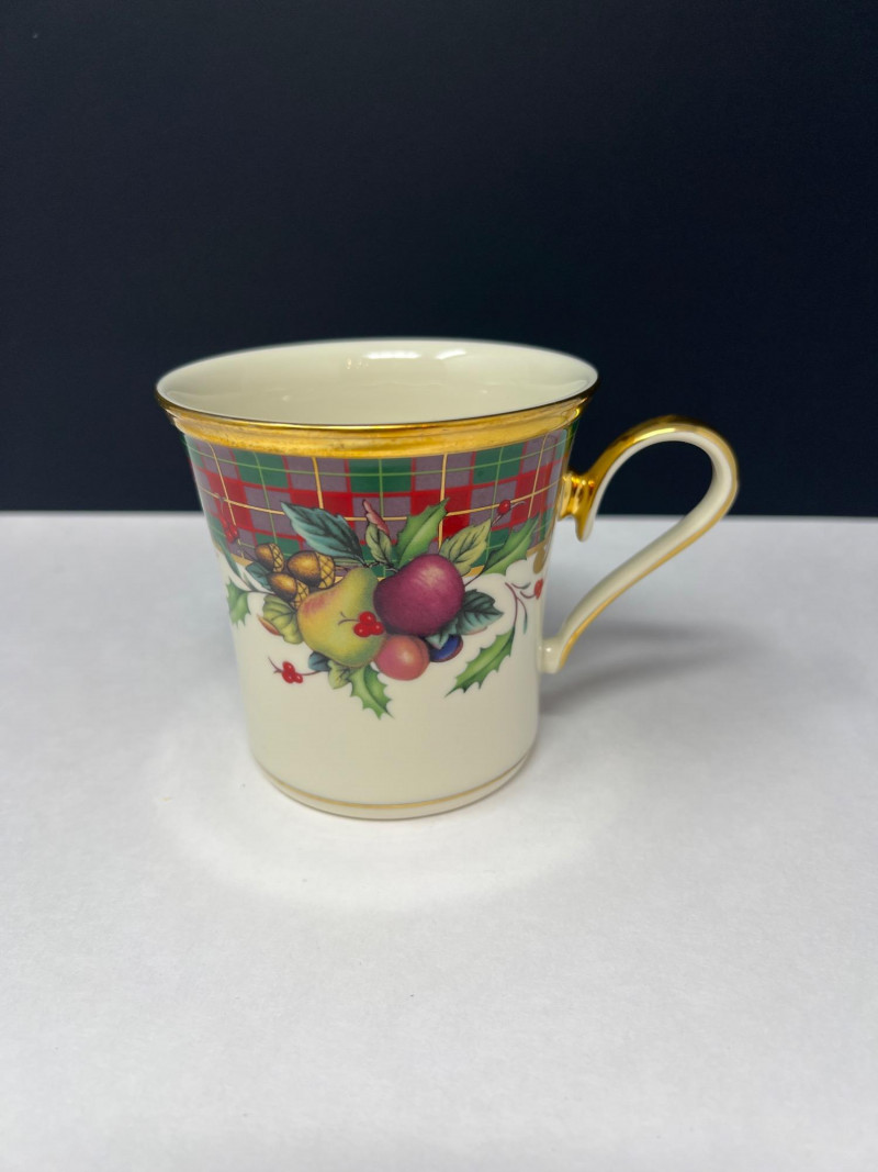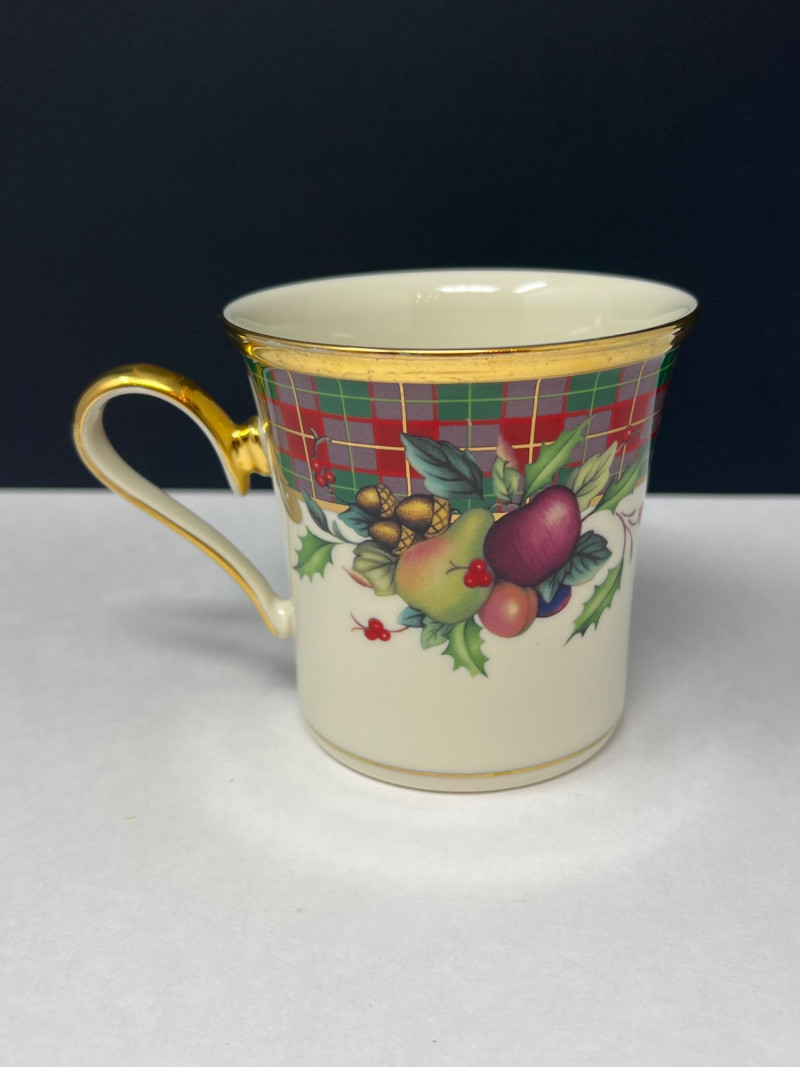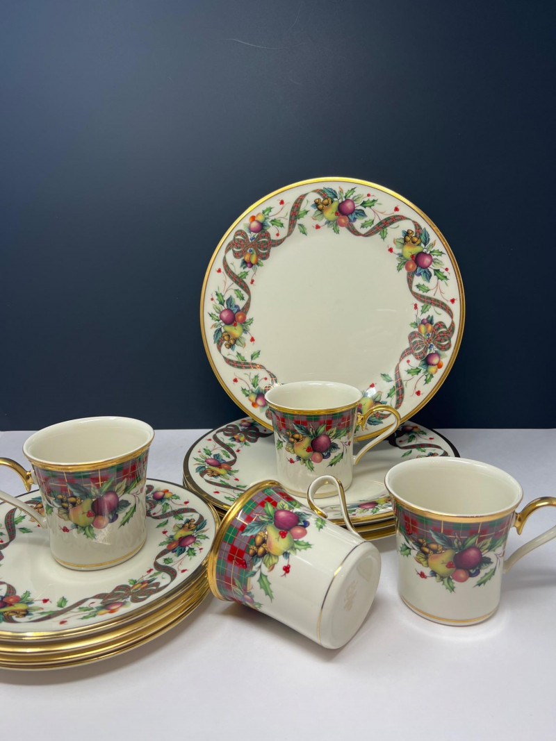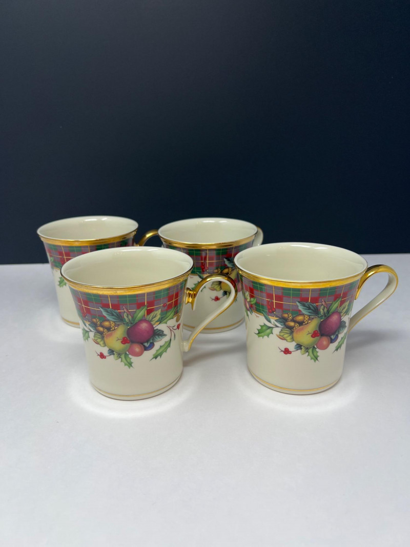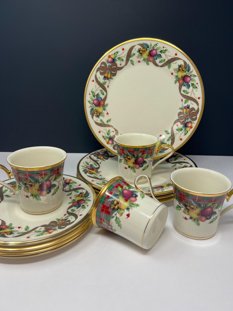 This complete Lenox Holiday Tartan pattern set includes service for four, featuring classic plates, salad plates and matching handled mugs. Adorned with festive fruit, leaves, and ribbons in a rich red and green tartan motif, accented by graceful 24-karat gold trim—a hallmark of Lenox’s renowned craftsmanship. Included Pieces: 4 Dinner Plates 4 Salad Plates 4 Handled Mugs Design Details: Pattern: Holiday Tartan Finish: Gold-rimmed edges with plaid border and botanical centerpiece Maker: Lenox, fine porcelain Friendly Reminder: This auction will start closing at 6:30pm on Tuesday, August 12th
