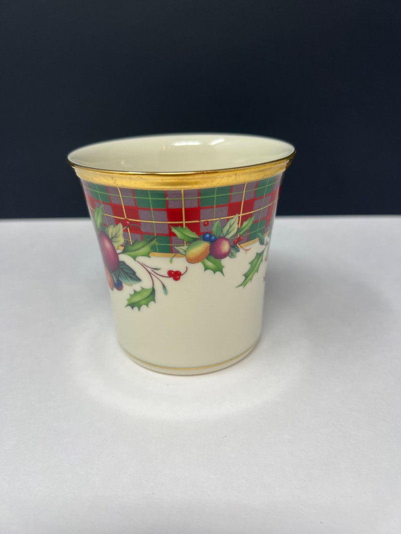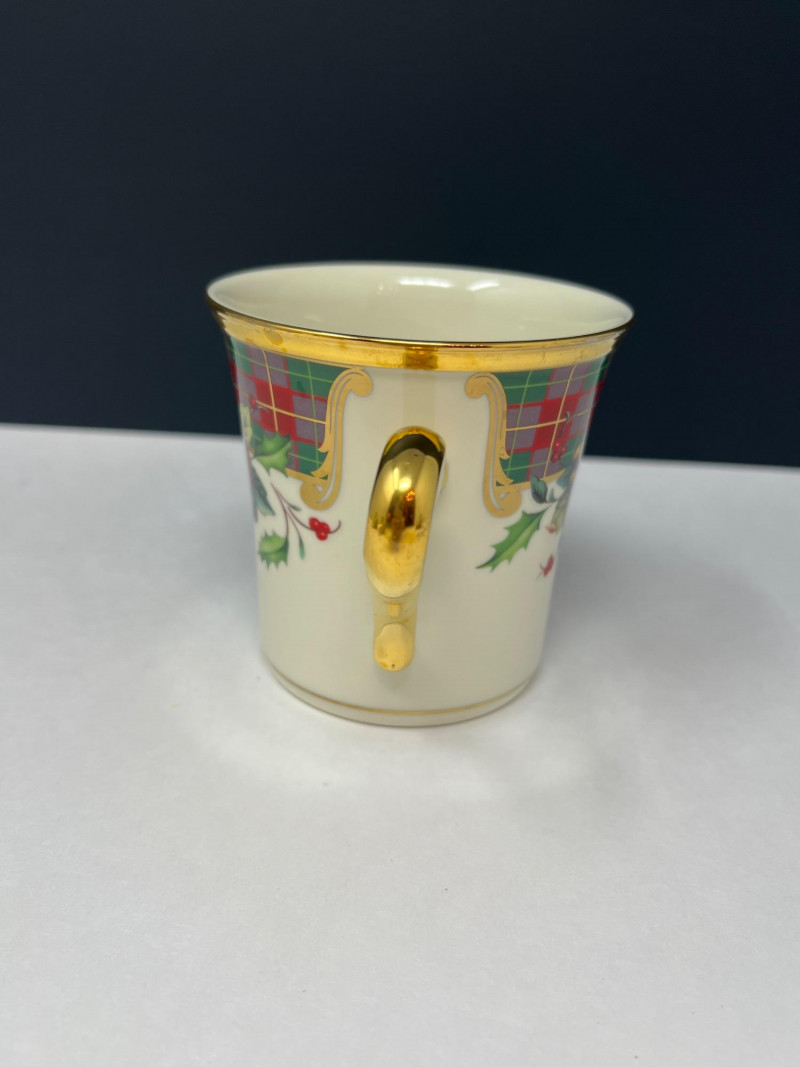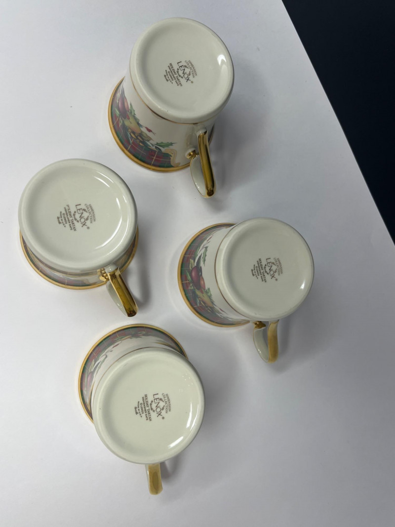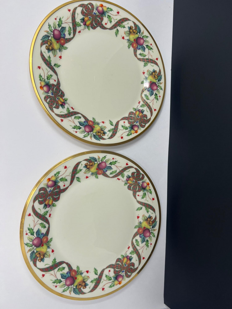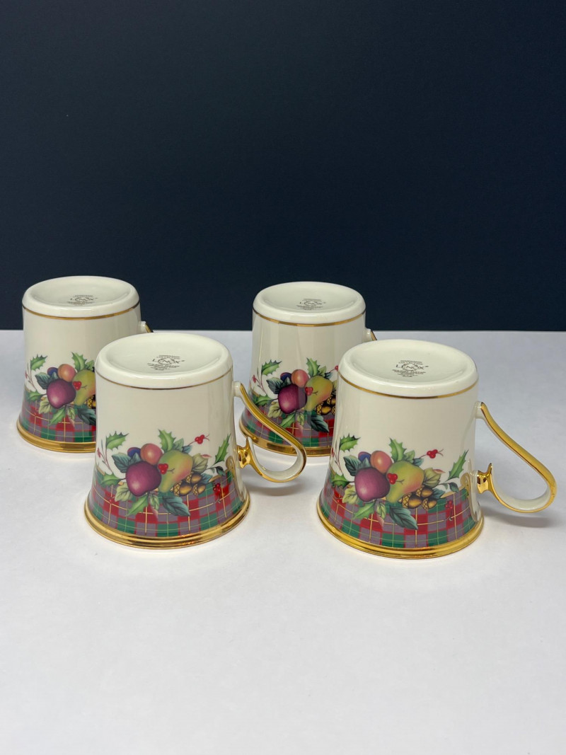 This complete Lenox Holiday Tartan pattern set includes service for four, featuring classic plates, salad plates and matching handled mugs. Adorned with festive fruit, leaves, and ribbons in a rich red and green tartan motif, accented by graceful 24-karat gold trim—a hallmark of Lenox’s renowned craftsmanship. Included Pieces: 4 Dinner Plates 4 Salad Plates 4 Handled Mugs Design Details: Pattern: Holiday Tartan Finish: Gold-rimmed edges with plaid border and botanical centerpiece Maker: Lenox, fine porcelain Friendly Reminder: This auction will start closing at 6:30pm on Tuesday, August 12th