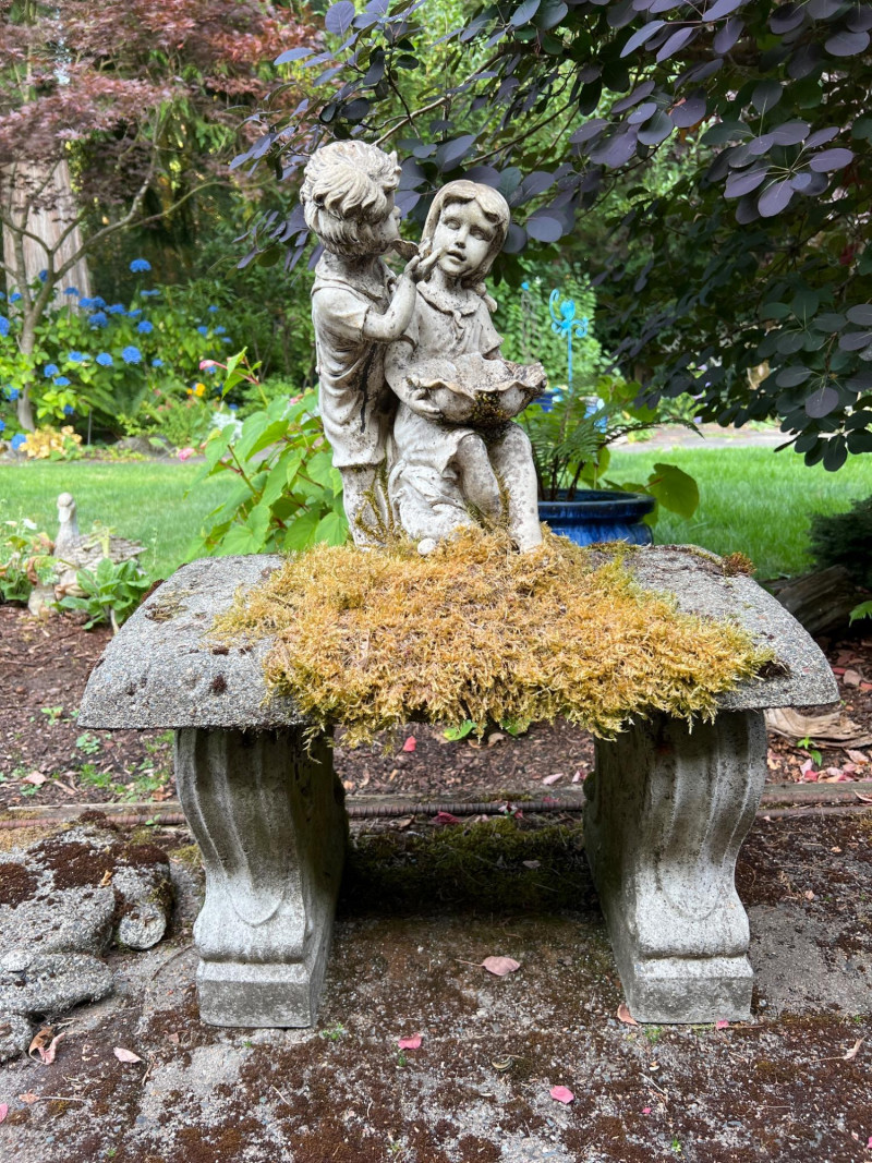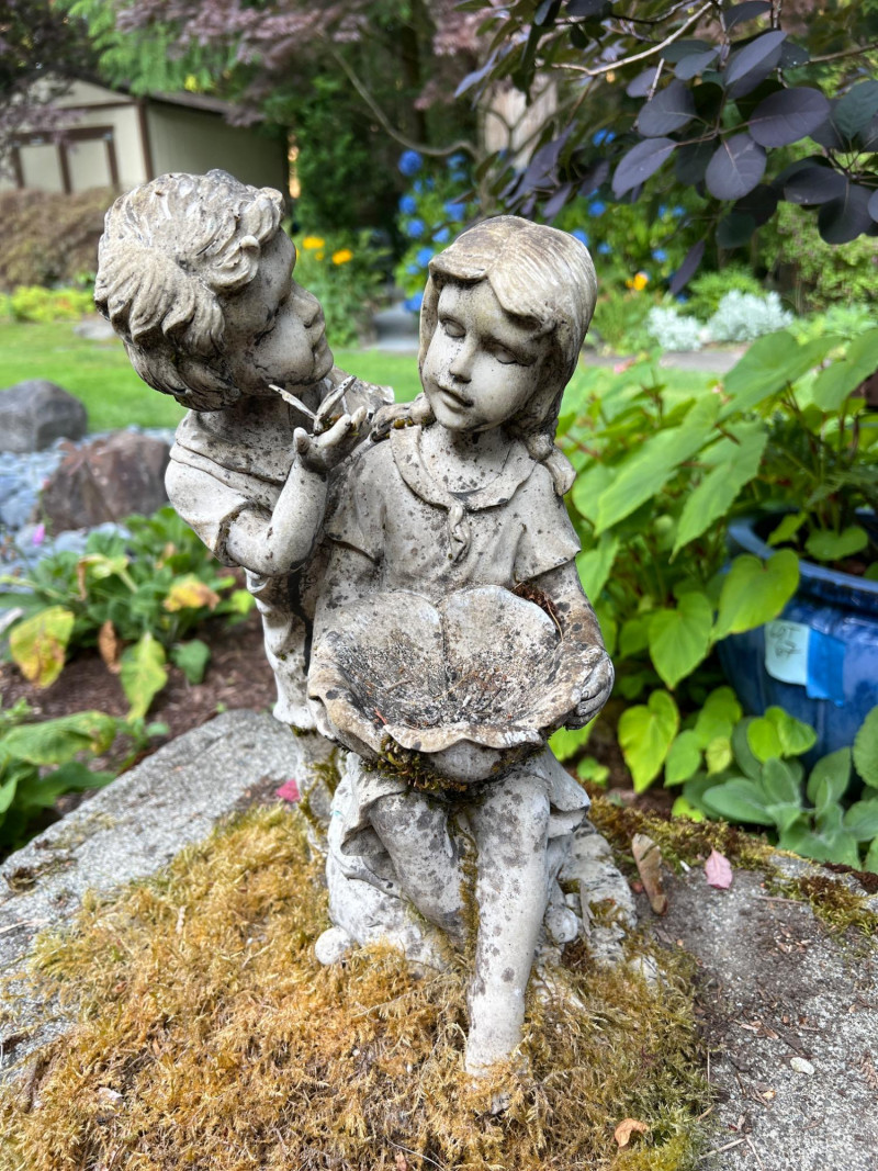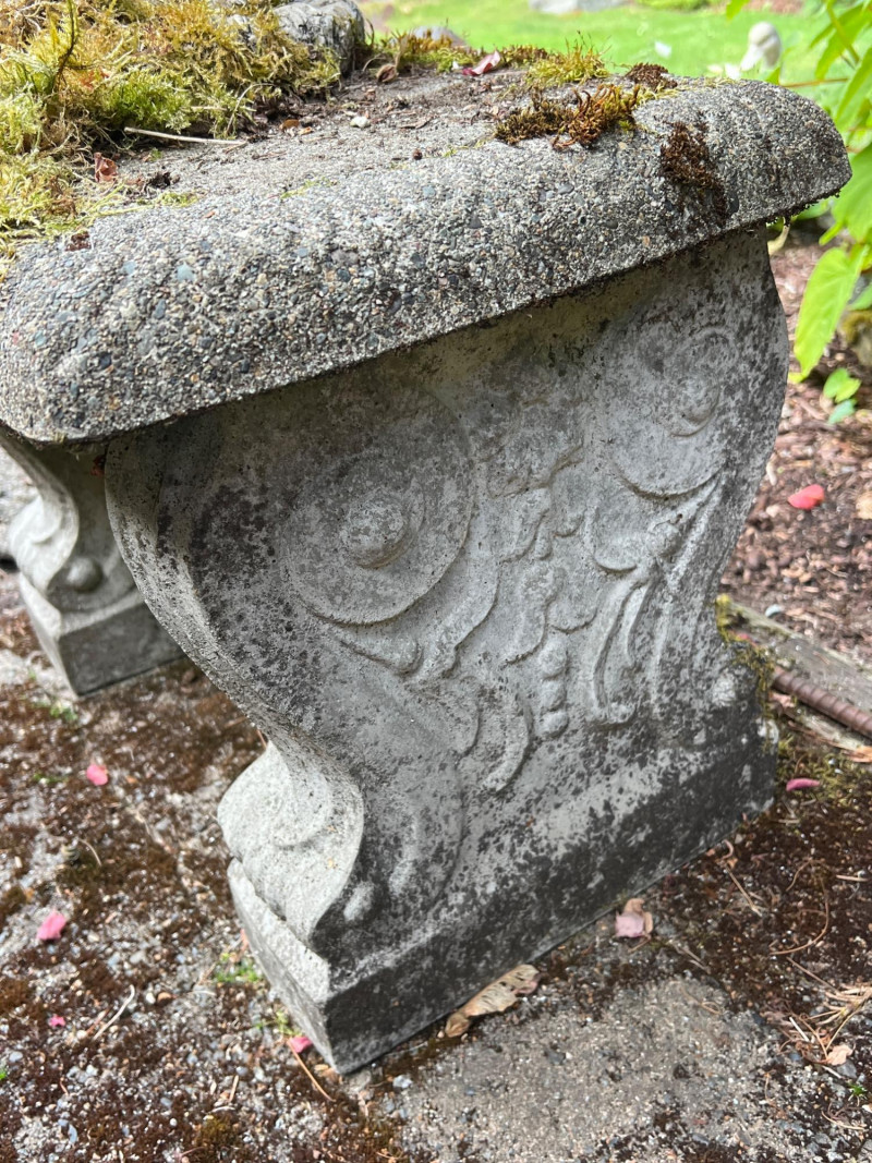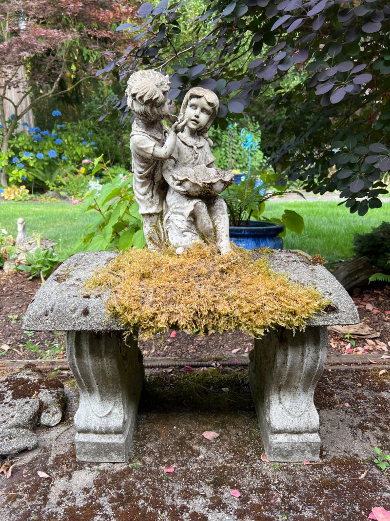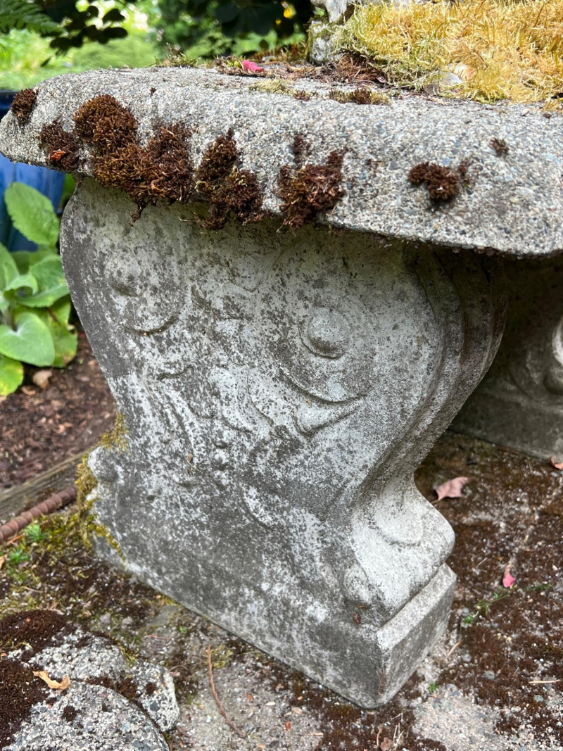 This bench represents timeless charm with this vintage concrete bench that is paired with a weathered statue of a boy and girl holding a bowl to feed the birds (16 inches height by 7 inches wide by 8 inches deep). The statue features soft detailing and a gentle patina from outdoor exposure, adding character and nostalgic appeal. The bench itself is moss-kissed and sturdy, making it perfect for both decorative use and quiet moments of reflection in the garden. Ideal for cottage gardens, landscaped paths, or shaded corners. Friendly Reminder: This auction will start closing at 6:30pm on Tuesday, August 12th