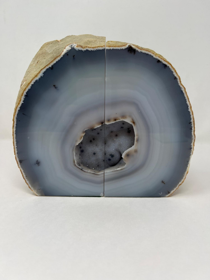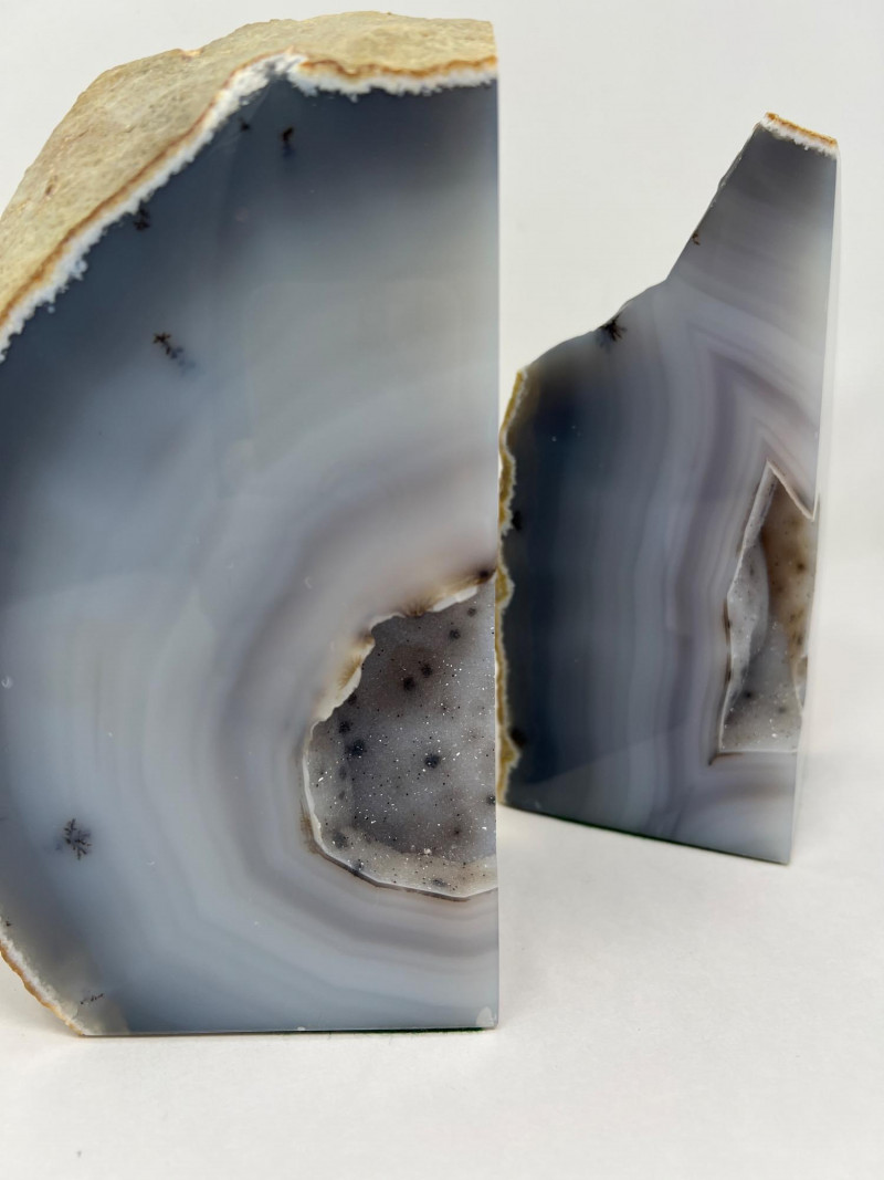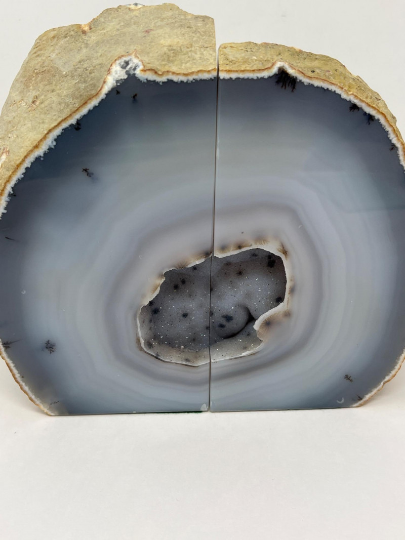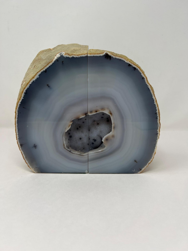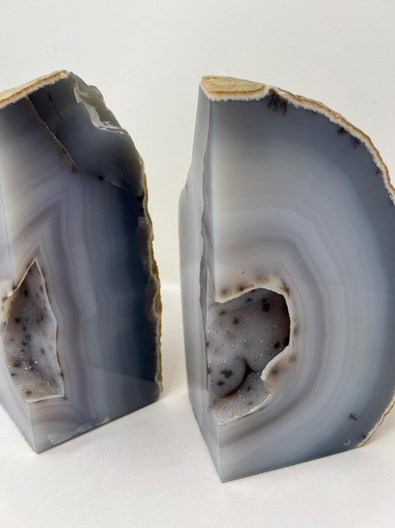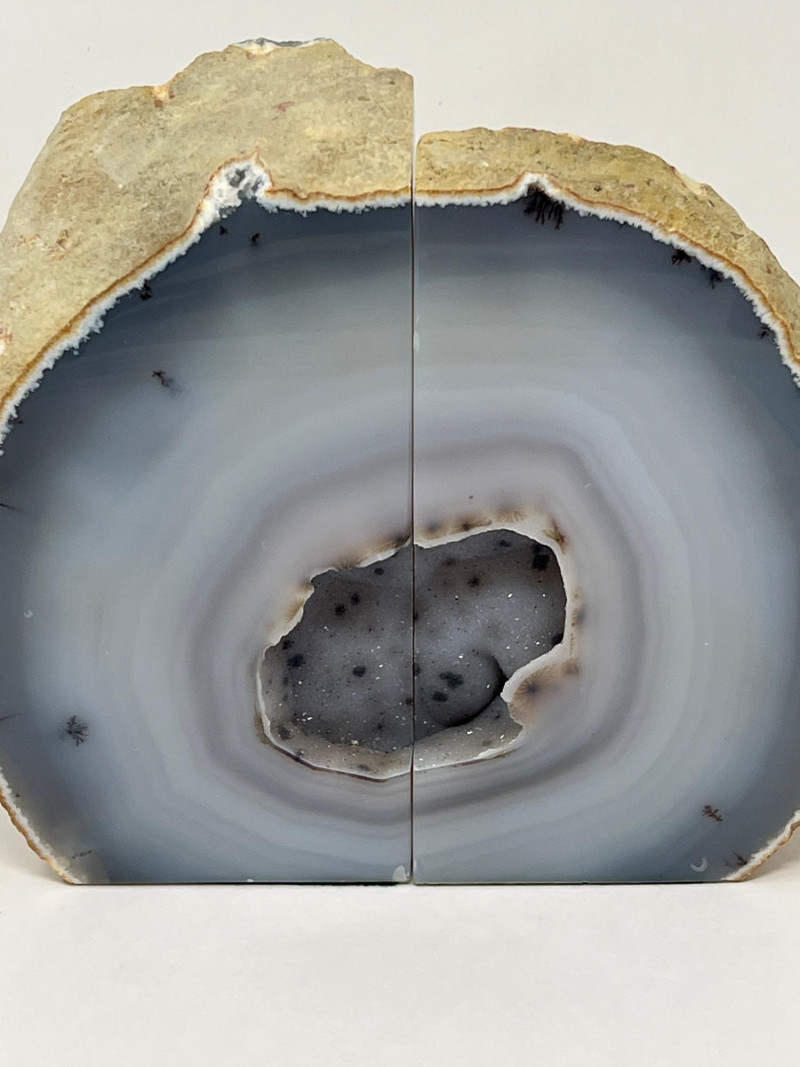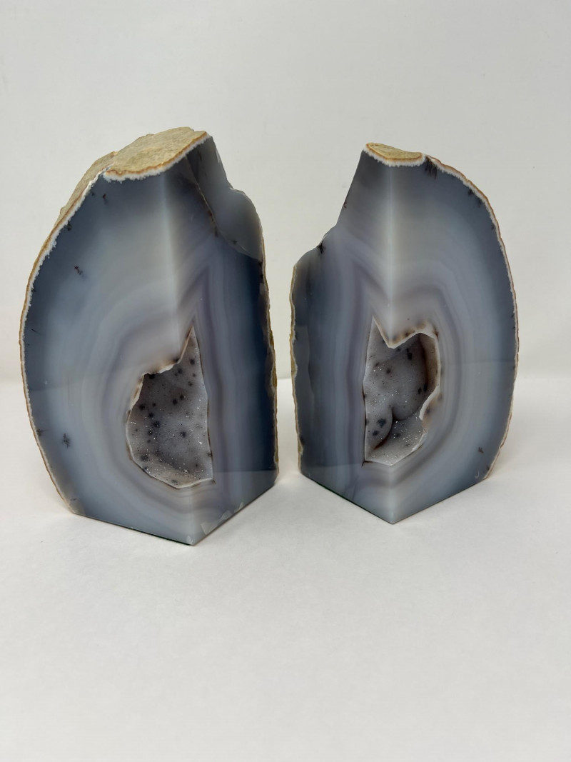 Natural agate geode bookends measuring approximately 8 inches tall, expertly cut and polished to reveal intricate concentric banding and a sparkling crystal interior. The matched halves display symmetrical patterns in soft gray and white tones, with rough-textured exteriors that contrast beautifully with the refined inner cavity. Ideal for use as functional bookends or decorative accents, these pieces blend geological elegance with organic charm. A striking addition to any shelf, study, or collector’s cabinet. Friendly Reminder: This auction will start closing at 6:30pm on Tuesday, August 12th