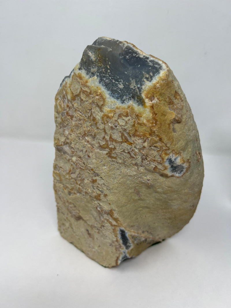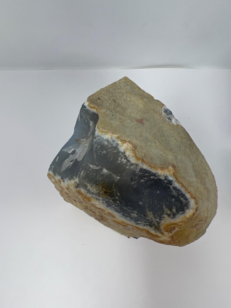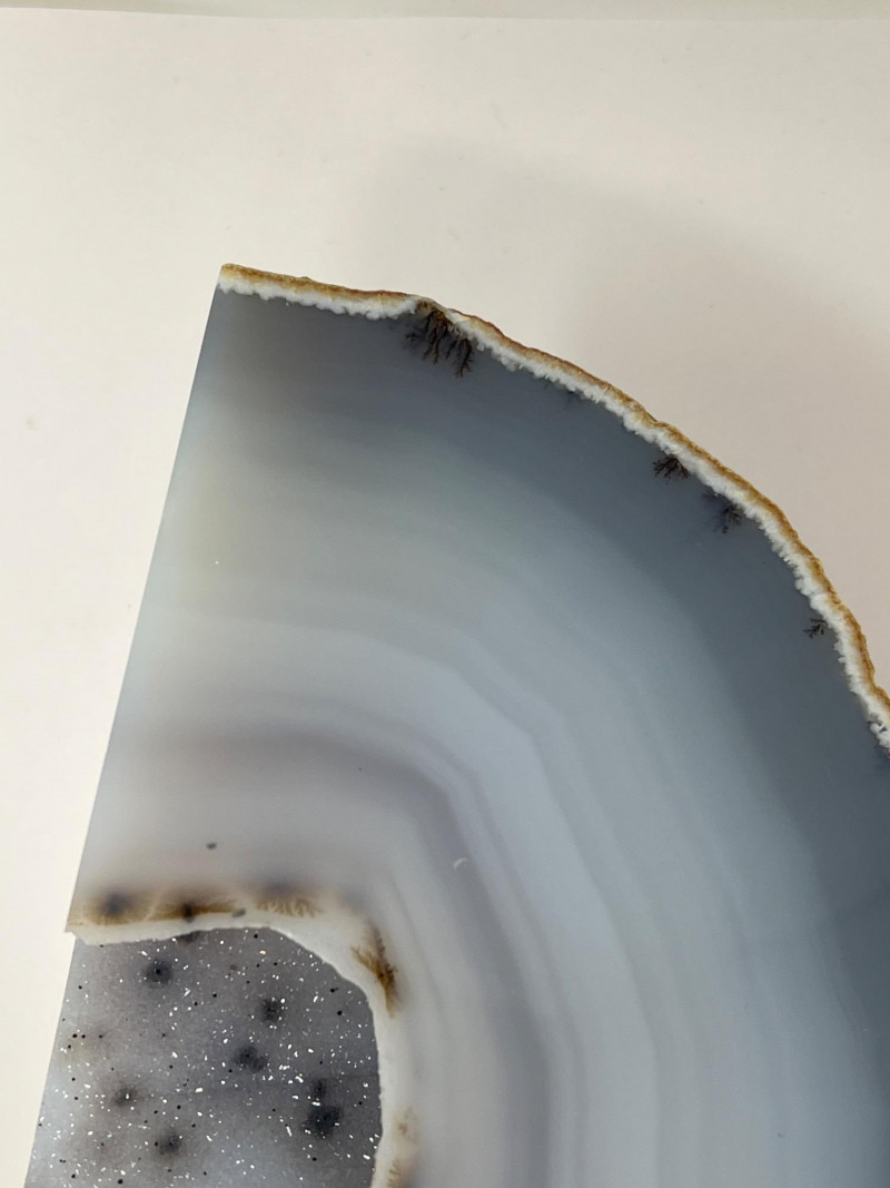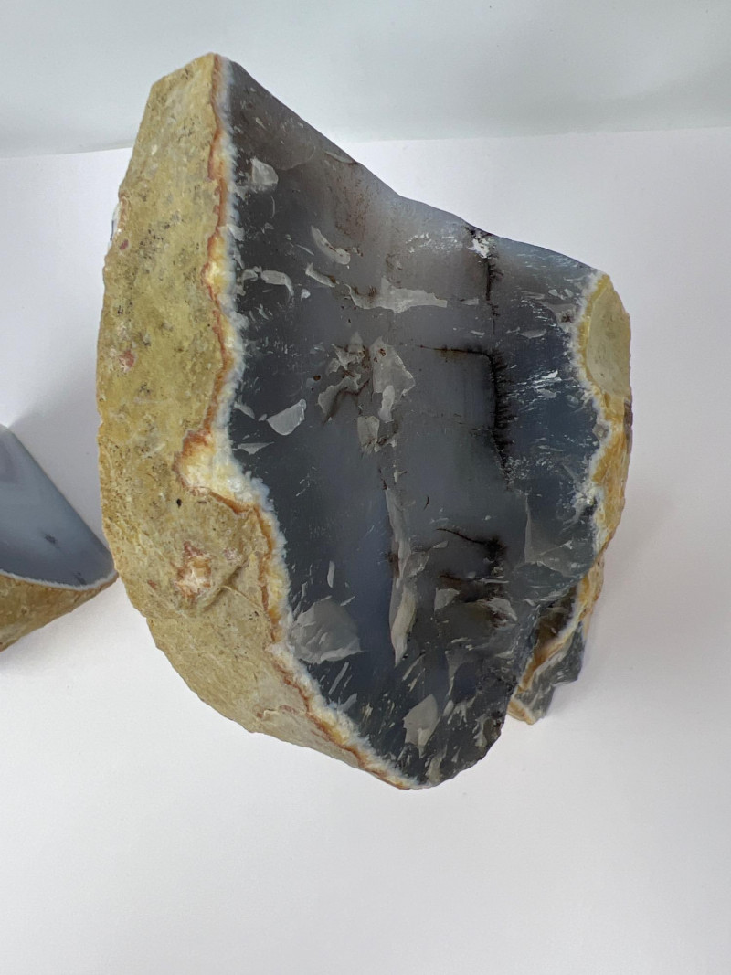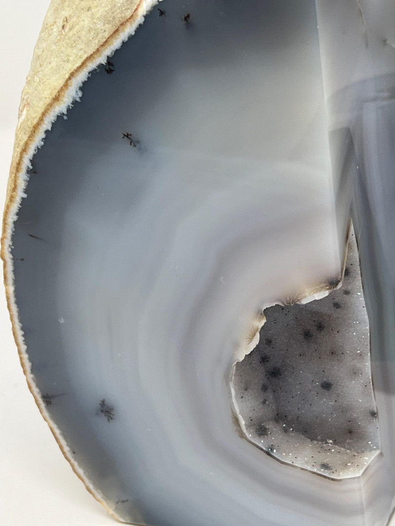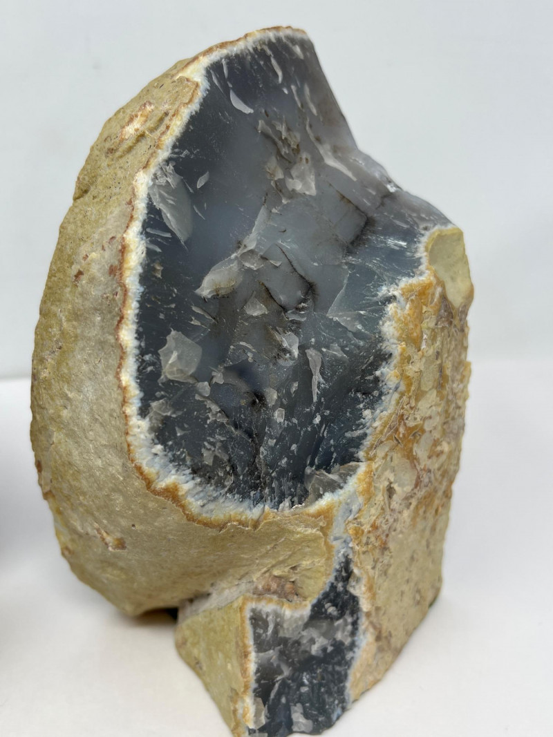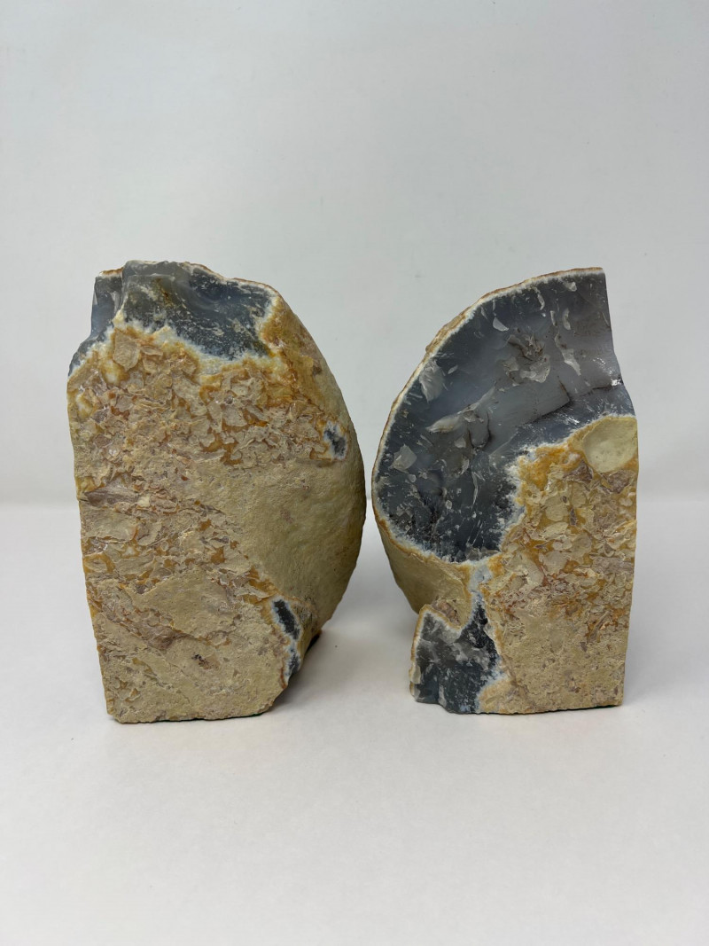 Natural agate geode bookends measuring approximately 8 inches tall, expertly cut and polished to reveal intricate concentric banding and a sparkling crystal interior. The matched halves display symmetrical patterns in soft gray and white tones, with rough-textured exteriors that contrast beautifully with the refined inner cavity. Ideal for use as functional bookends or decorative accents, these pieces blend geological elegance with organic charm. A striking addition to any shelf, study, or collector’s cabinet. Friendly Reminder: This auction will start closing at 6:30pm on Tuesday, August 12th