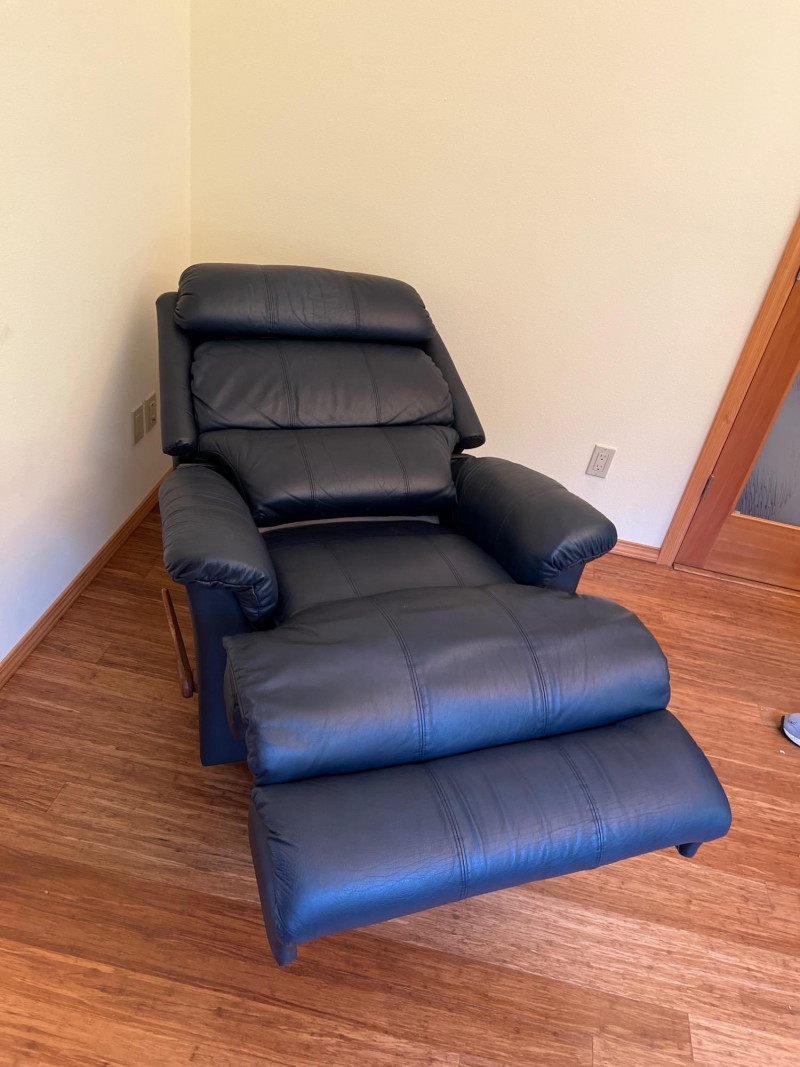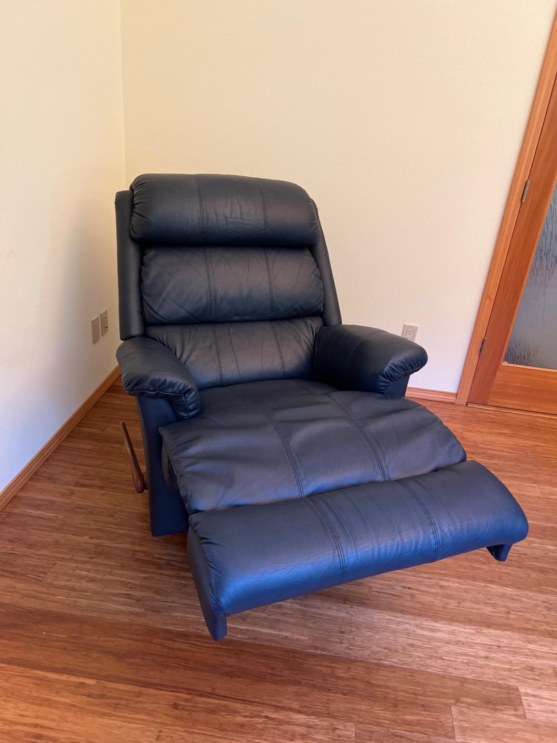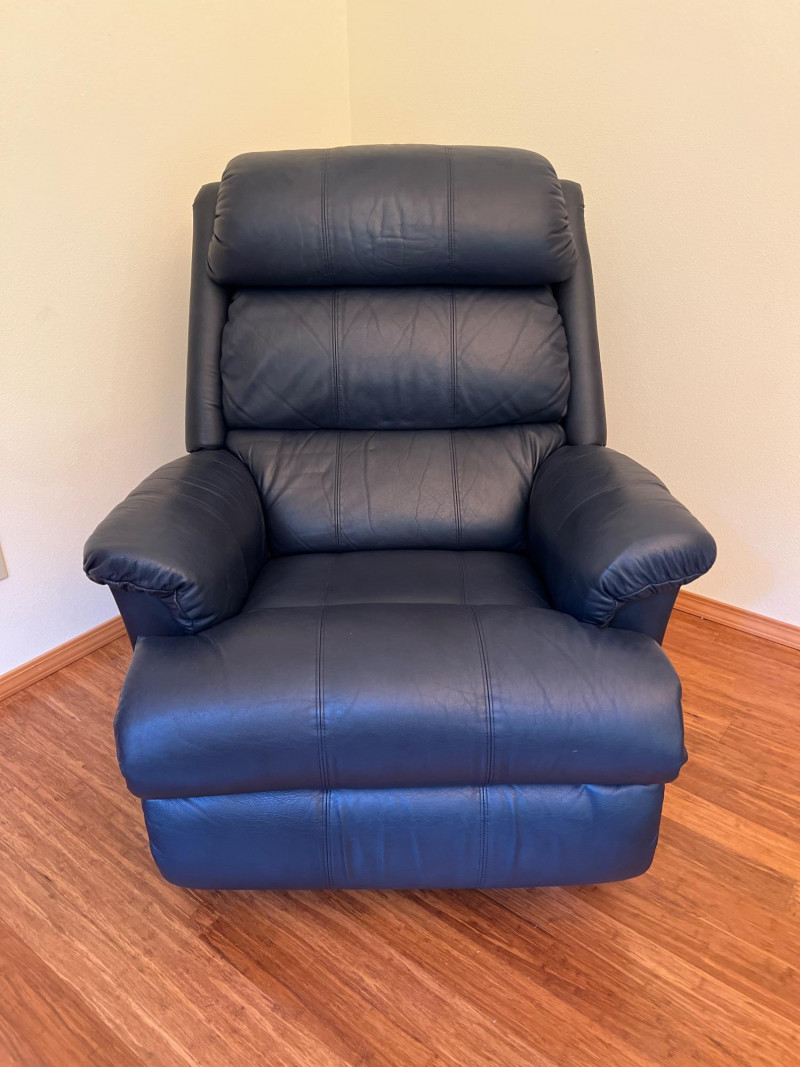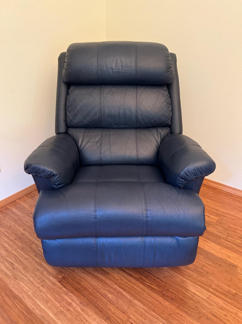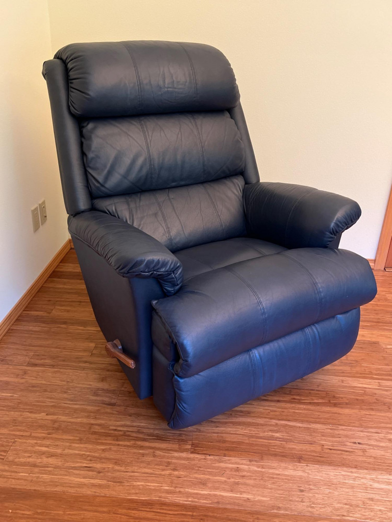 Relax in timeless comfort with this La-Z-Boy Reclina-Rocker Easy Chair, style 010660, upholstered in a smooth manmade vinyl with a handsome navy hue. Designed with plush cushioning, a tiered high backrest with built-in head support, and generously padded armrests, it blends style and comfort for any living space. The manual reclining function pairs with gentle rocking motion for versatile relaxation and extended leg support. Note: Manufacturer tag indicates vinyl or synthetic upholstery material. More information on La-Z-Boy materials can be found here. Bidding on this lot is an agreement that: (1.) You will have 2 capable, able-bodied persons to lift and load at a minimum. (2.) You