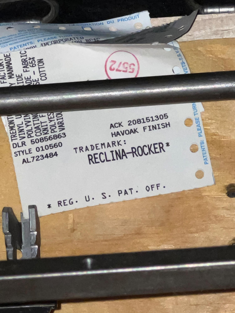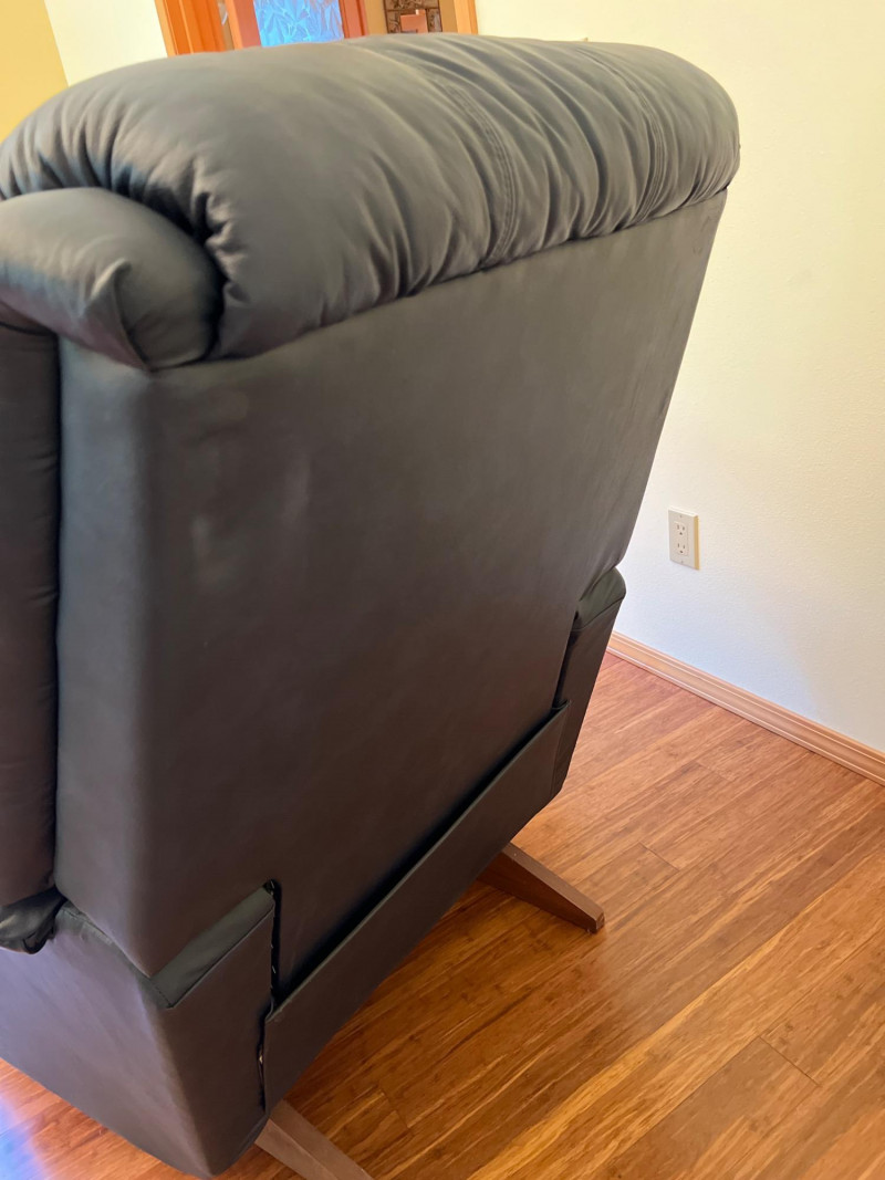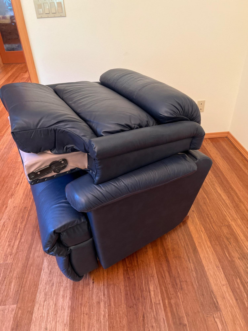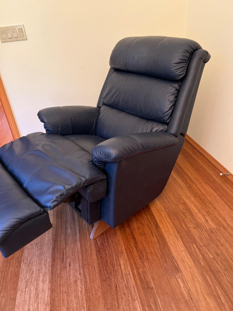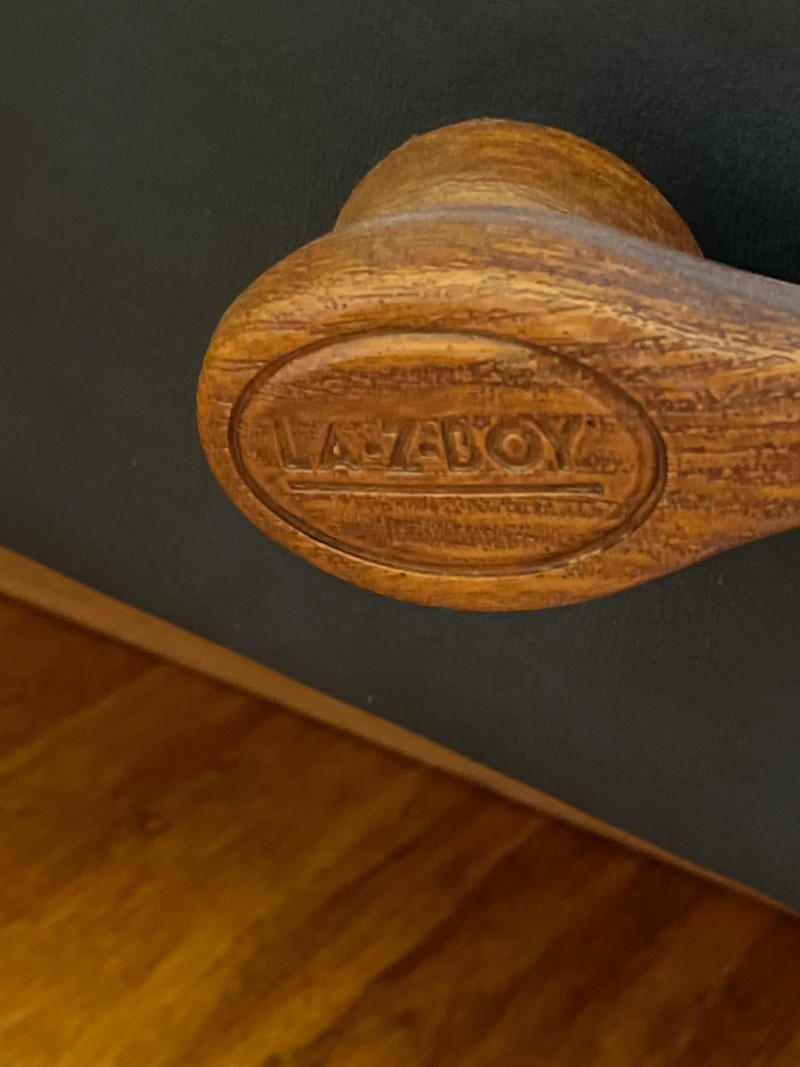 Relax in timeless comfort with this La-Z-Boy Reclina-Rocker Easy Chair, style 010660, upholstered in a smooth manmade vinyl with a handsome navy hue. Designed with plush cushioning, a tiered high backrest with built-in head support, and generously padded armrests, it blends style and comfort for any living space. The manual reclining function pairs with gentle rocking motion for versatile relaxation and extended leg support. Note: Manufacturer tag indicates vinyl or synthetic upholstery material. More information on La-Z-Boy materials can be found here. Bidding on this lot is an agreement that: (1.) You will have 2 capable, able-bodied persons to lift and load at a minimum. (2.) You
