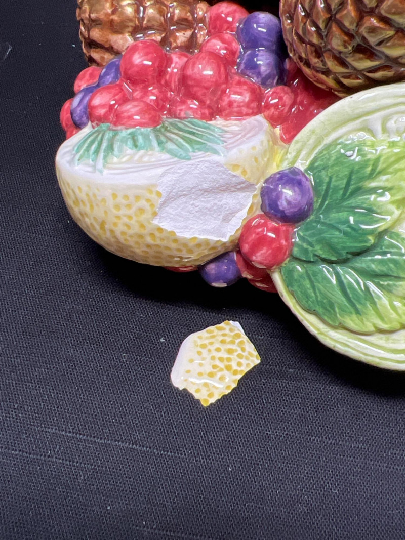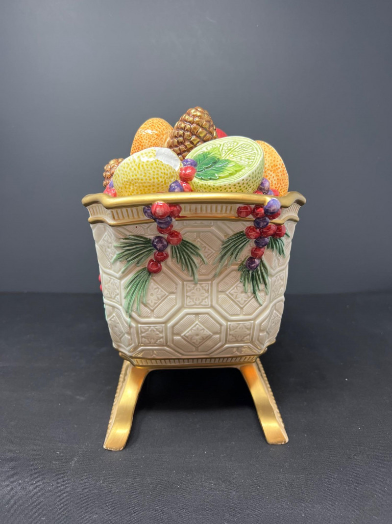 Celebrate the charm of the holiday season with this Fitz and Floyd “Winter Spice” sleigh-shaped cookie jar. Richly detailed with festive motifs and classic colors, this collectible ceramic jar captures winter cheer in every curve. A timeless piece for holiday entertaining or display, crafted by one of the most respected names in seasonal ceramics. Cookie jar is considered a rare discontinued ceramic collectible with only a few made. Note pictures that show two chipped areas with ceramic pieces that have been conserved for repair. Flaws do not hinder function. Friendly Reminder: This auction will start closing at 6:30pm on Tuesday, August 12th
