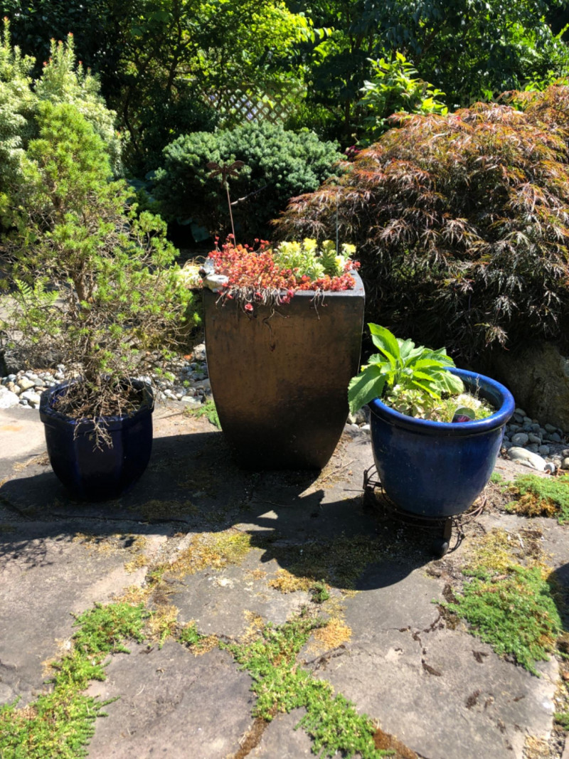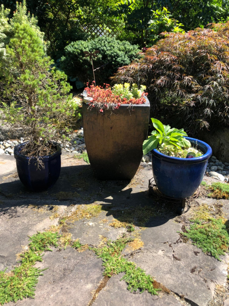 Lot # 60 - Outdoor Planter Trio - Two Ceramic, One Large Metal Planter & Plants