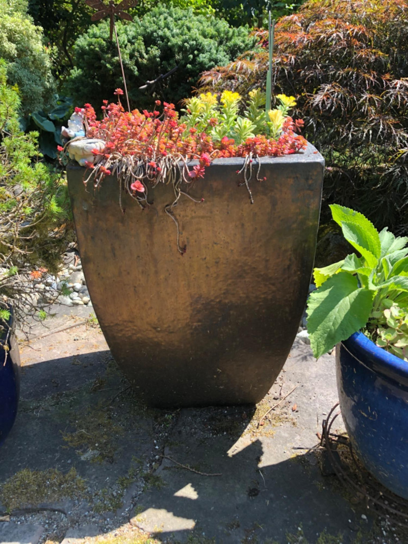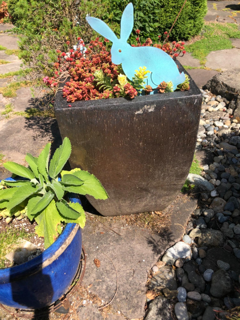 Versatile garden accent lot featuring two stylish ceramic planters and one spacious metal planter, each with established greenery. Perfect for patios, balconies, or indoor spaces. Easy to relocate and maintain, these planters offer a pop of texture and life to any landscape. Bunny metal art also included. Blue Ceramic Planter Dimensions: 11" high x 14" wide 12" high x 13" wide Metal Planter Dimensions: 23.5" high x 18" wide Friendly Reminder: This auction will start closing at 6:30pm on Tuesday, August 12th