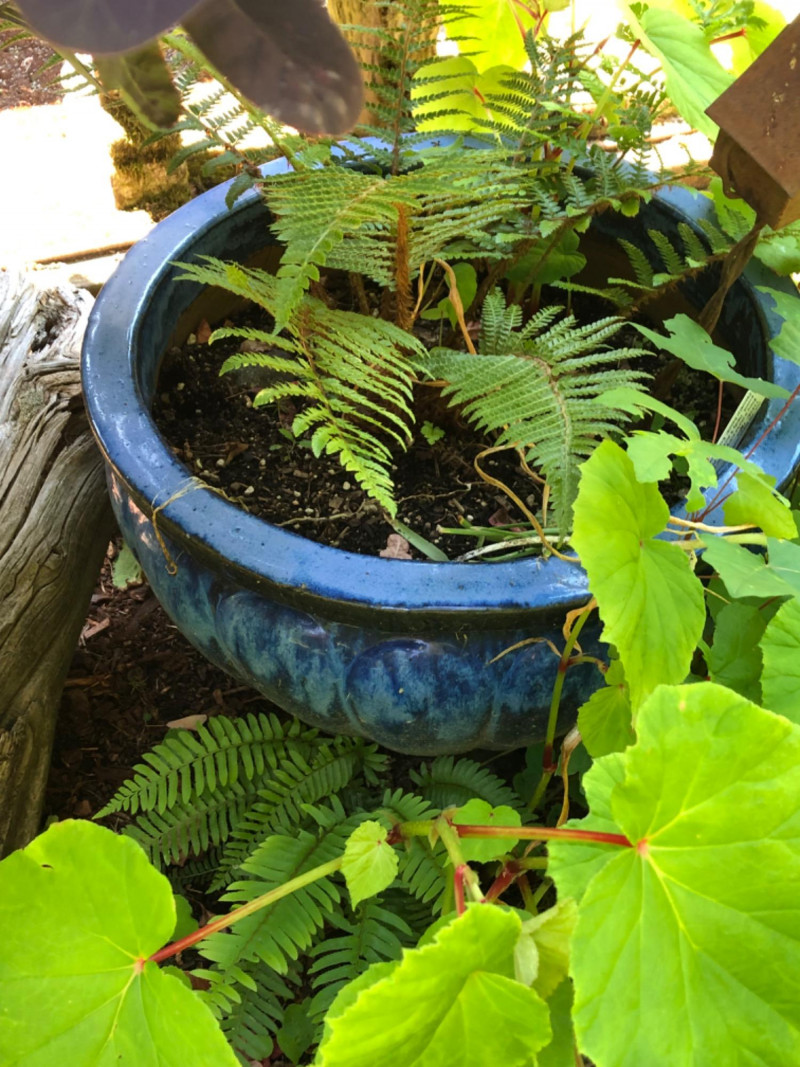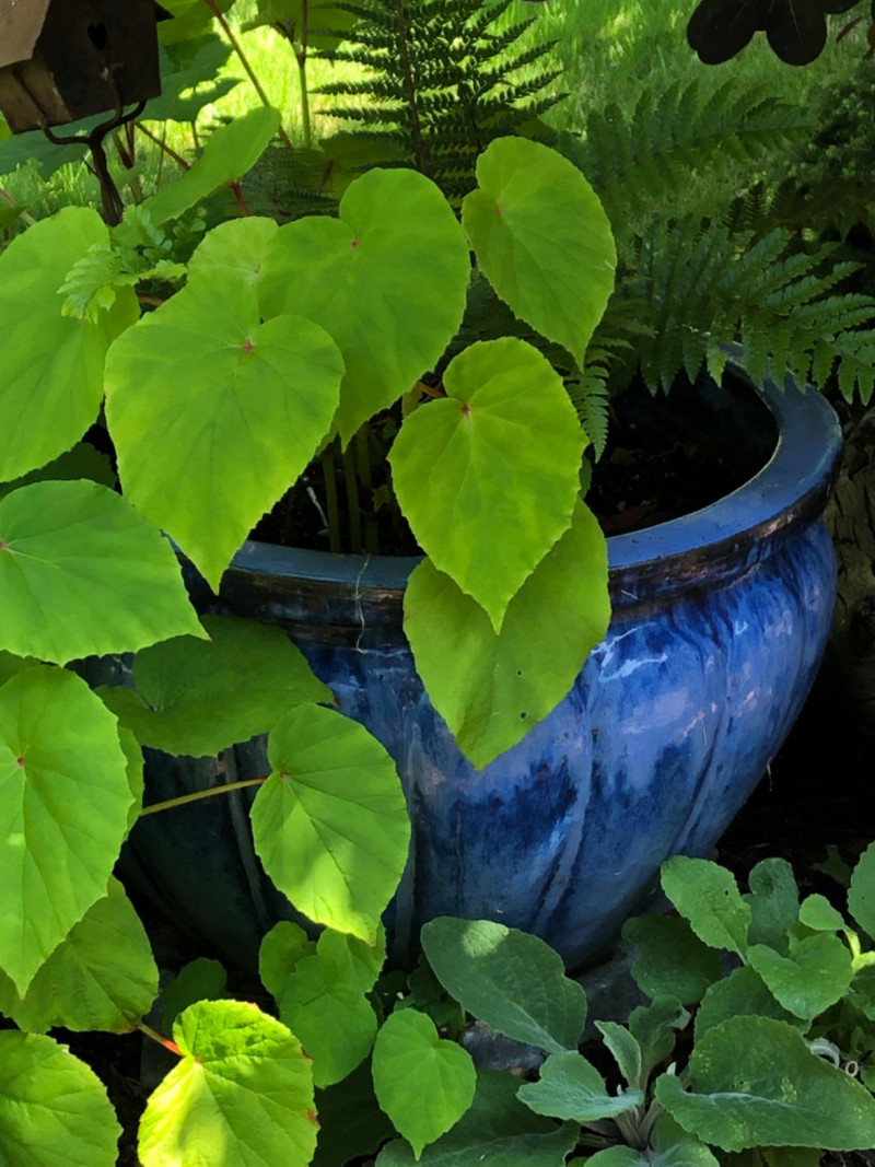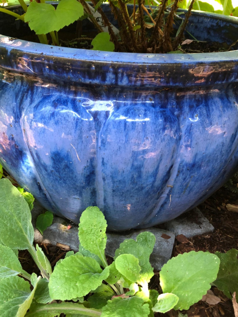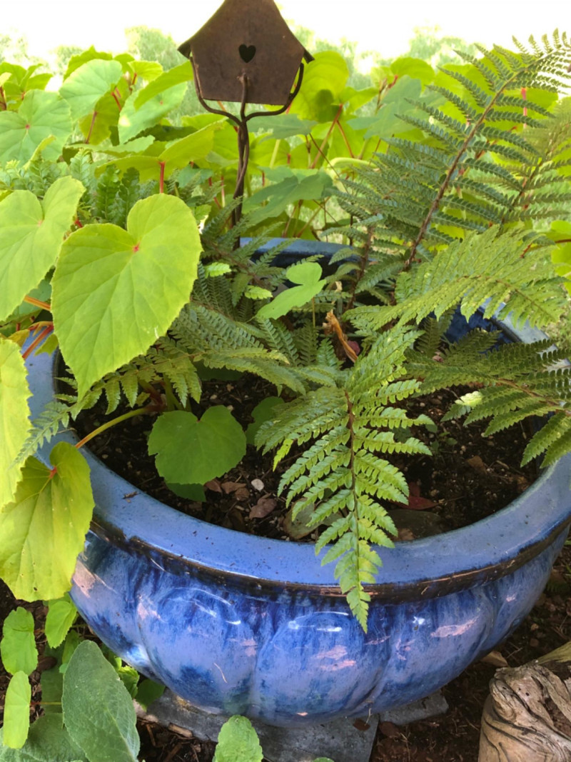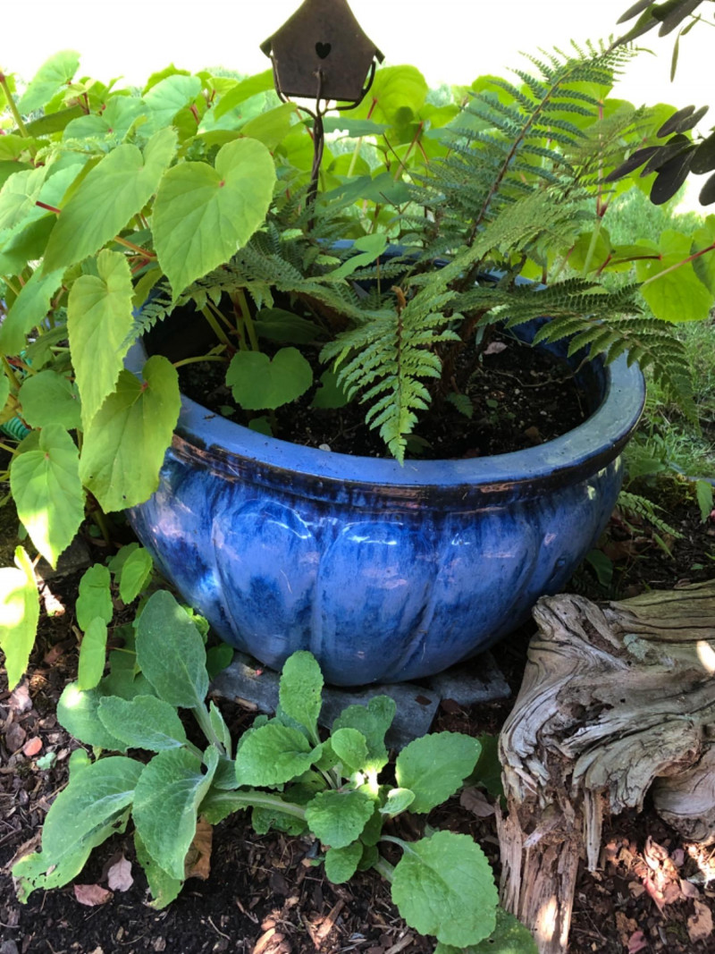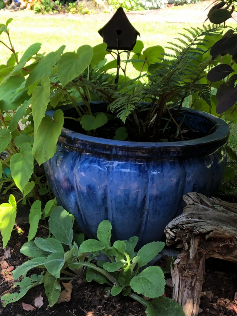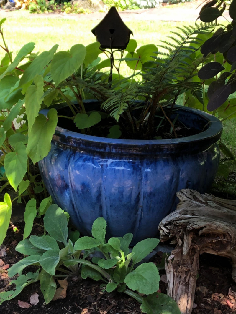 Bold garden statement piece featuring a substantial ceramic planter in rich blue tones, paired with artistic metal birdhouse garden sculpture. Includes healthy live plants for immediate display impact. Friendly Reminder: This auction will start closing at 6:30pm on Tuesday, August 12th