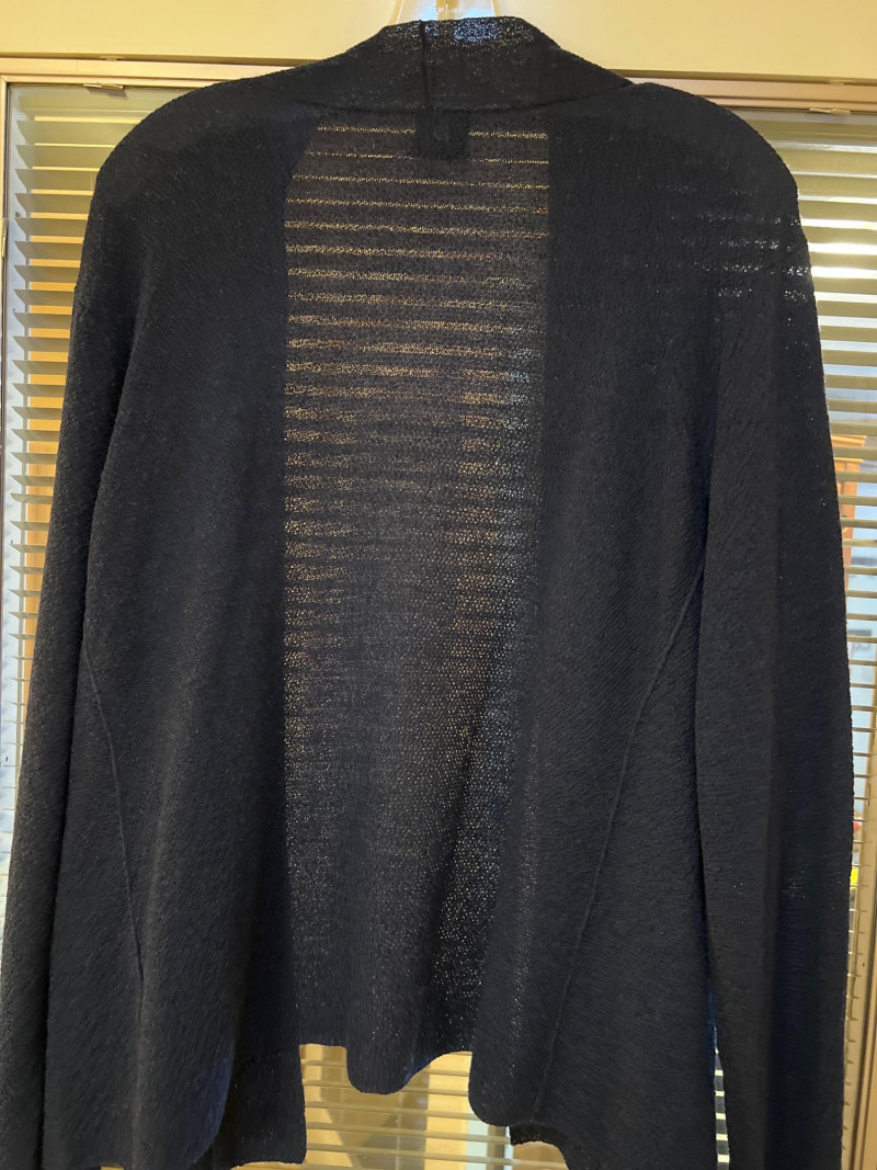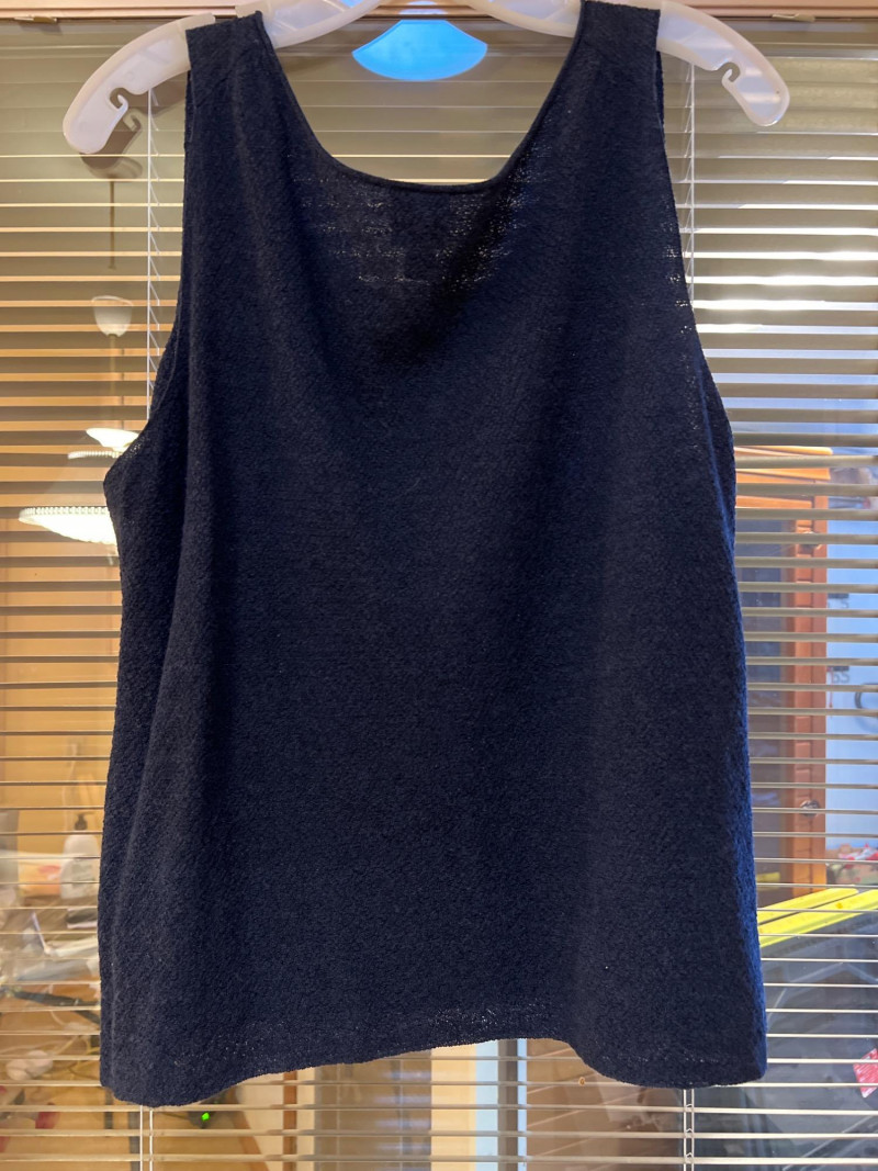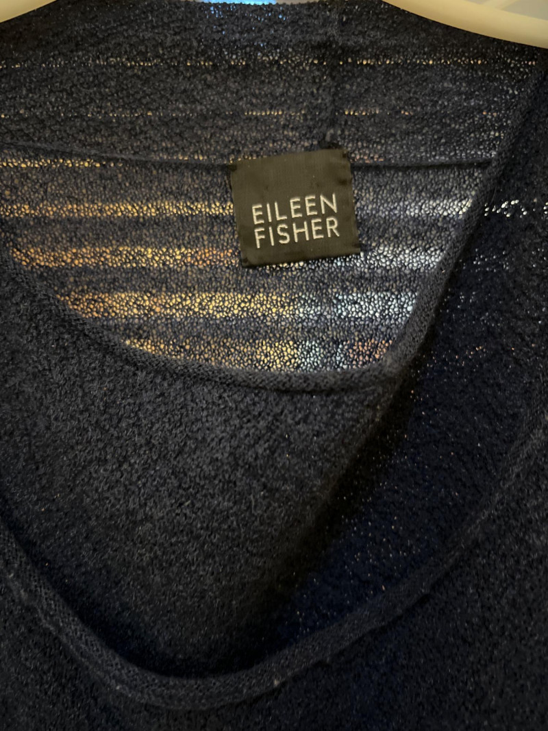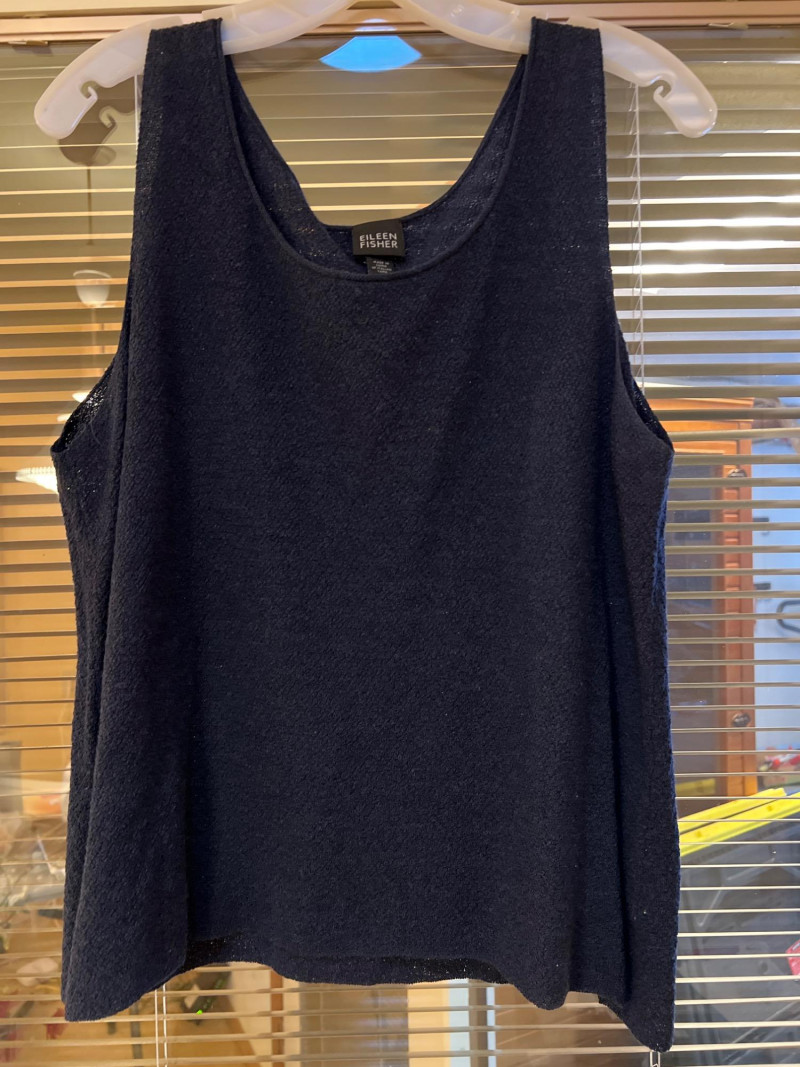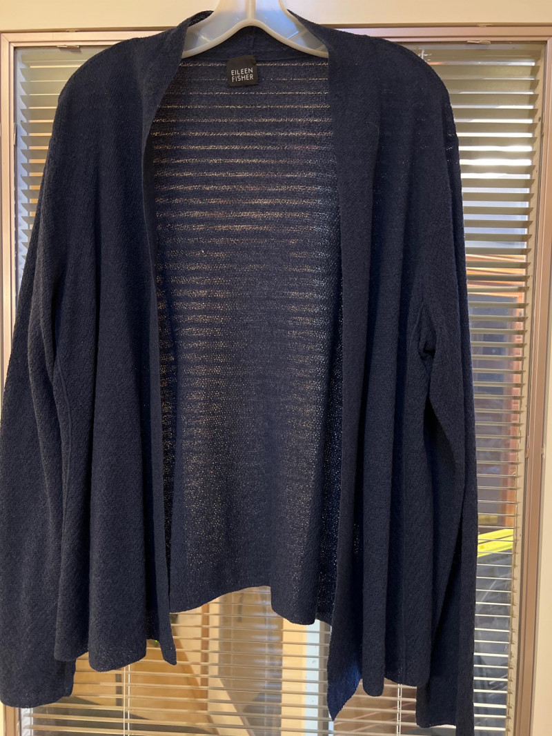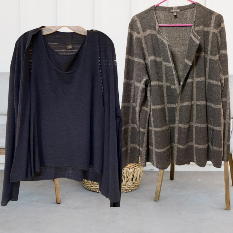 Two timeless wardrobe staples by Eileen Fisher, showcasing the brand’s signature blend of minimalist design and luxurious comfort. Includes: Checked 100% Merino Wool Jacket – Featuring subtle vertical/horizontal striping in a soft neutral palette, crafted from 100% Merino wool. Open front with a relaxed silhouette, ideal for layering. Size L. Used. Navy Wool Knit Set – Coordinated ensemble includes a sleeveless, lightweight tank and matching open-front jacket. Made from 100% wool in deep navy with refined knit texture and effortless drape. Size L. Used. Brand: Eileen Fisher Fabrics: 100% Merino wool (checked); 100% wool (navy set) Colors: Neutral greys + Navy Friendly Reminder: This auction will start closing at 6:30pm on Tuesday, August 12th