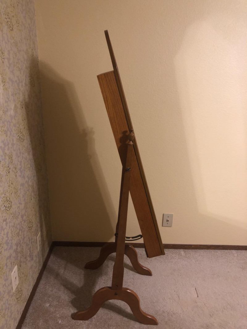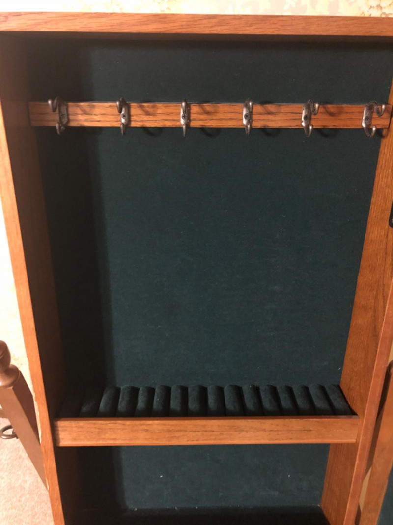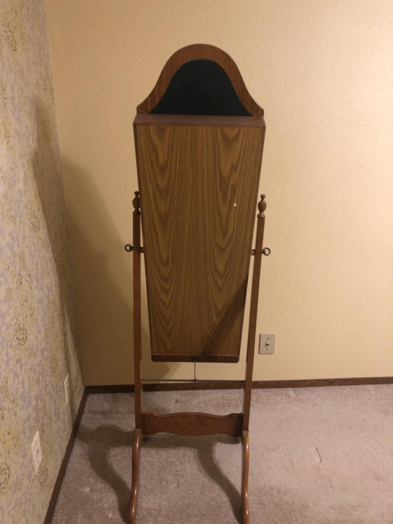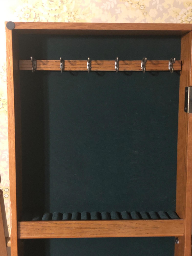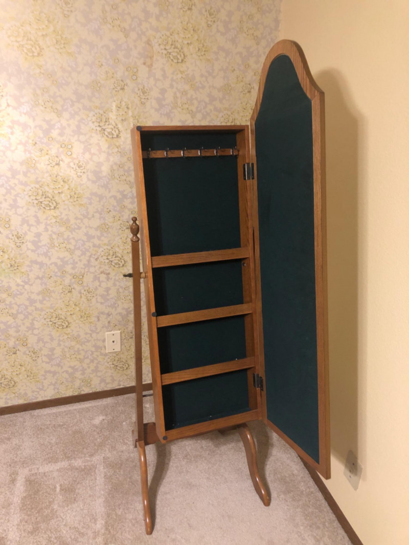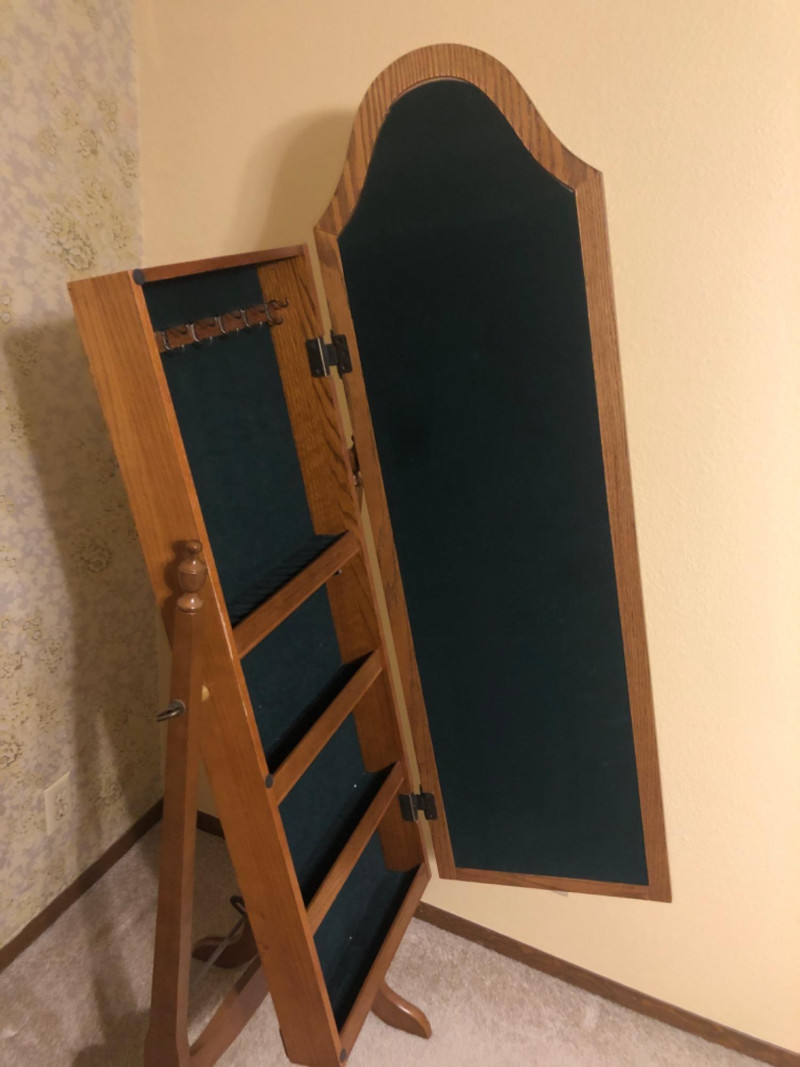 Ingenious space-saving storage with full-length rotating mirror concealing a multi-compartment jewelry cabinet. Holds necklaces, earrings, rings, and more. Stylish and functional bedroom or closet addition. Friendly Reminder: This auction will start closing at 6:30pm on Tuesday, August 12th