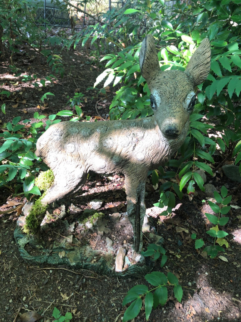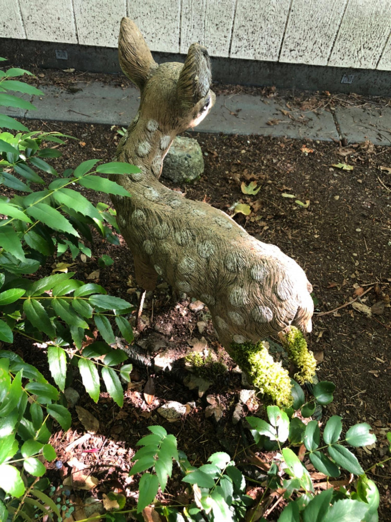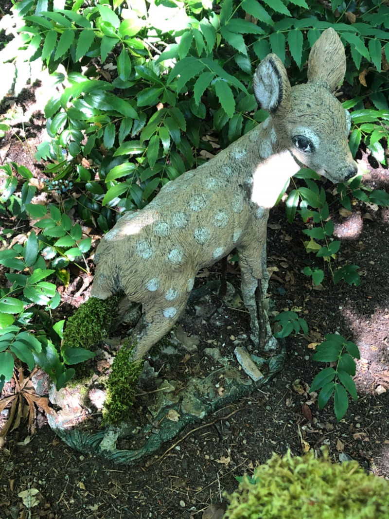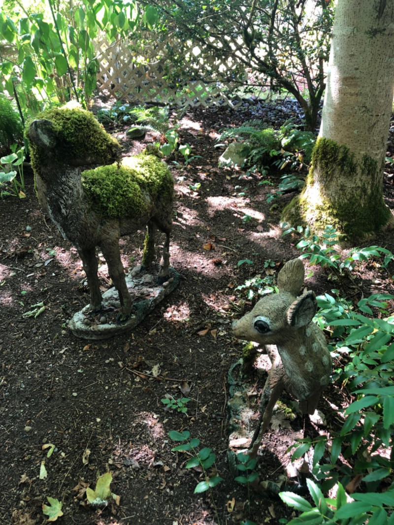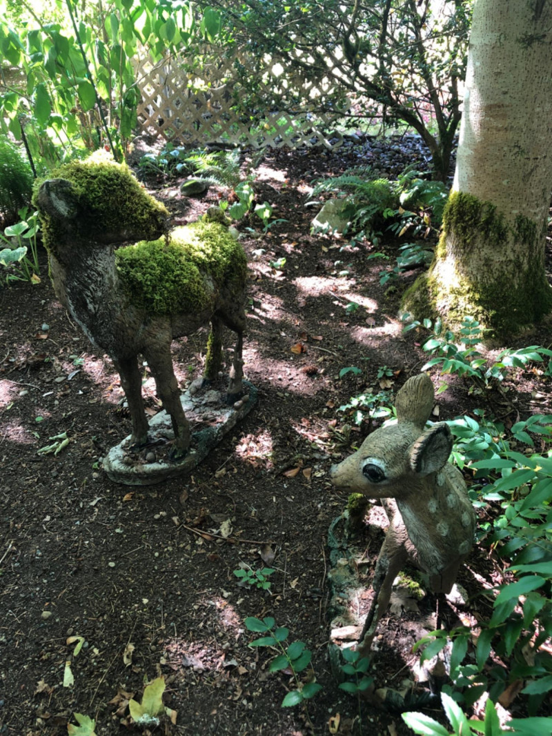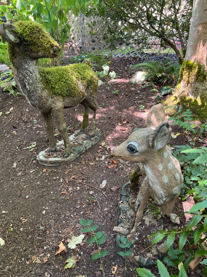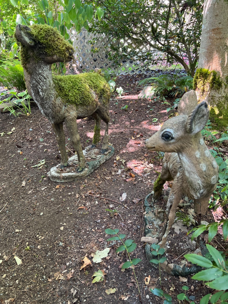 Elegant pair of cement deer sculptures designed for outdoor placement. Detailed forms with serene posture evoke woodland charm and add a peaceful presence to landscaped gardens. Fawn Dimension: 27" high x 20" long x 10" wide Mother Deer with moss cover - Dimension: 35" high x 31" long x 12" wide Friendly Reminder: This auction will start closing at 6:30pm on Tuesday, August 12th