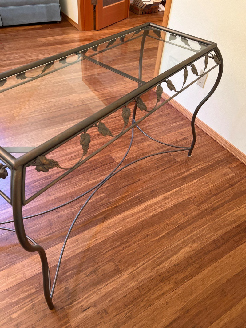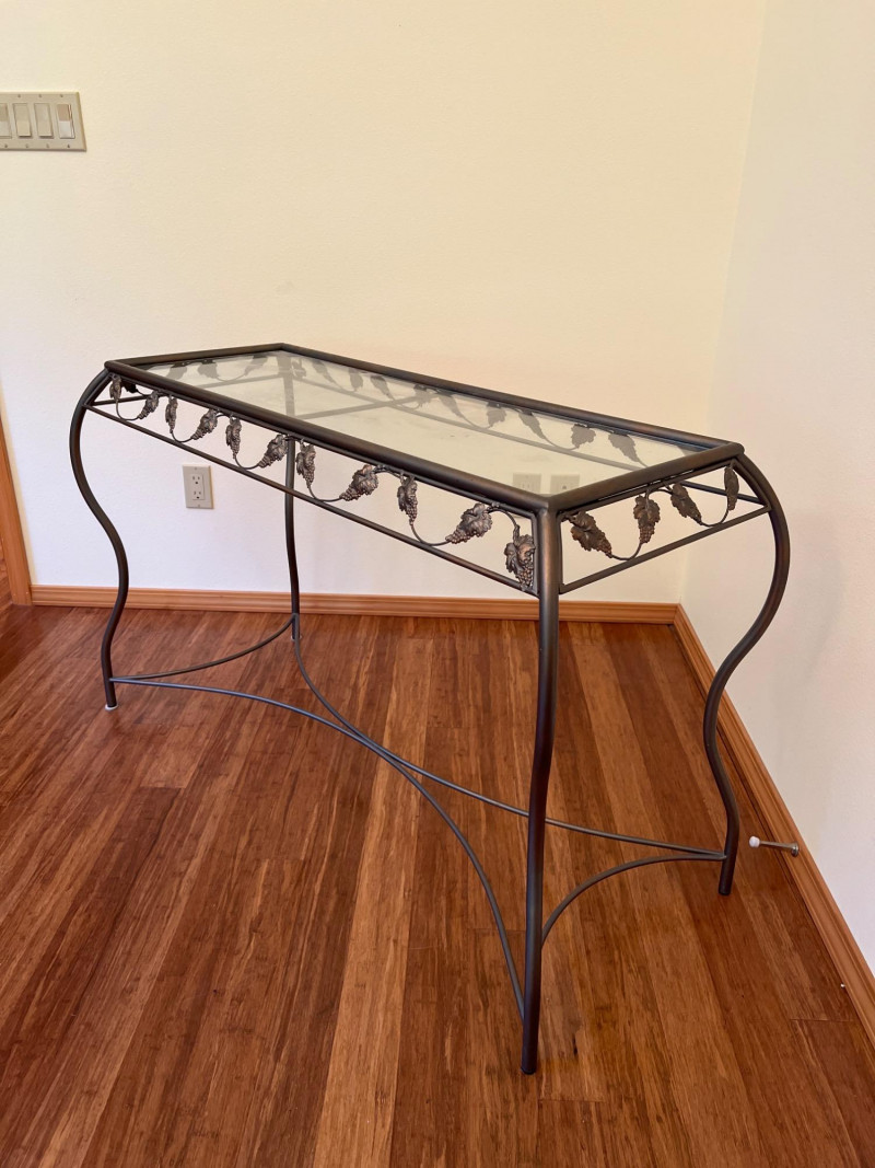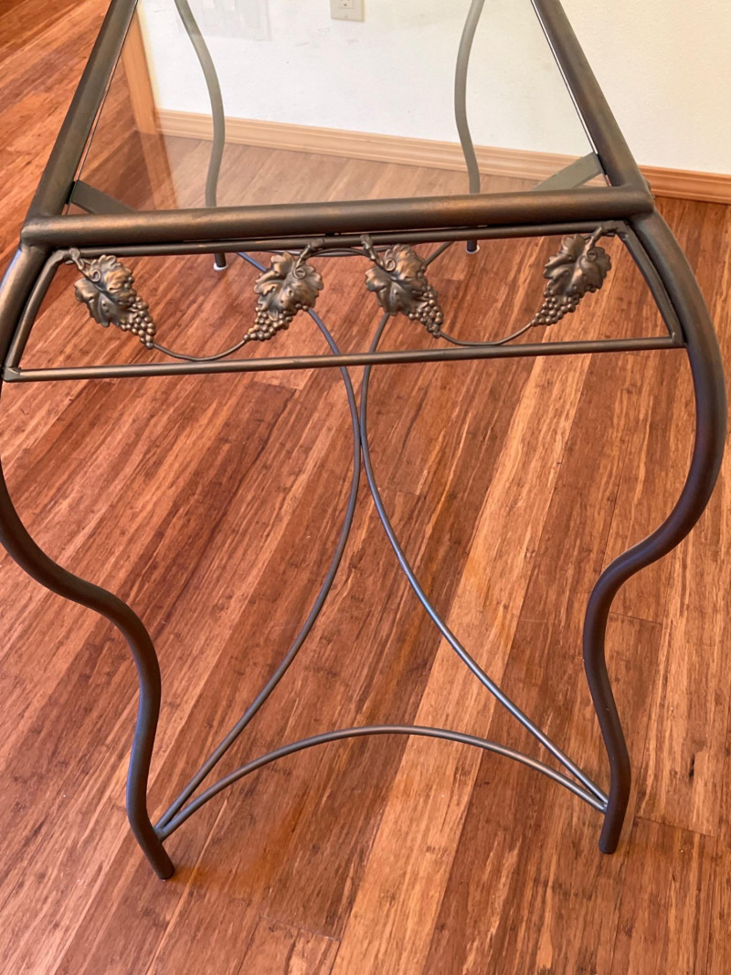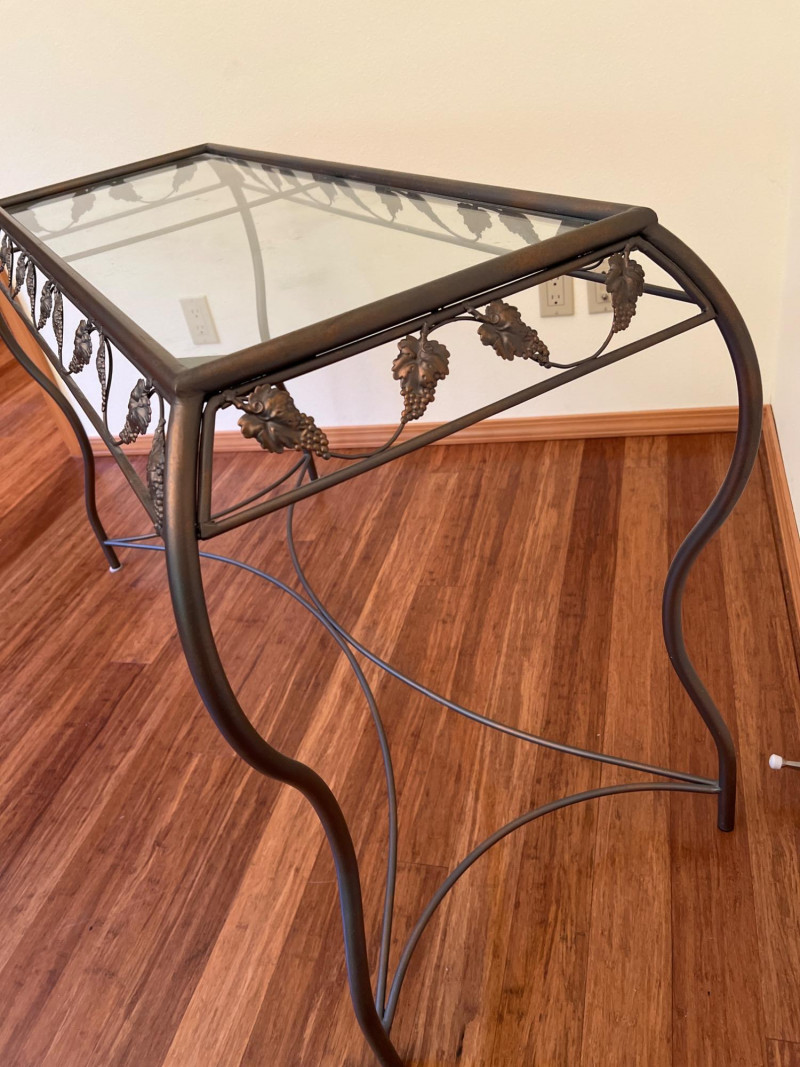 Charming side table featuring sculptural metal grapevine base and clear glass top. Whimsical and nature-inspired, it makes a lovely accent in sunrooms or garden-themed spaces. Friendly Reminder: This auction will start closing at 6:30pm on Tuesday, August 12th
