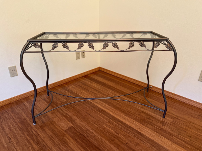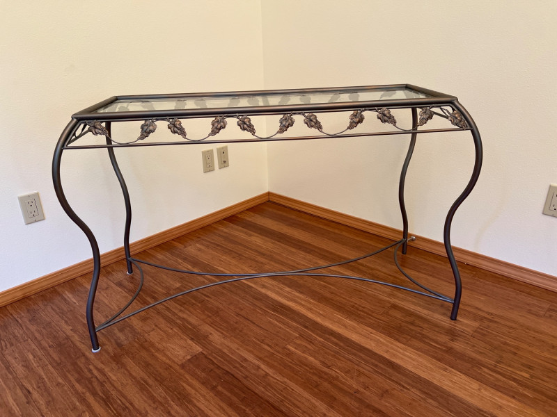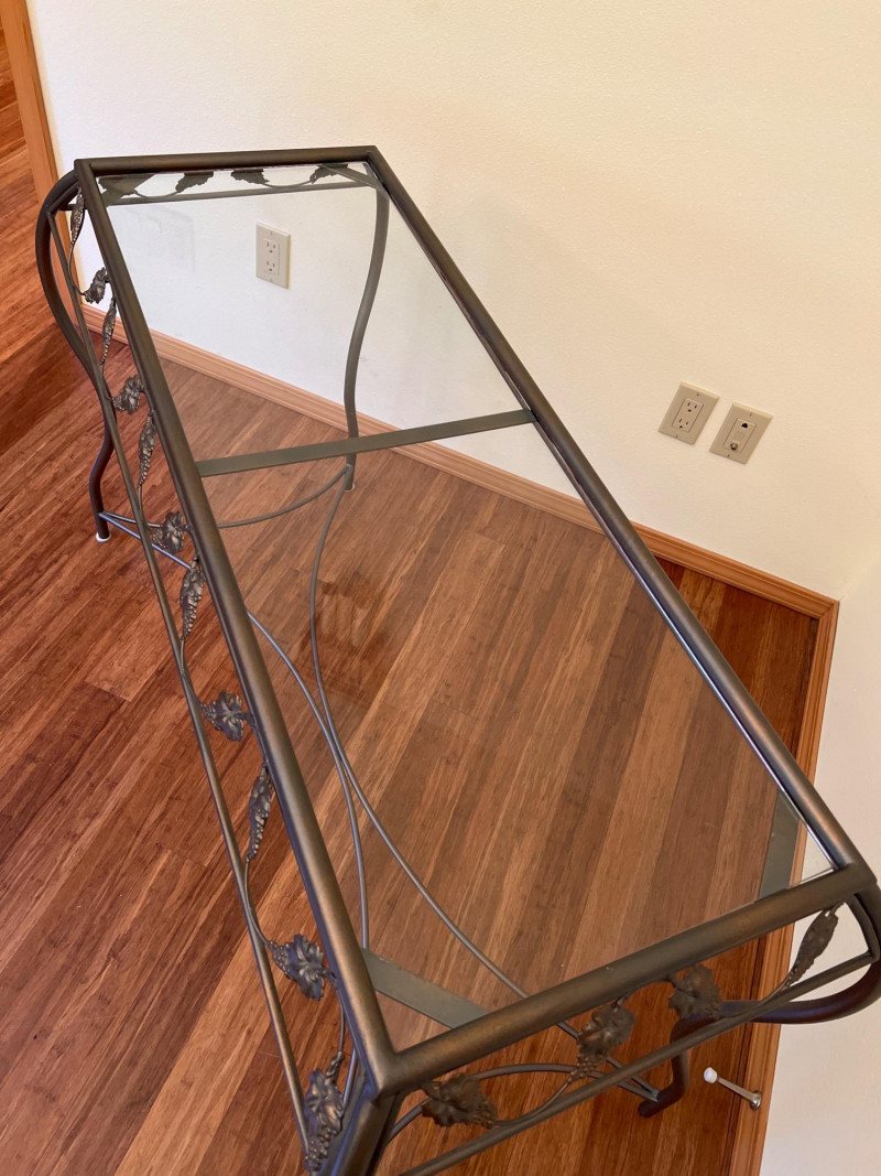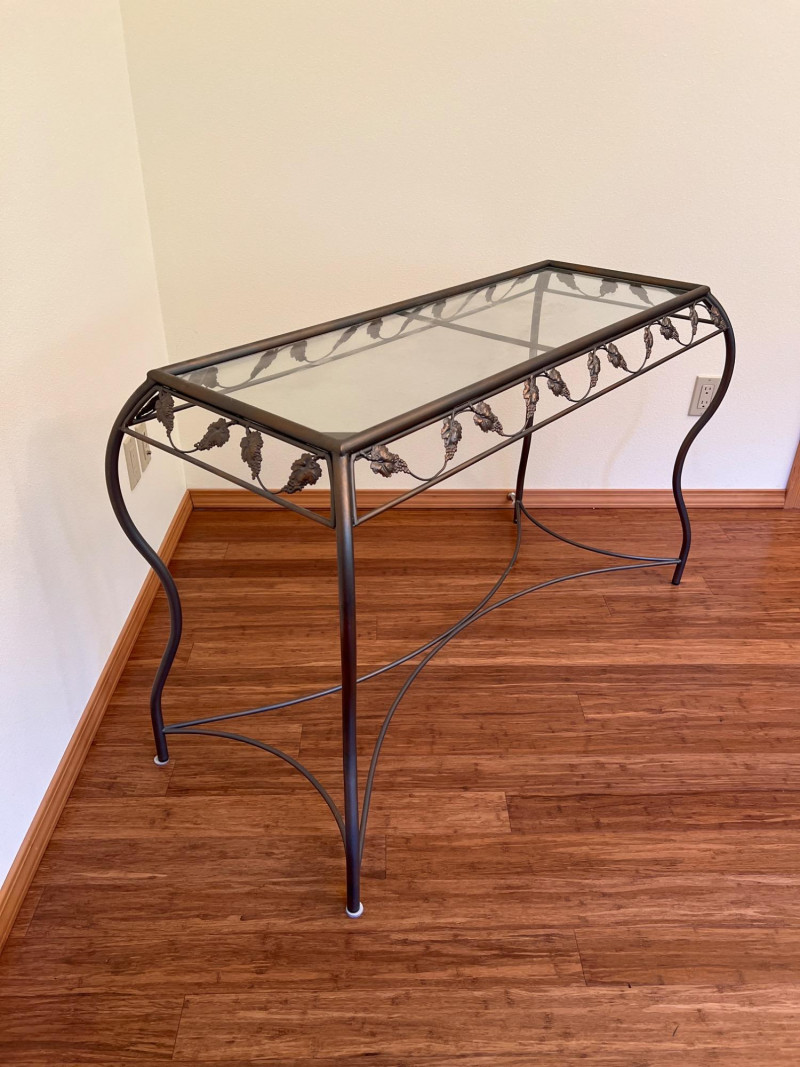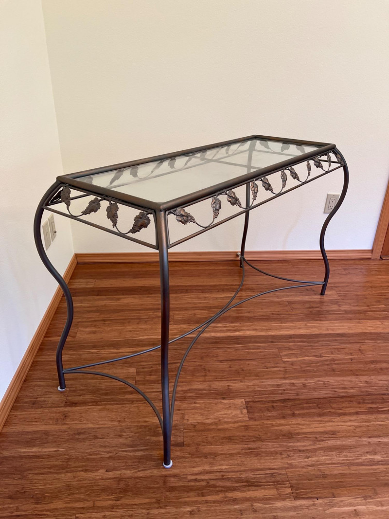 Charming side table featuring sculptural metal grapevine base and clear glass top. Whimsical and nature-inspired, it makes a lovely accent in sunrooms or garden-themed spaces. Friendly Reminder: This auction will start closing at 6:30pm on Tuesday, August 12th
