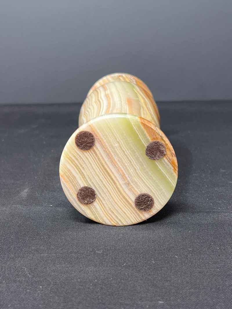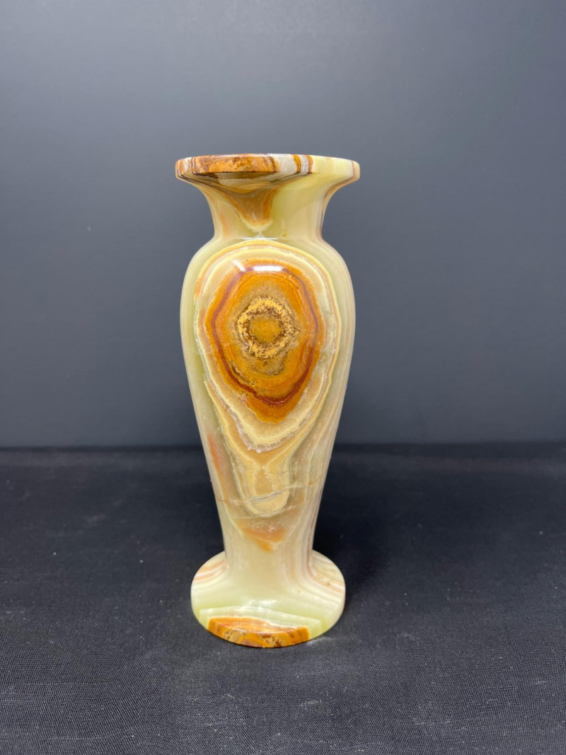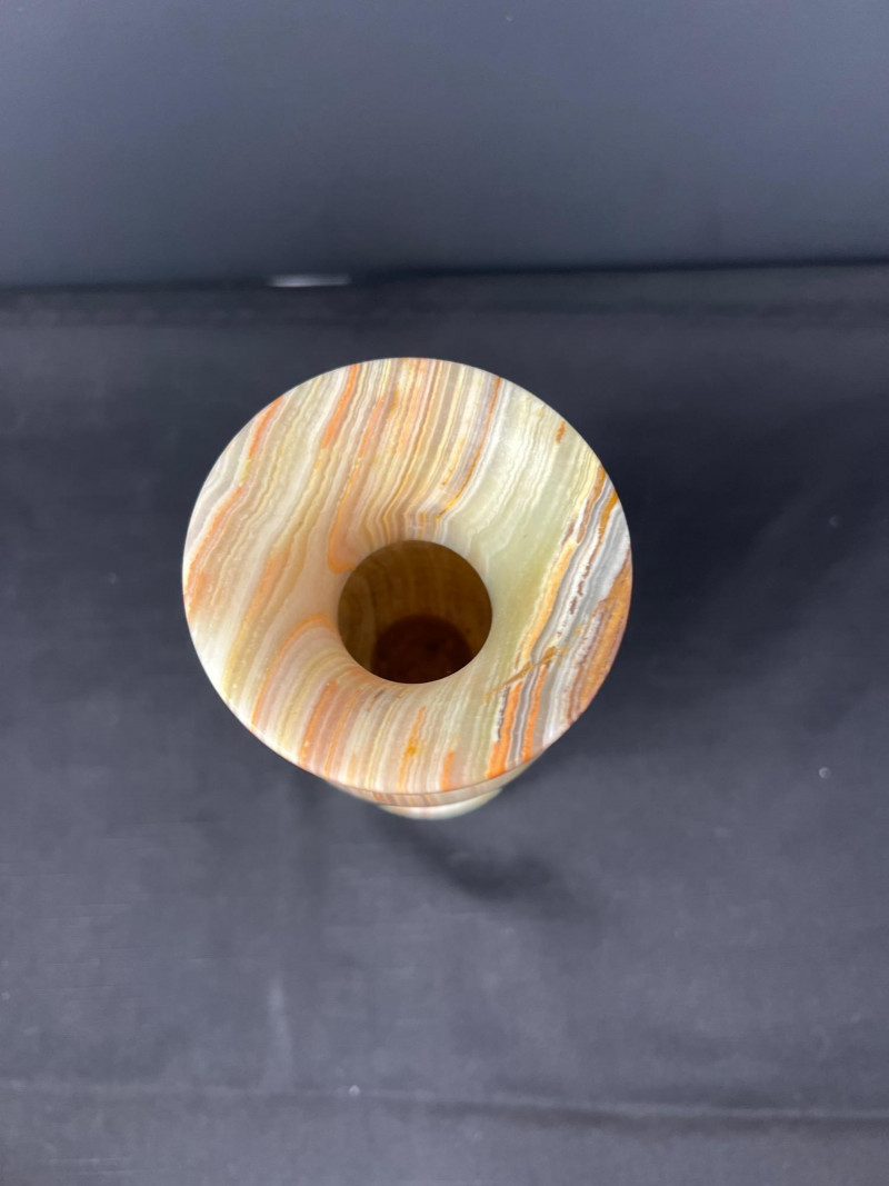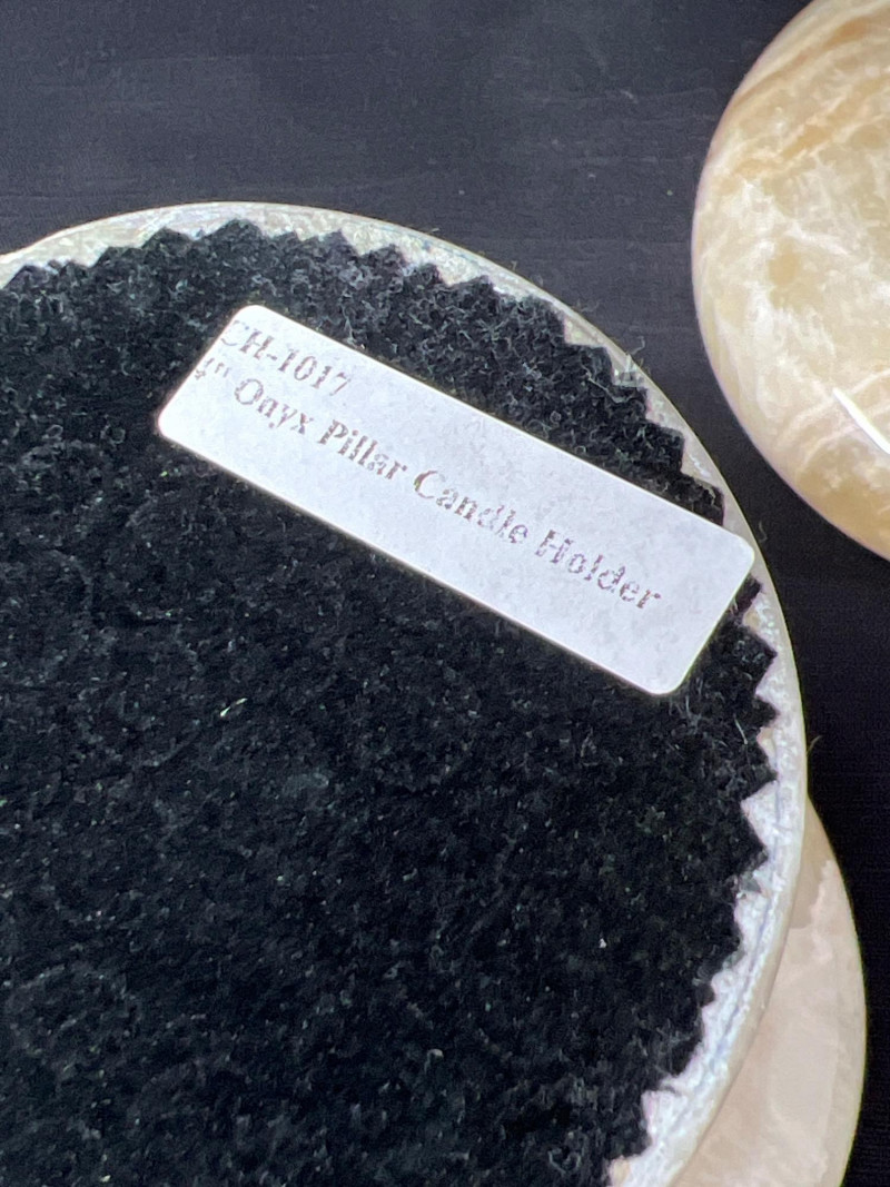 Striking natural stone trio including two onyx pillar candle holders and a polished agate vase. Each piece showcases rich veining and vibrant earthy tones for shelf, table, or mantle styling. Vase is 8 inches tall; 3 inches round. Pillar candle holders are 4 inches tall and 4 1/2 inches around. (note rough edge on base of one candle holder (see pic)) Friendly Reminder: This auction will start closing at 6:30pm on Tuesday, August 12th