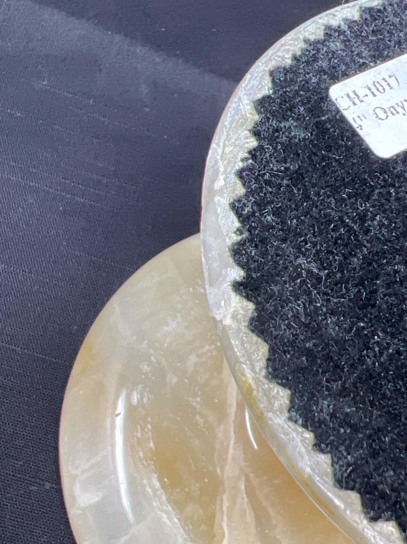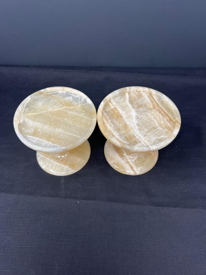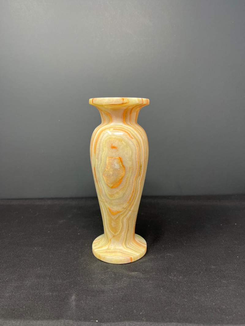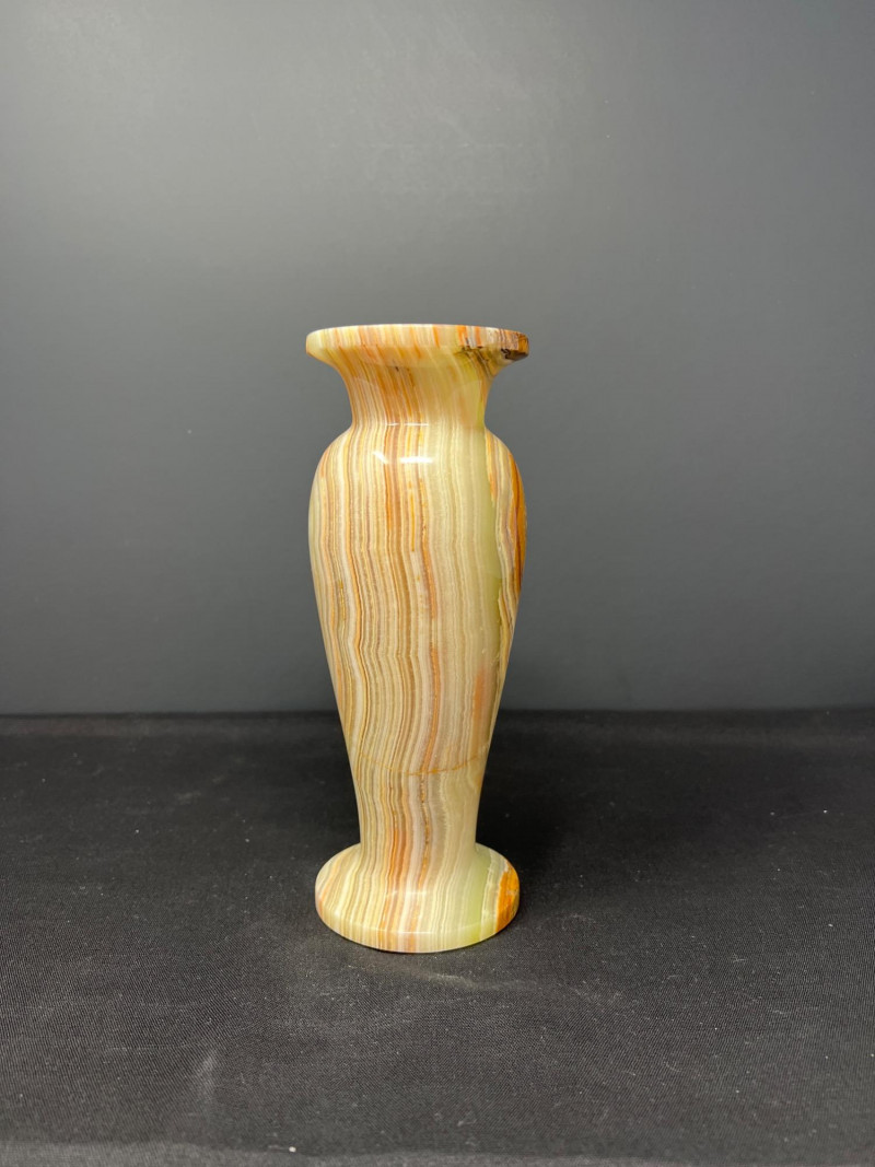 Striking natural stone trio including two onyx pillar candle holders and a polished agate vase. Each piece showcases rich veining and vibrant earthy tones for shelf, table, or mantle styling. Vase is 8 inches tall; 3 inches round. Pillar candle holders are 4 inches tall and 4 1/2 inches around. (note rough edge on base of one candle holder (see pic)) Friendly Reminder: This auction will start closing at 6:30pm on Tuesday, August 12th
