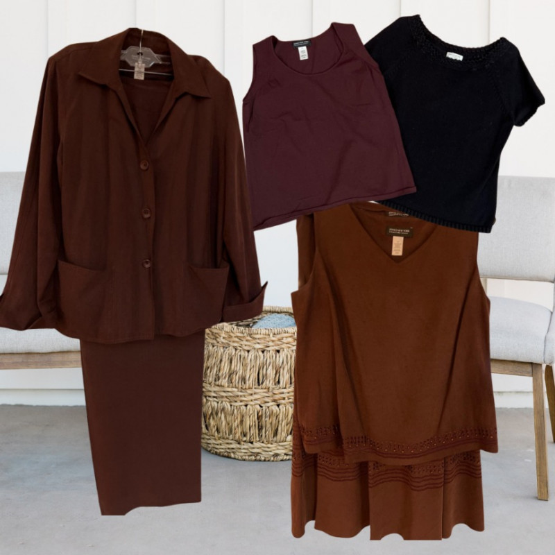Set of four Jones New York Collection Women and Sport brand women’s clothing pieces including pantsuit, skirt/top set, and two elegant tops. Known for refined textures and tailoring, this ensemble blends professional polish and comfort. Includes: Friendly Reminder: This auction will start closing at 6:30pm on Tuesday, August 12th