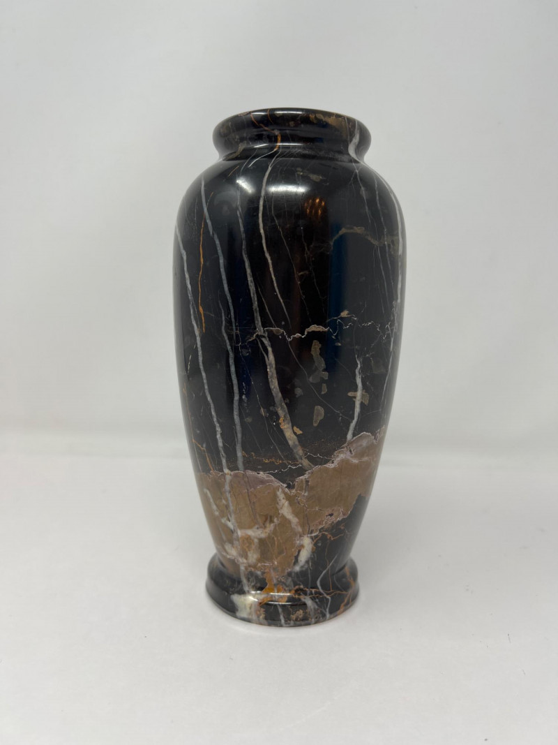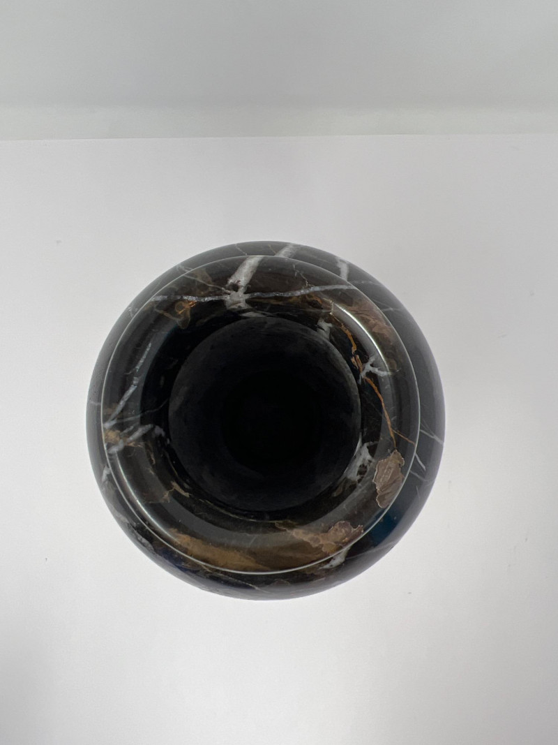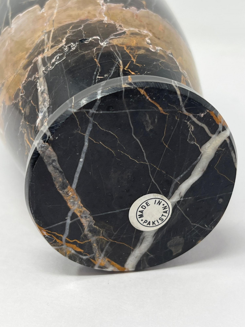 Heavy vase sculpture carved from solid marble with subtle veining and matte finish. Originating from Pakistan. Suitable for display indoors or as a planter. Weight is nearly 5 pounds. Friendly Reminder: This auction will start closing at 6:30pm on Tuesday, August 12th