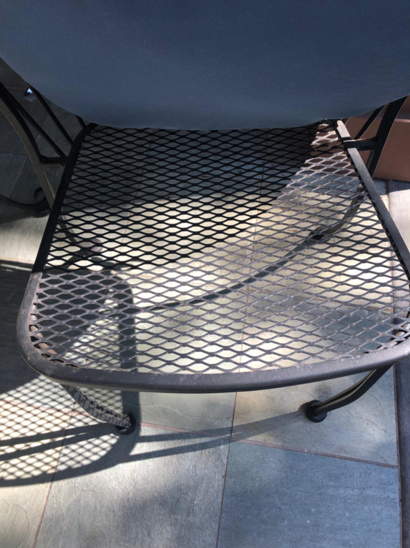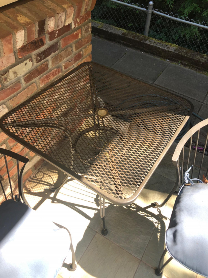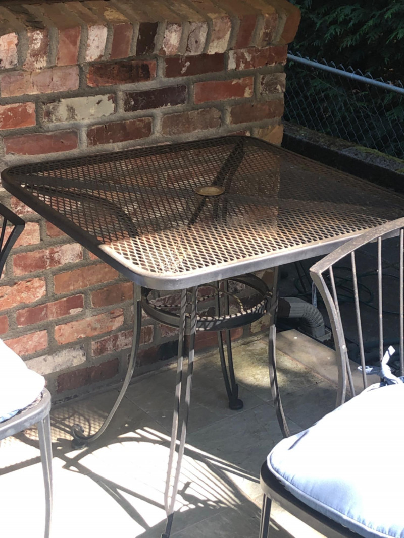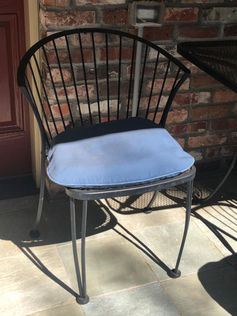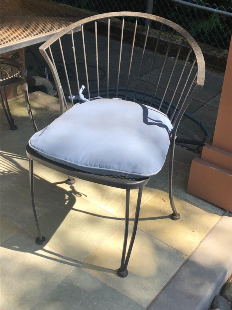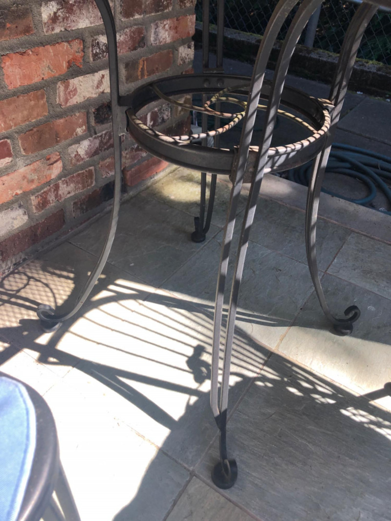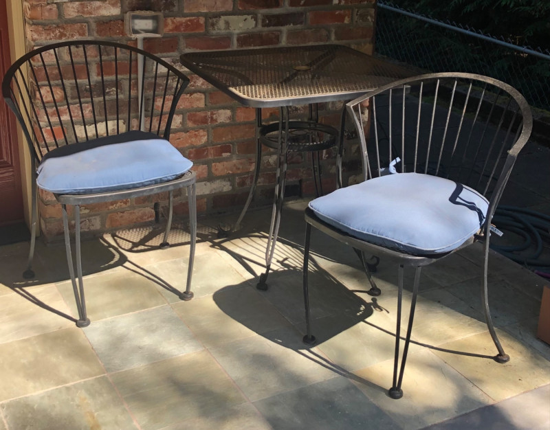 Three-piece outdoor bistro set with wrought iron round table and two matching chairs. Three blue seat cushions included. Scroll details and powder-coated finish for durability. Charming garden styling. Table Dimensions: 29" high x 28" wide x 28" deep Chair Dimensions: Ground to top of back 32" high Ground to seat 17.5" high Seat width 18" wide Seat depth 17" deep Friendly Reminder: This auction will start closing at 6:30pm on Tuesday, August 12th