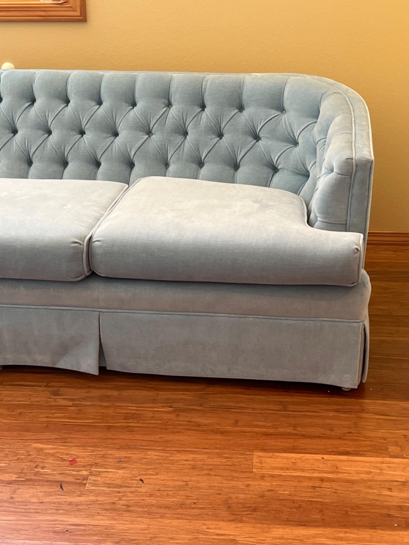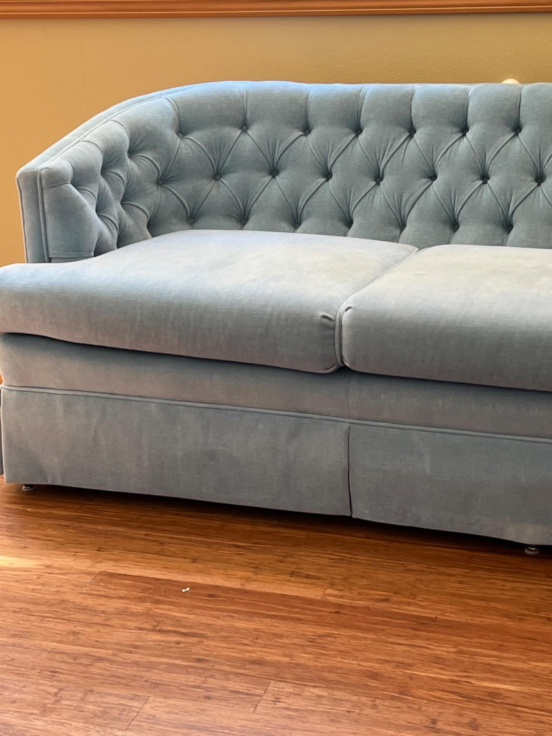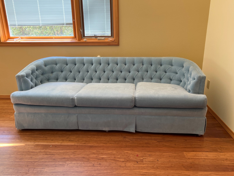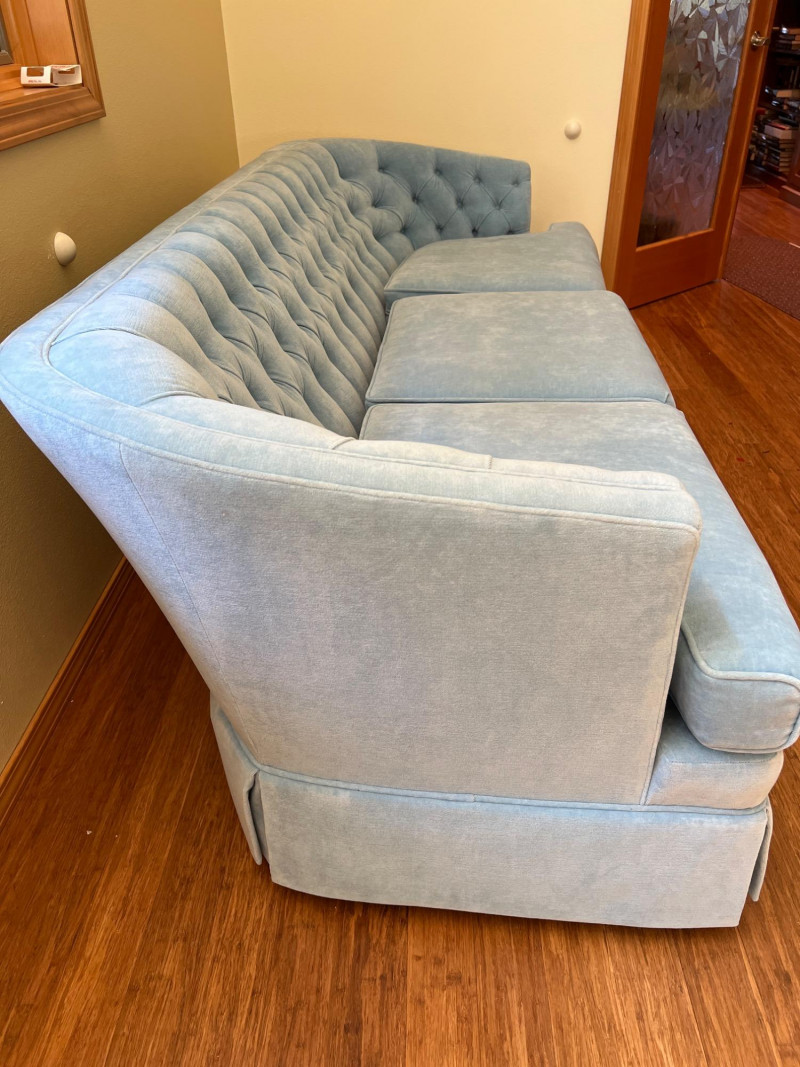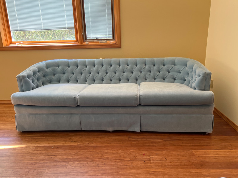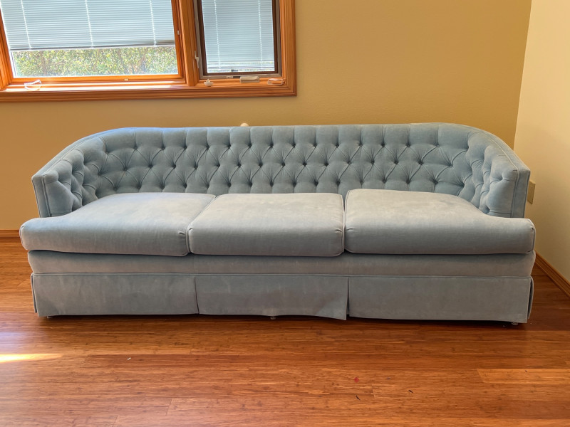 Elegant and timeless, this three-seat mid-century couch features a carved wood frame and curvilinear lines, professionally reupholstered by Lazarus of Bellevue in plush blue velour fabric. The deep seating, sculpted armrests, and dramatic silhouette evoke late 19th-century craftsmanship with modern comfort. A true statement piece perfect for eclectic interiors, vintage lounges, or design-forward restorations. Upholstery: Rich blue velour Structure: Carved wood frame with ornate scrollwork and high back Seats: Three-seat configuration with deep cushions Condition: Reupholstered and well-maintained Provenance: Upholstery by Lazarus of Bellevue Style: Transitional late-Victorian to mid-century fusion Bidding on this lot is an agreement that: (1.) You will have 2 capable, able-bodied persons to lift and load at a minimum. (2.) You