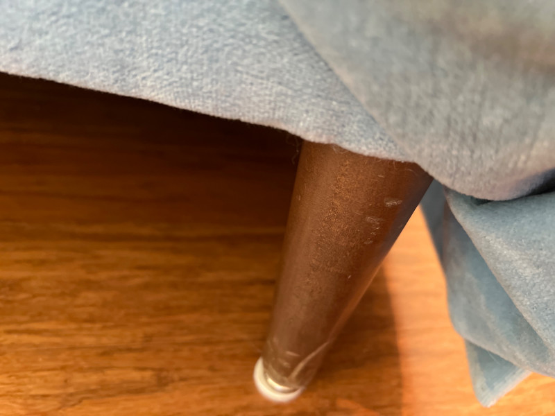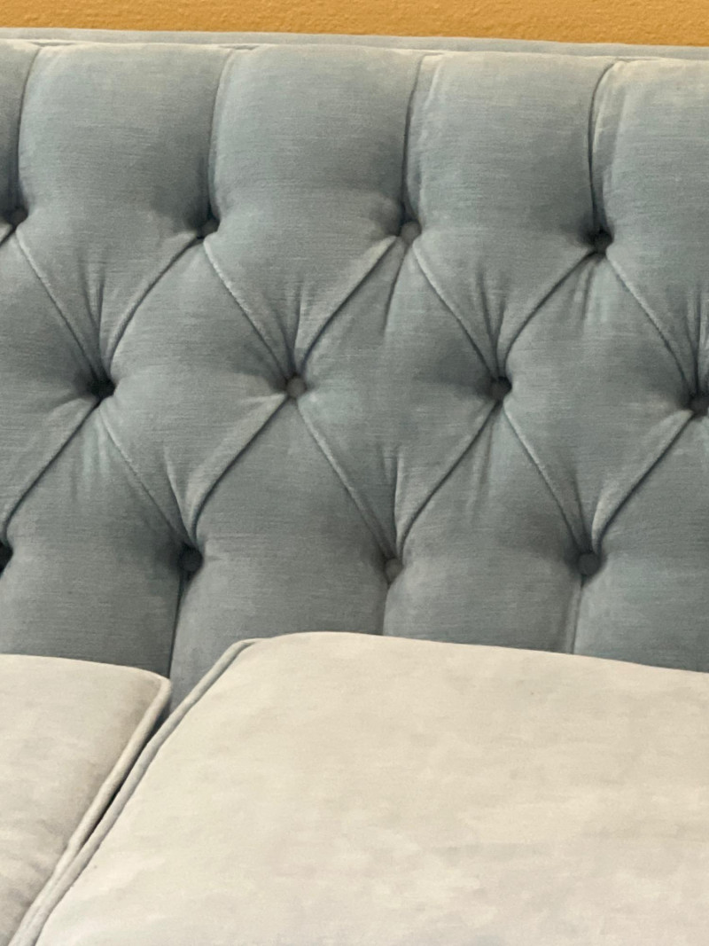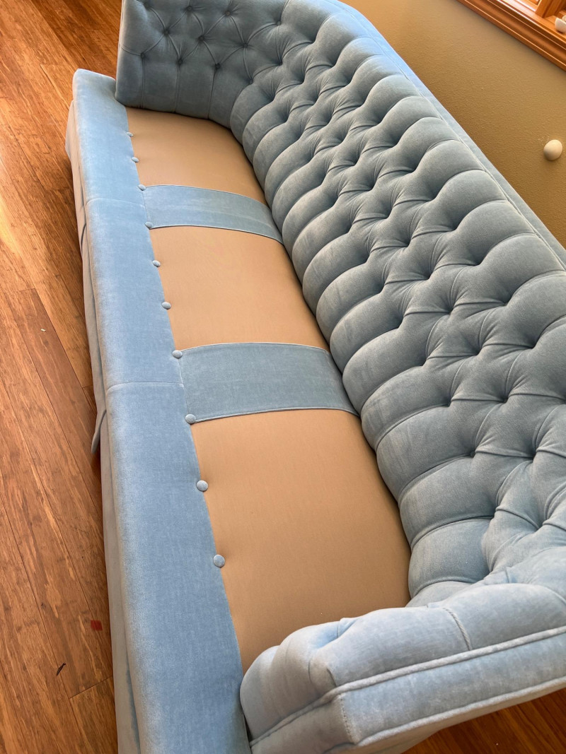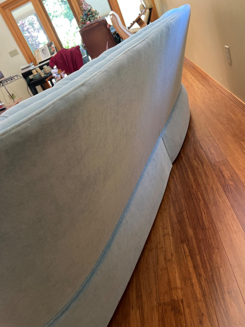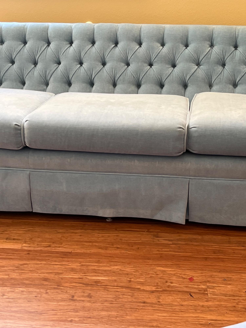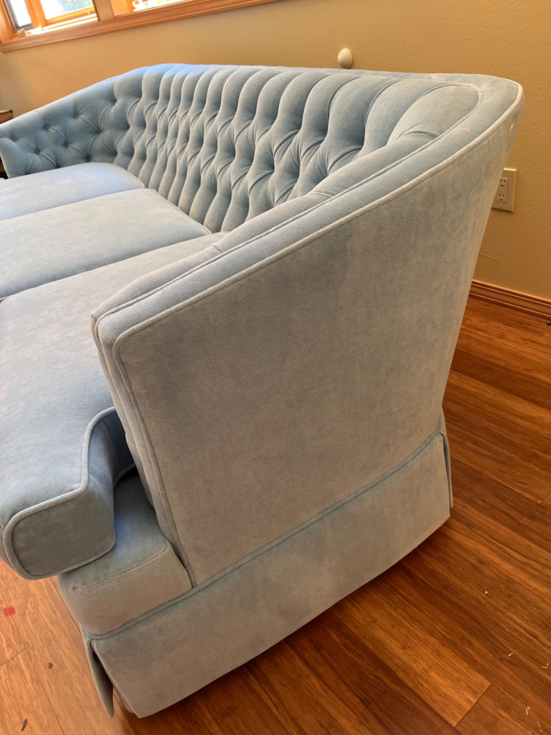 Elegant and timeless, this three-seat mid-century couch features a carved wood frame and curvilinear lines, professionally reupholstered by Lazarus of Bellevue in plush blue velour fabric. The deep seating, sculpted armrests, and dramatic silhouette evoke late 19th-century craftsmanship with modern comfort. A true statement piece perfect for eclectic interiors, vintage lounges, or design-forward restorations. Upholstery: Rich blue velour Structure: Carved wood frame with ornate scrollwork and high back Seats: Three-seat configuration with deep cushions Condition: Reupholstered and well-maintained Provenance: Upholstery by Lazarus of Bellevue Style: Transitional late-Victorian to mid-century fusion Bidding on this lot is an agreement that: (1.) You will have 2 capable, able-bodied persons to lift and load at a minimum. (2.) You