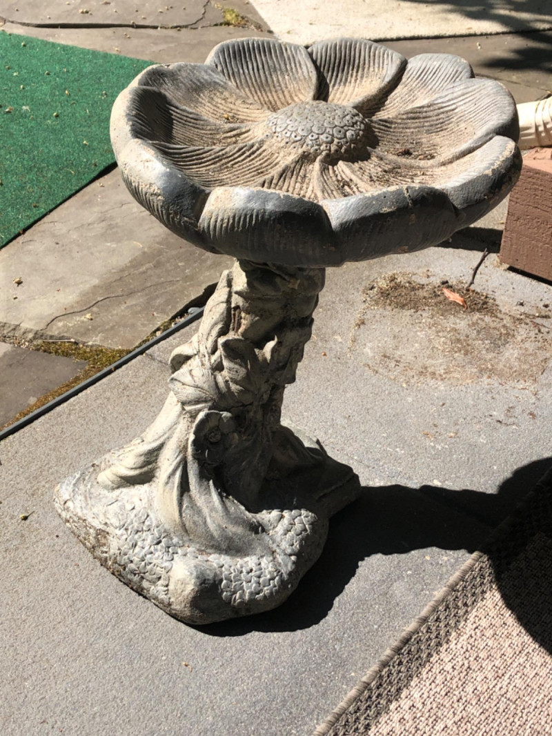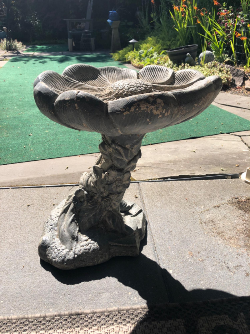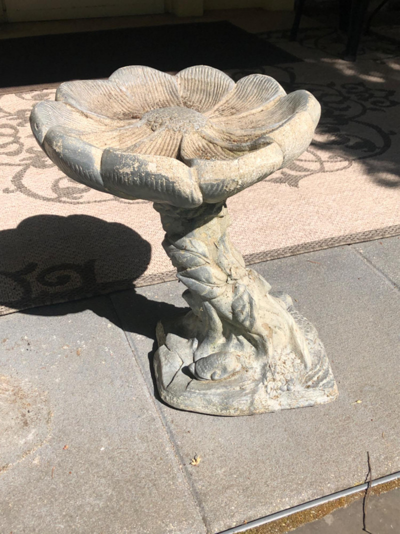 Invite feathered visitors with this traditional cement bird bath. Its simple pedestal silhouette and shallow basin blend seamlessly into any landscape, offering charm and functionality. Friendly Reminder: This auction will start closing at 6:30pm on Tuesday, August 12th