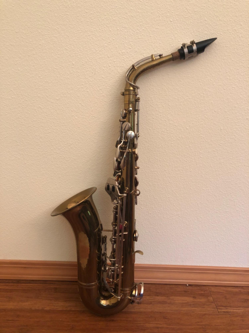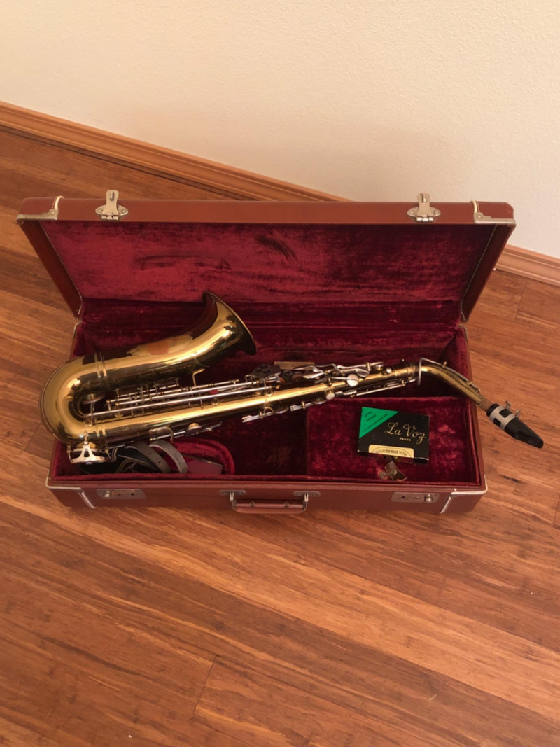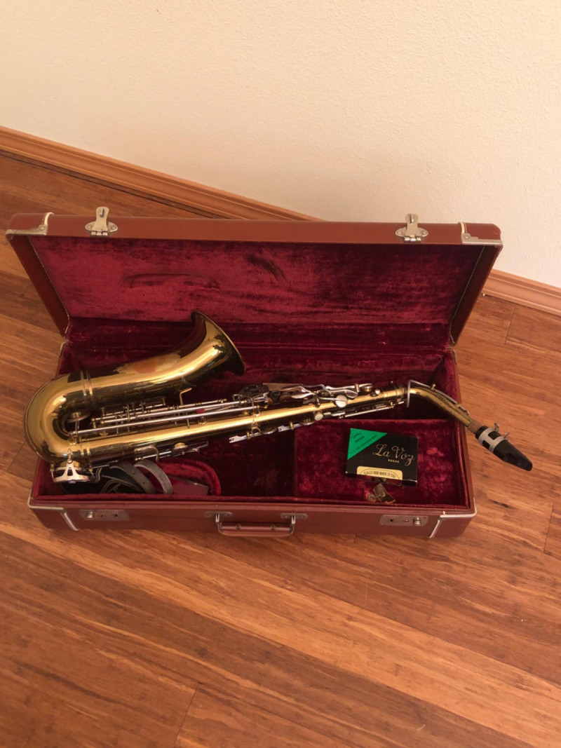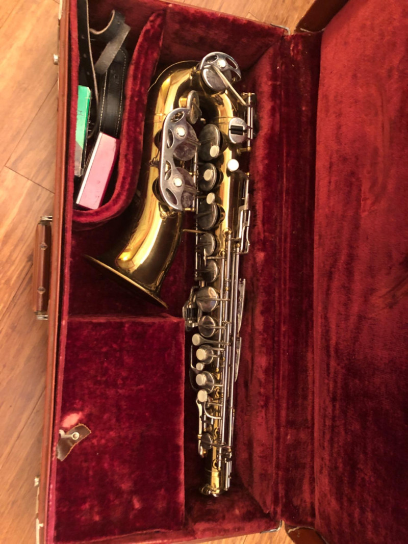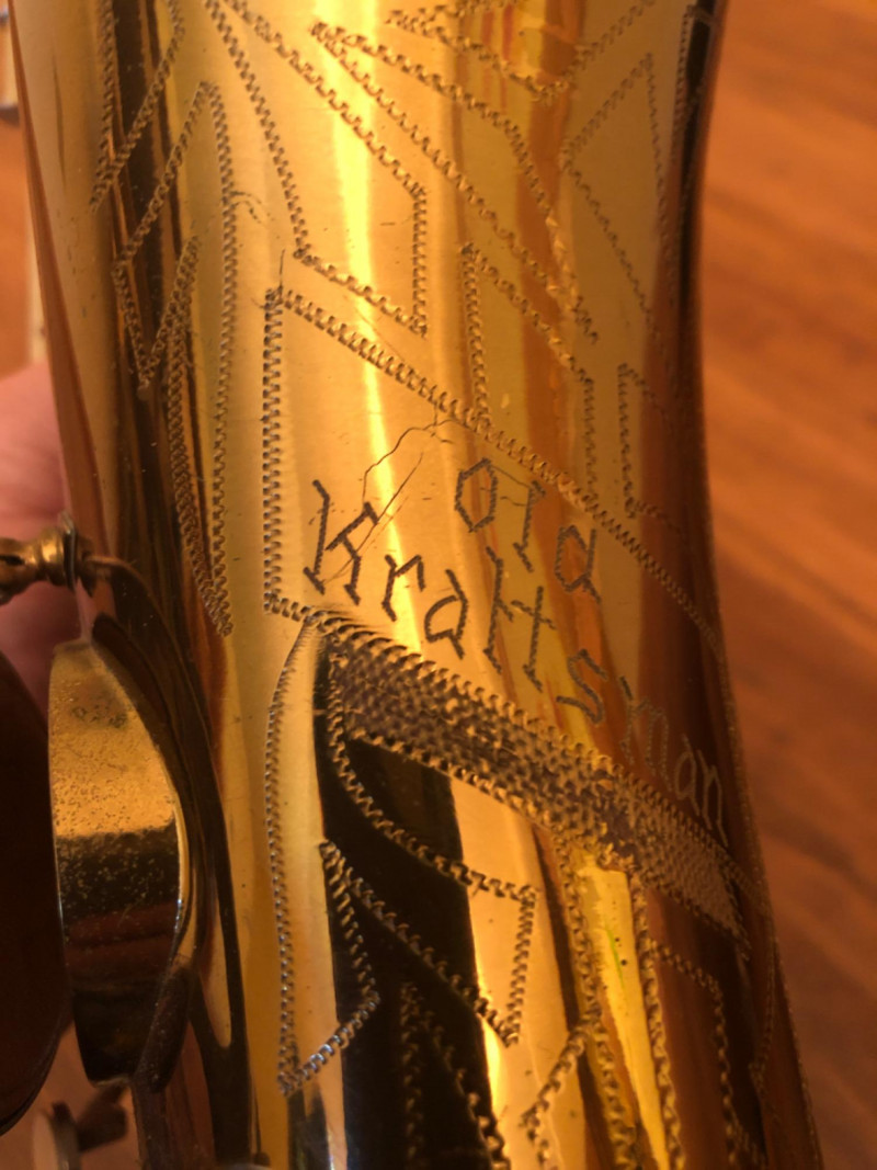 A golden-hued saxophone ready for its encore—displayable or playable, this brass wind instrument offers timeless curves, musical character, and retro charm. Numbered A7653. Old Kraftsman saxophones appear to be a United States issue of this instrument from Malerne of France between 1950s-70s. Friendly Reminder: This auction will start closing at 6:30pm on Tuesday, August 12th