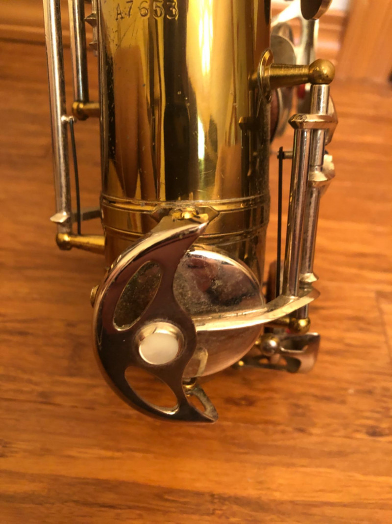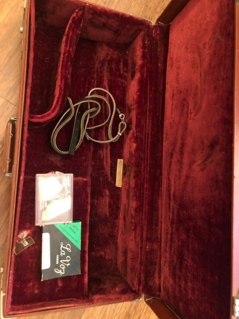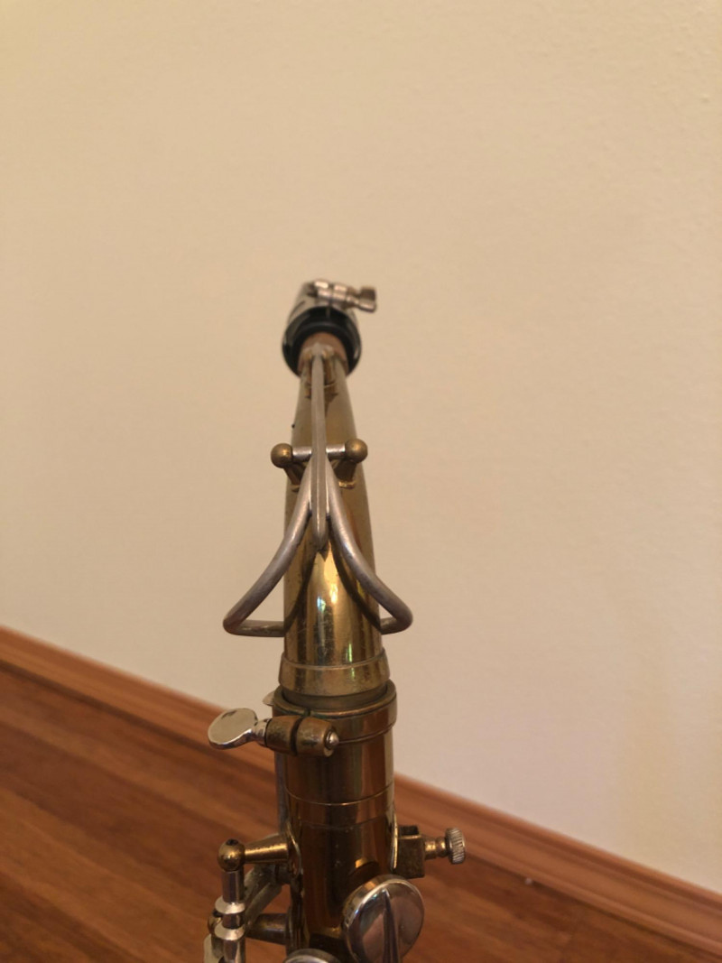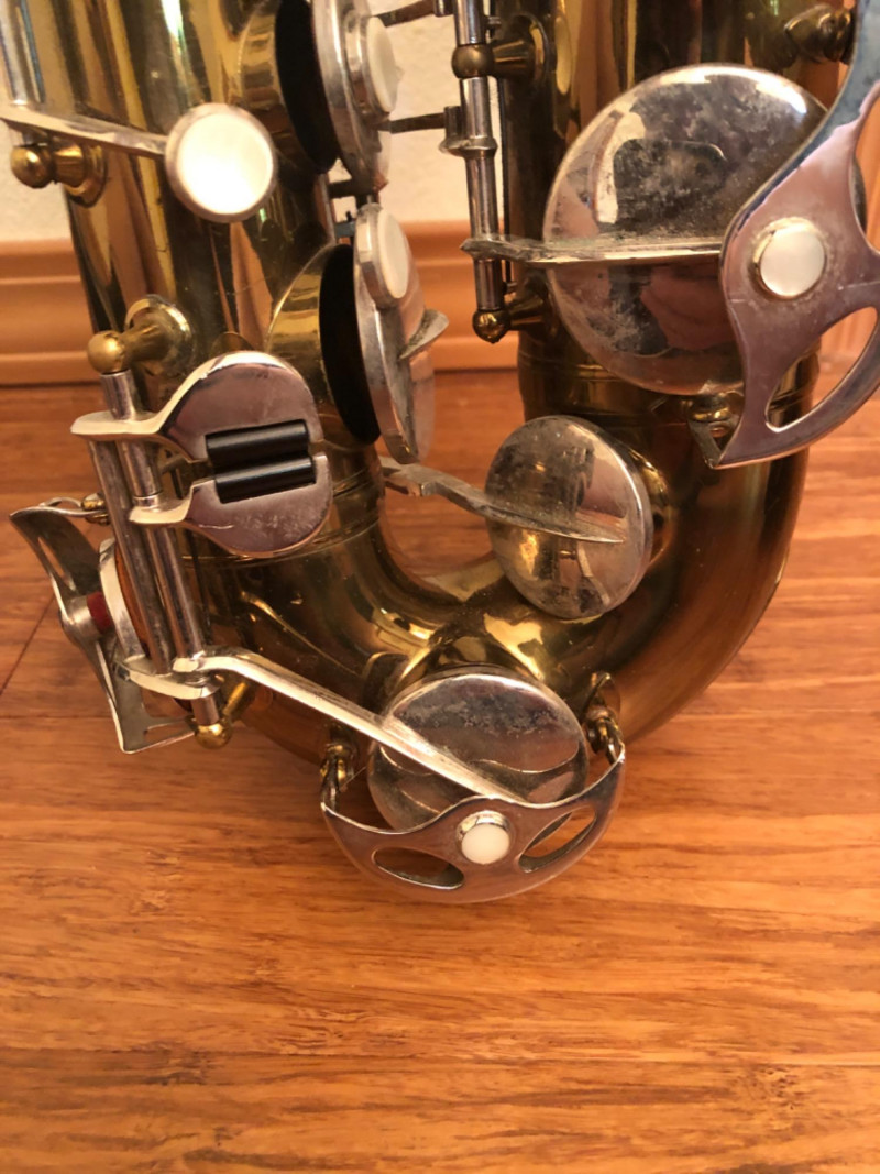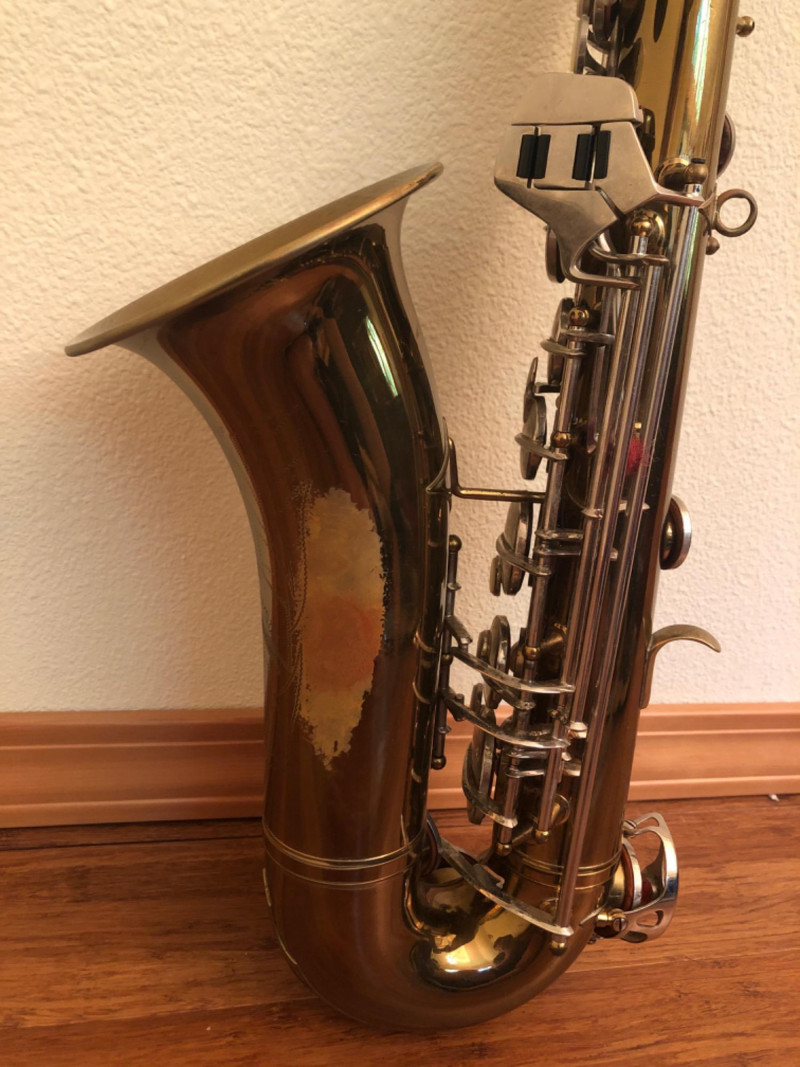 A golden-hued saxophone ready for its encore—displayable or playable, this brass wind instrument offers timeless curves, musical character, and retro charm. Numbered A7653. Old Kraftsman saxophones appear to be a United States issue of this instrument from Malerne of France between 1950s-70s. Friendly Reminder: This auction will start closing at 6:30pm on Tuesday, August 12th