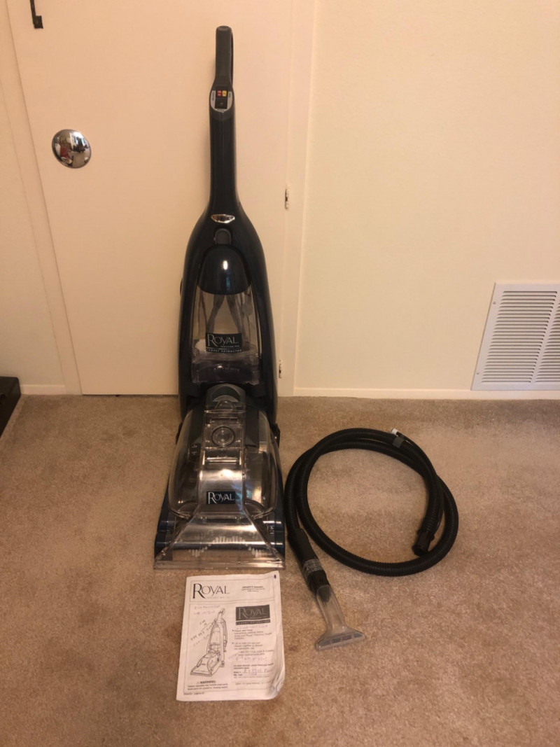 Royal brand carpet extractor, model RY7910, designed for deep carpet cleaning and stain removal. Compact upright design with carrying handle and translucent tank. Functional layout suitable for household use, rental applications, or touch-up cleaning. Friendly Reminder: This auction will start closing at 6:30pm on Tuesday, August 12th