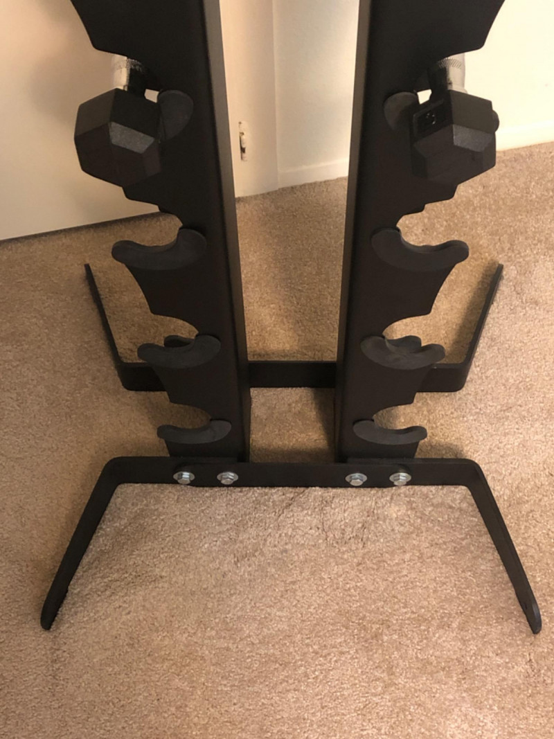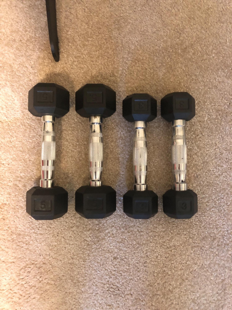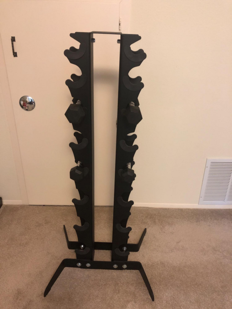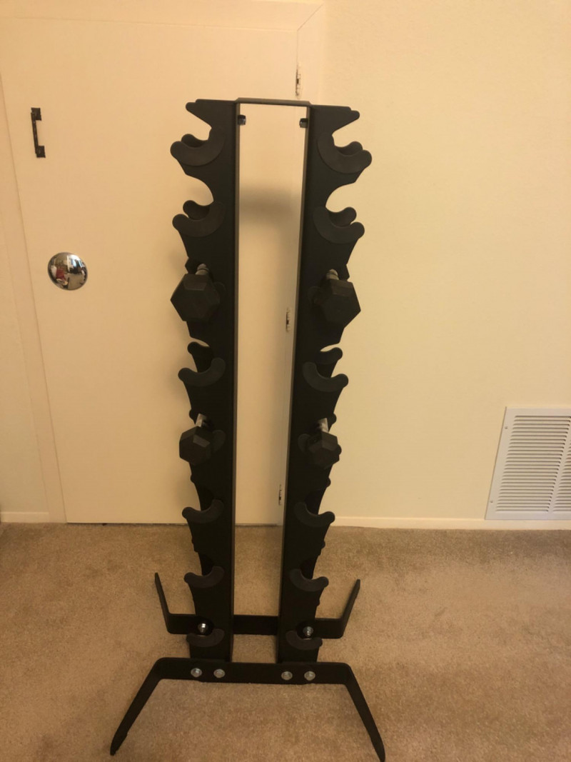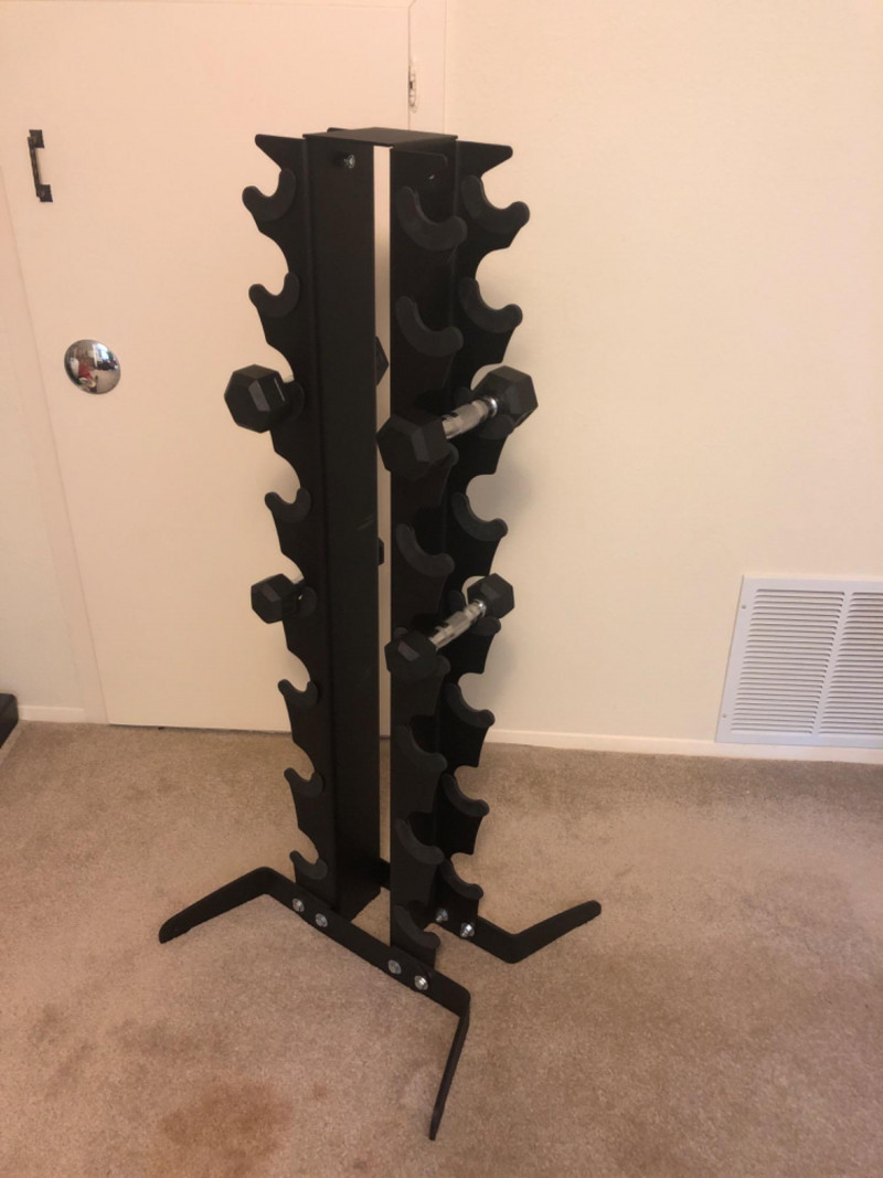 Compact metal dumbbell rack with fitted slots holding two pairs of neoprene weights: 5 lb and 3 lb. Ideal for home gym setups or beginner resistance training routines. Freestanding structure fits easily into corners or workout zones. Friendly Reminder: This auction will start closing at 6:30pm on Tuesday, August 12th
