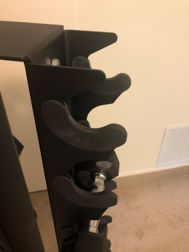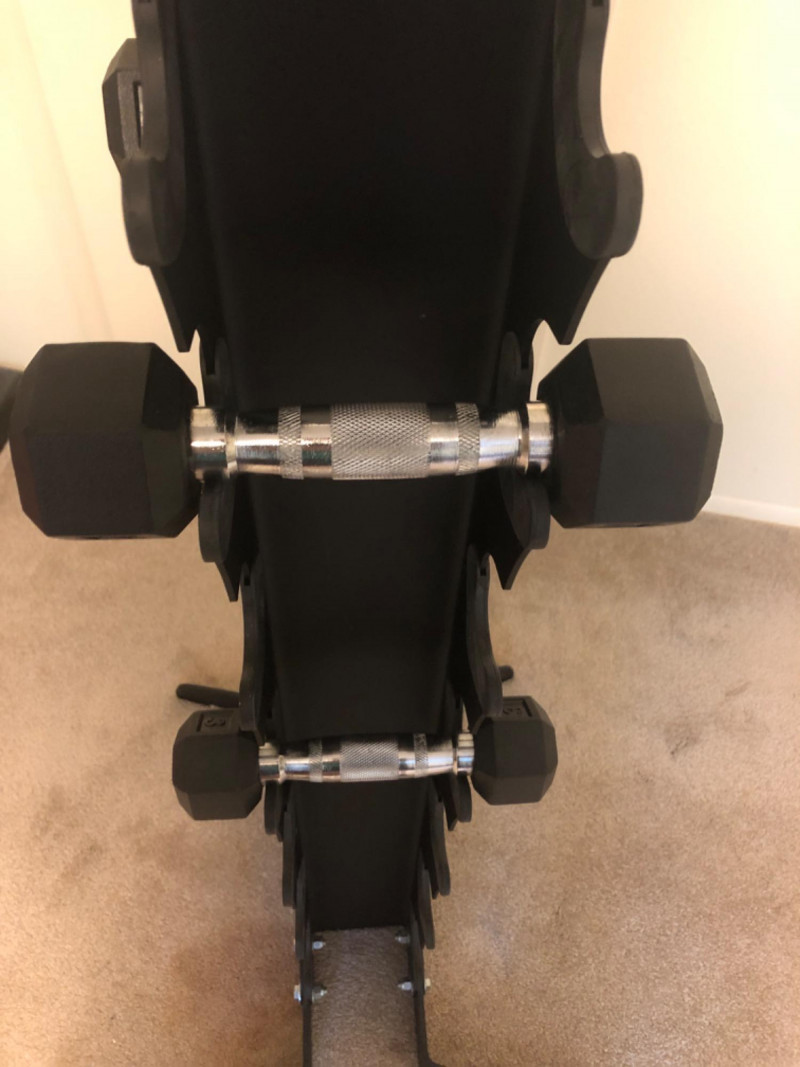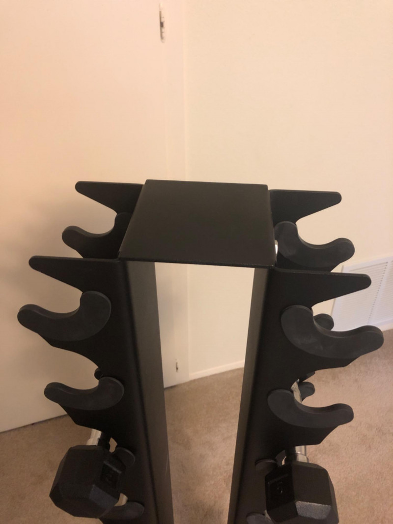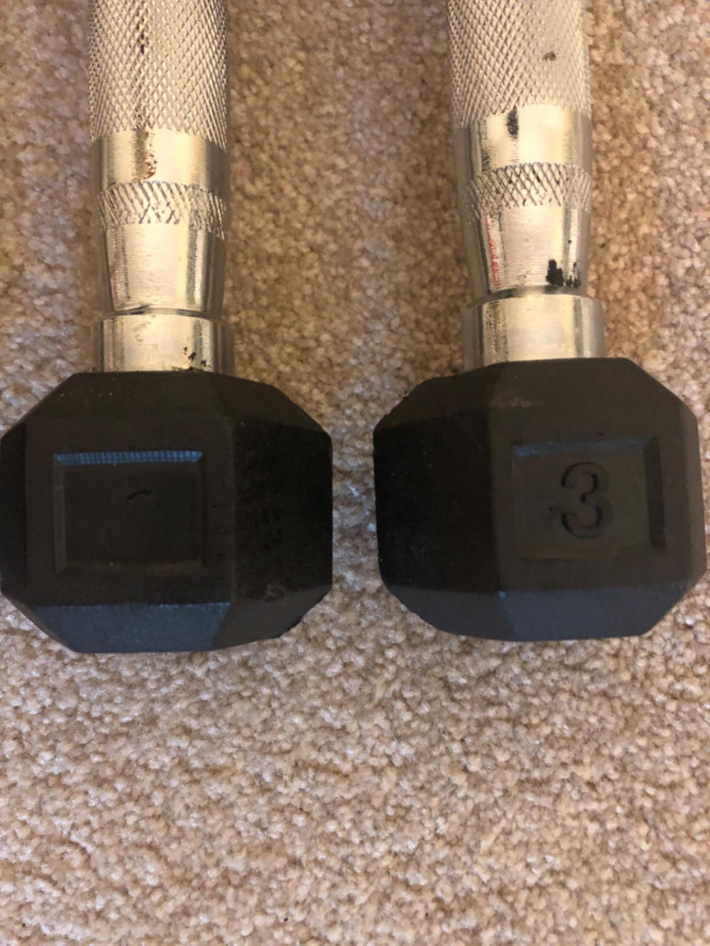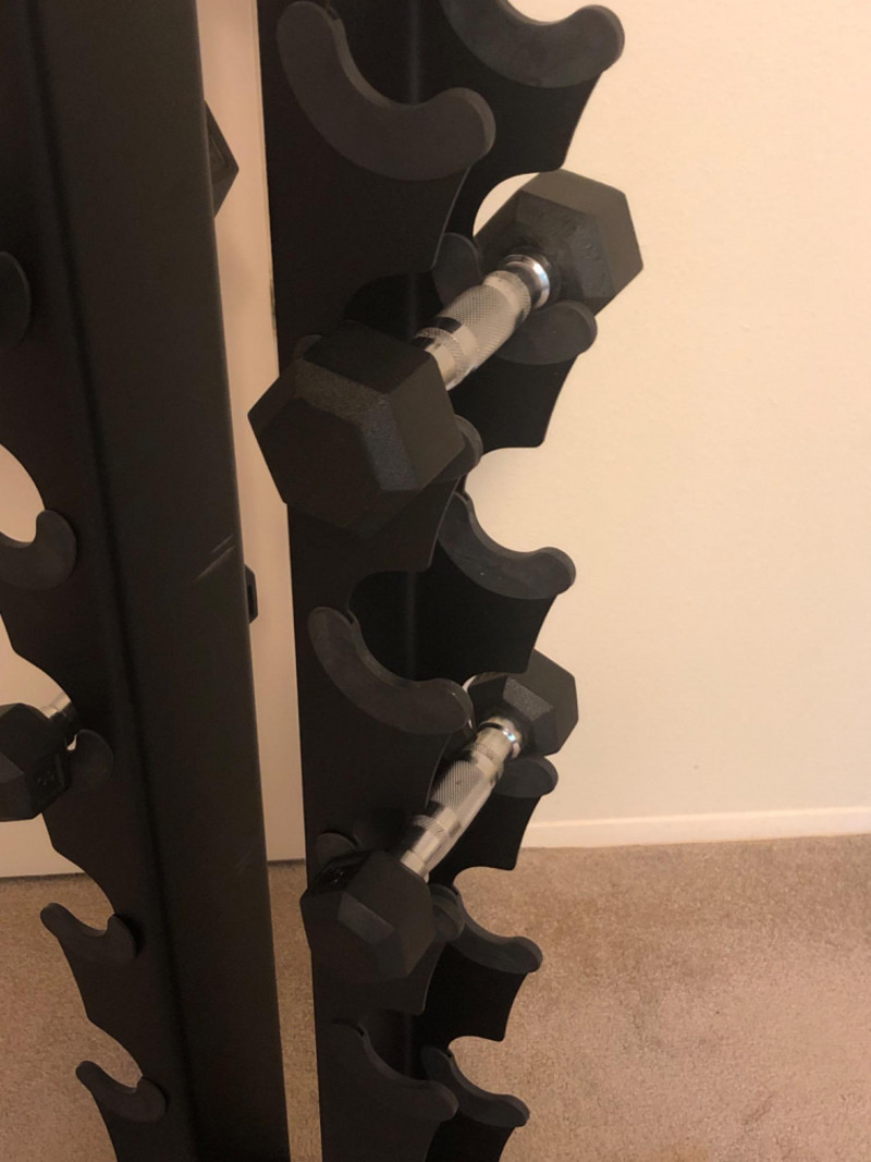 Compact metal dumbbell rack with fitted slots holding two pairs of neoprene weights: 5 lb and 3 lb. Ideal for home gym setups or beginner resistance training routines. Freestanding structure fits easily into corners or workout zones. Friendly Reminder: This auction will start closing at 6:30pm on Tuesday, August 12th