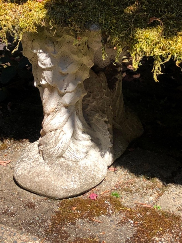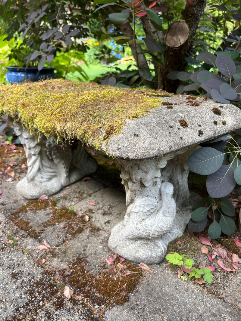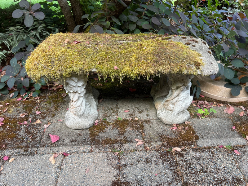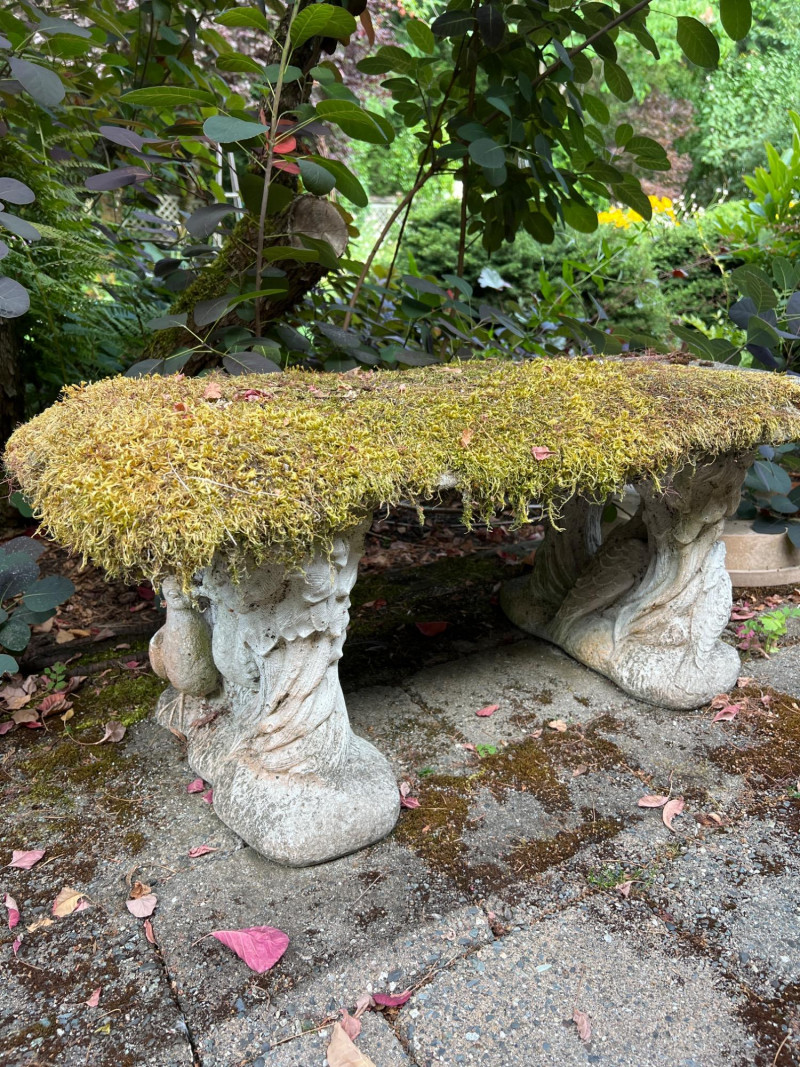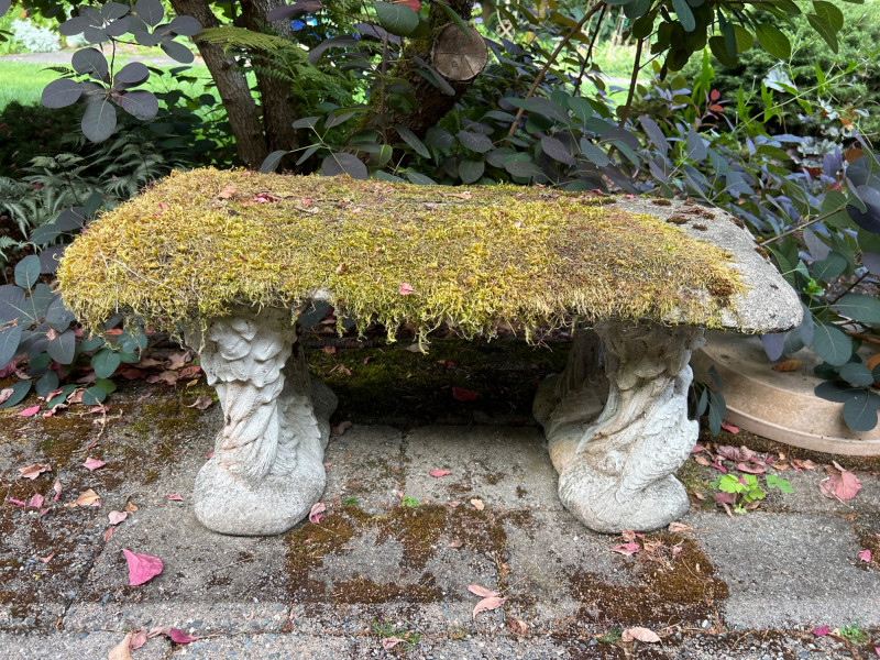 Invite the elegance of nature into your landscape with this hand-sculpted concrete garden bench, beautifully aged and cloaked in moss. Its artfully sculpted legs, resembling tree branches, cradle nestled birds in high relief, blending art and utility in one remarkable piece. The bench evokes woodland whimsy that makes it a striking accent for shaded garden nooks or contemplative paths. With a solid and graceful presence, it offers functional seating while serving as a sculptural centerpiece. Its moss-covered surfaces and deep carved textures speak to years spent outdoors, lending charm and authenticity to any garden or patio setting. Highlights: Ornately sculpted concrete legs with bird motifs Tree trunk–style forms add organic elegance Naturally aged surface with rich moss patina Ideal for gardens, patios, or serene pathways Sturdy build and weathered character Friendly Reminder: This auction will start closing at 6:30pm on Tuesday, August 12th