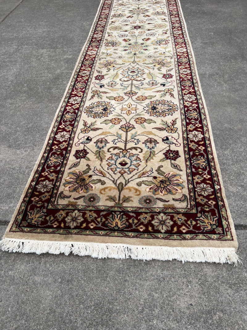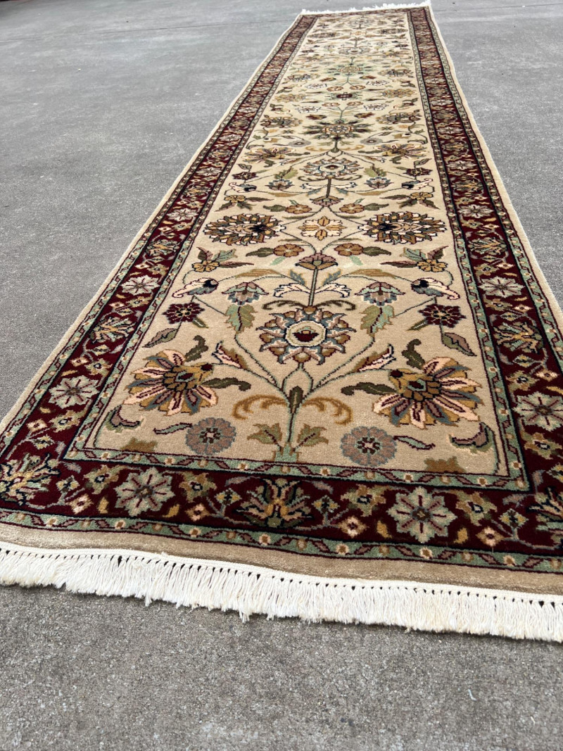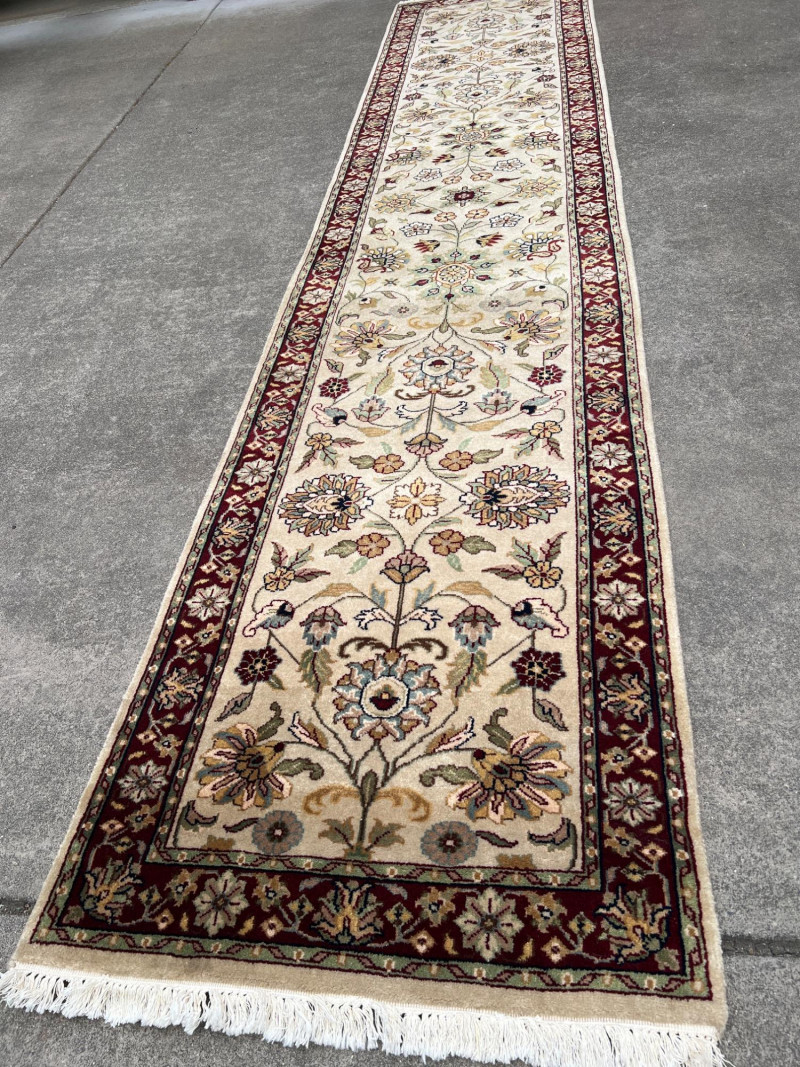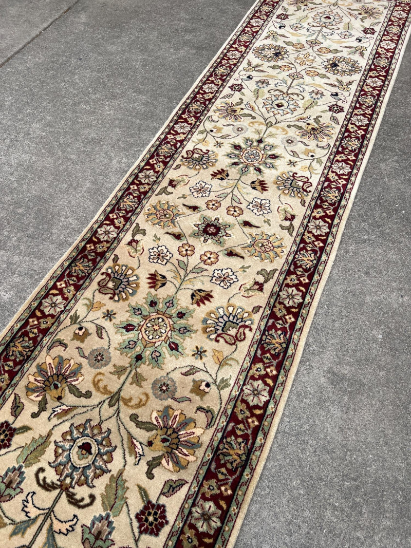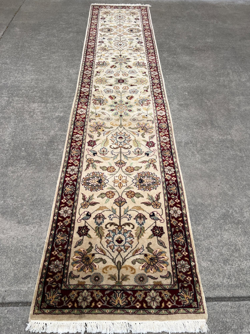 Antique runner rug is 12.25 feet in length and originates from either South Kashmir or Srinagar, India. The design features a floral otif set against a cream background with a burgundy border. The rug appears hand-knotted using 100% wool pile. Suitable for use in a hallway or transitional space. Original cost of runner was $1,100.00 (Oriental Rug Company). Receipt available. Friendly Reminder: This auction will start closing at 6:30pm on Tuesday, August 12th