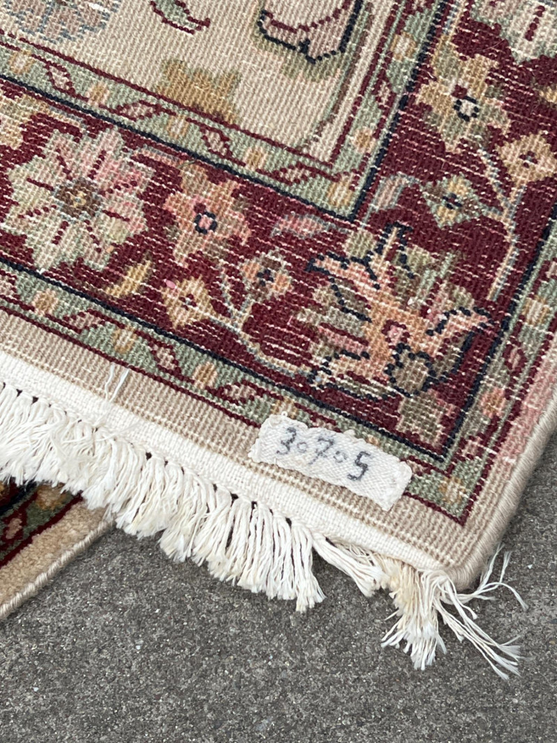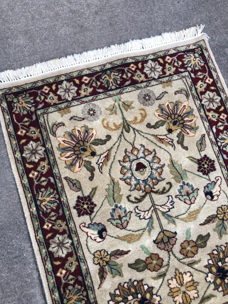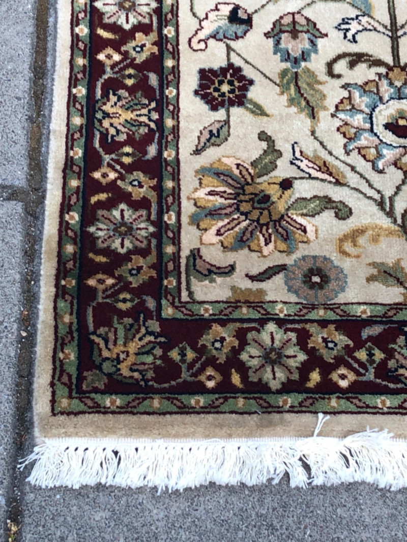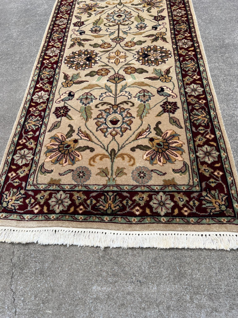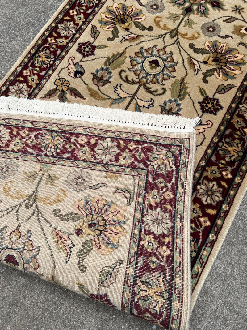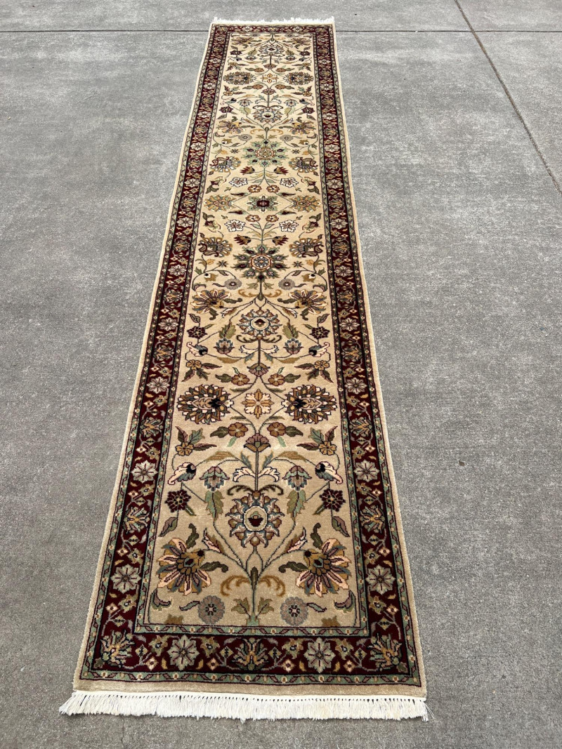 Antique runner rug is 12.25 feet in length and originates from either South Kashmir or Srinagar, India. The design features a floral otif set against a cream background with a burgundy border. The rug appears hand-knotted using 100% wool pile. Suitable for use in a hallway or transitional space. Original cost of runner was $1,100.00 (Oriental Rug Company). Receipt available. Friendly Reminder: This auction will start closing at 6:30pm on Tuesday, August 12th