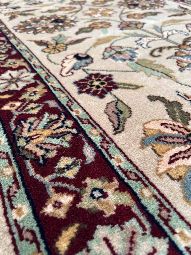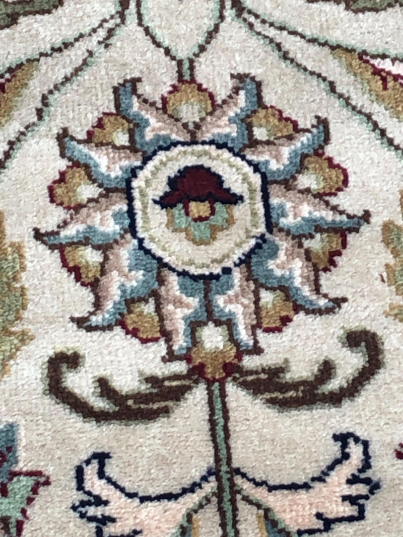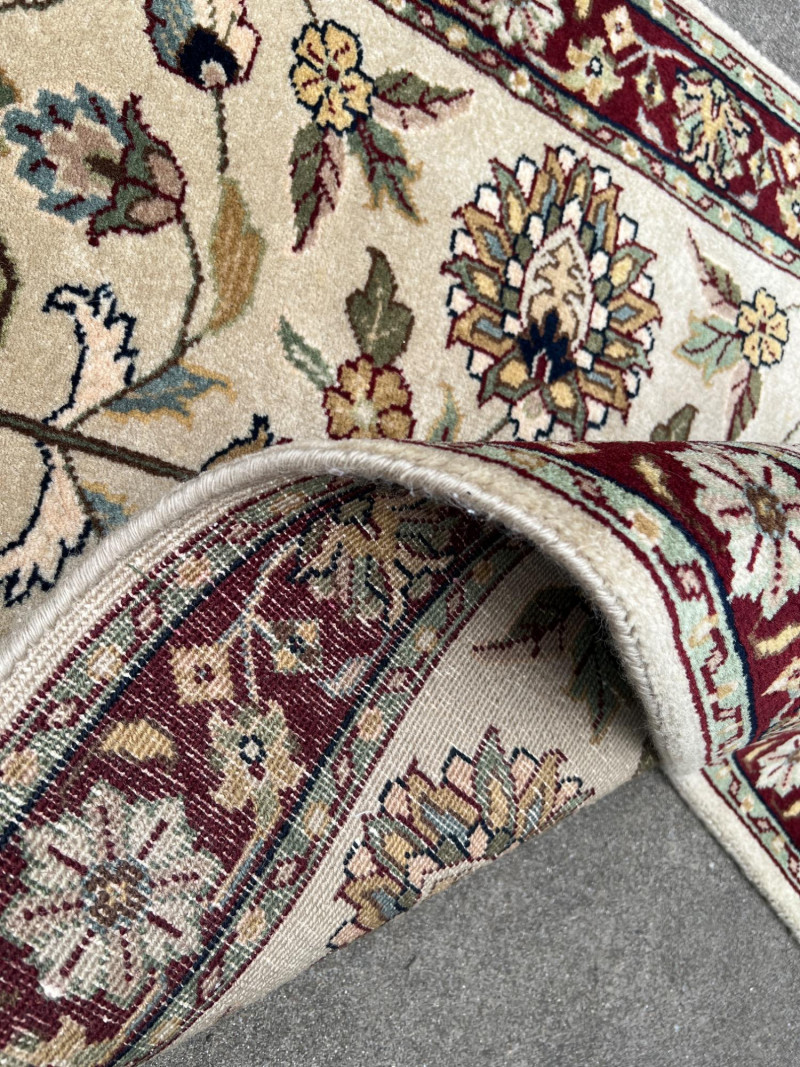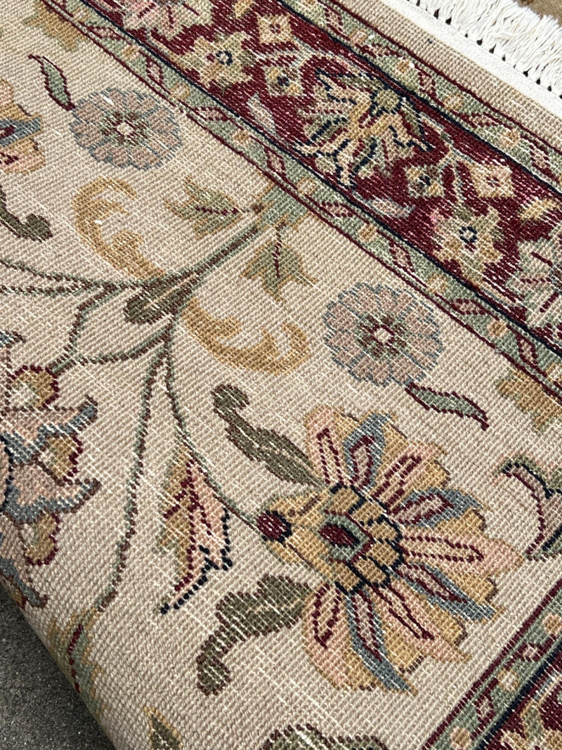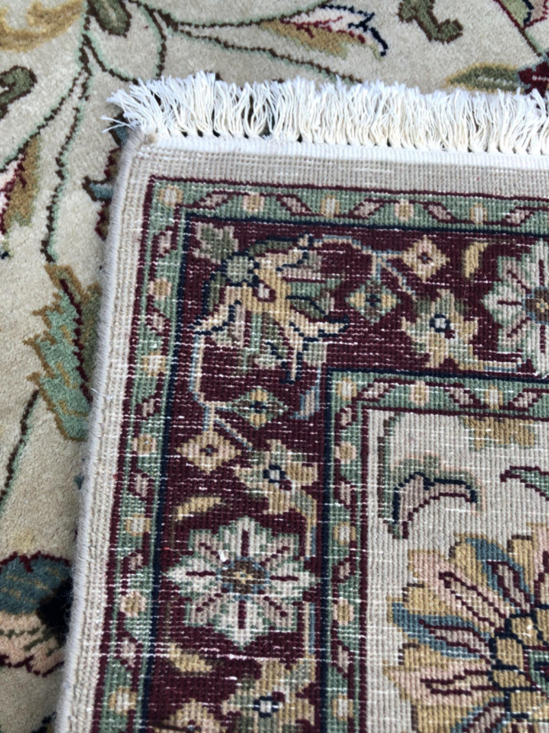 Antique runner rug is 12.25 feet in length and originates from either South Kashmir or Srinagar, India. The design features a floral otif set against a cream background with a burgundy border. The rug appears hand-knotted using 100% wool pile. Suitable for use in a hallway or transitional space. Original cost of runner was $1,100.00 (Oriental Rug Company). Receipt available. Friendly Reminder: This auction will start closing at 6:30pm on Tuesday, August 12th