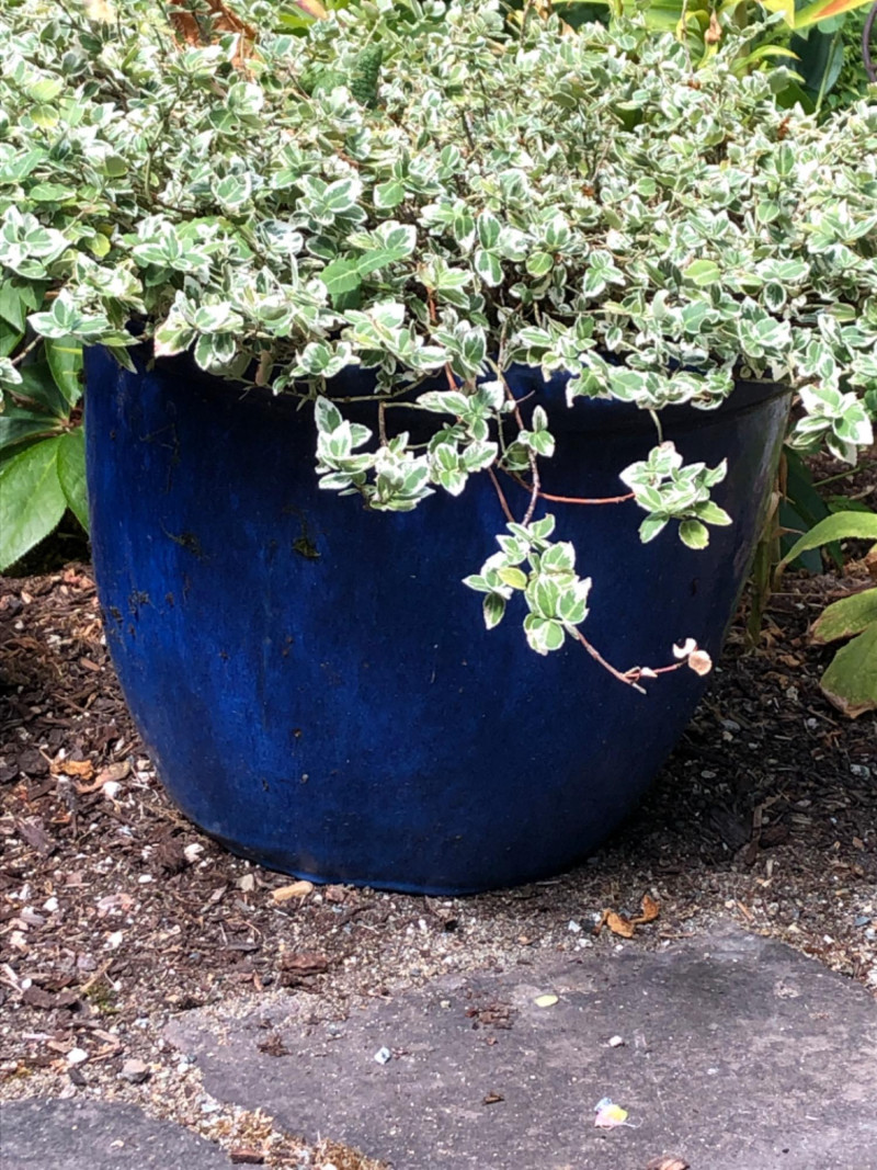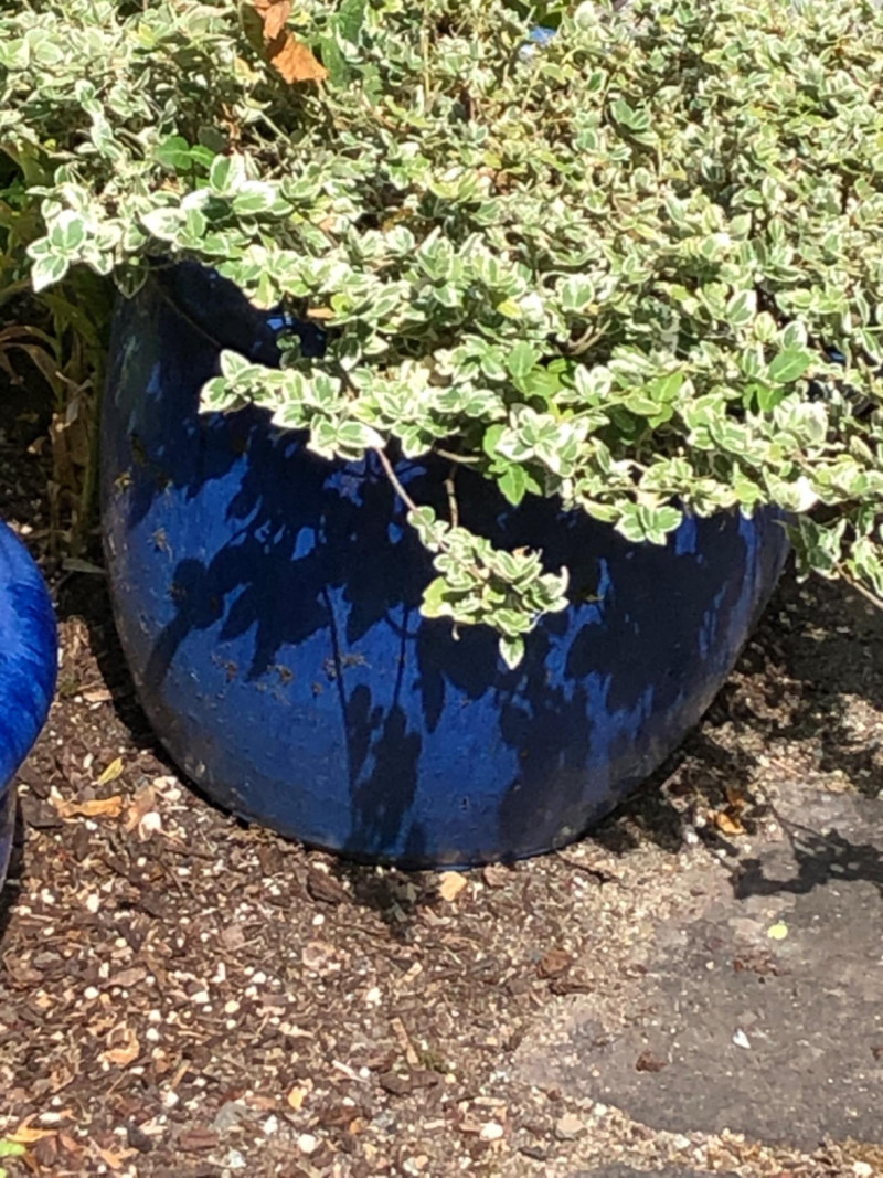 Vibrant cobalt blue ceramic planters with established seasonal blooms including petunia and coleus. Striking color contrast and healthy foliage ideal for patio or entryway. Planter Dimensions: Friendly Reminder: This auction will start closing at 6:30pm on Tuesday, August 12th