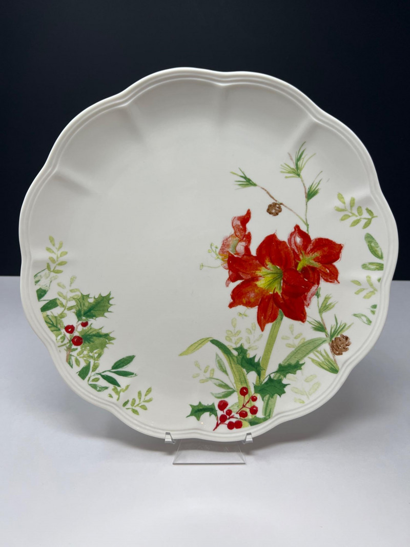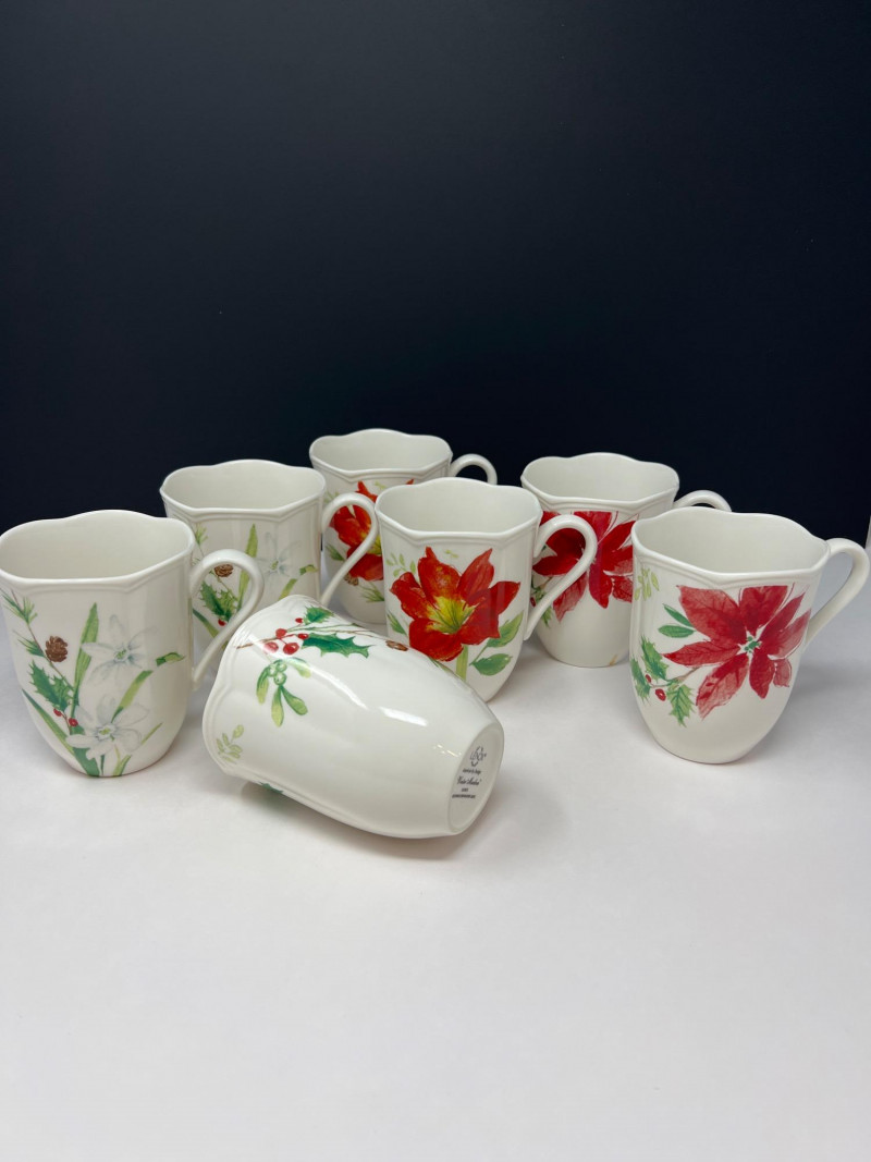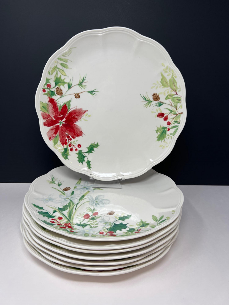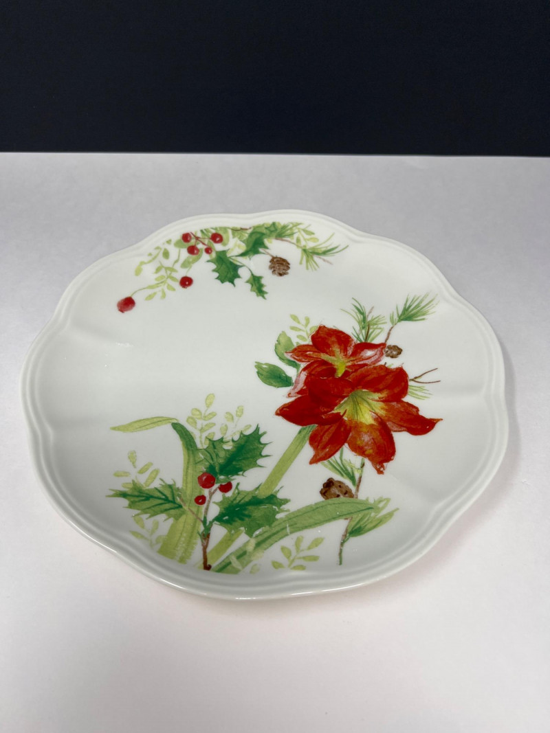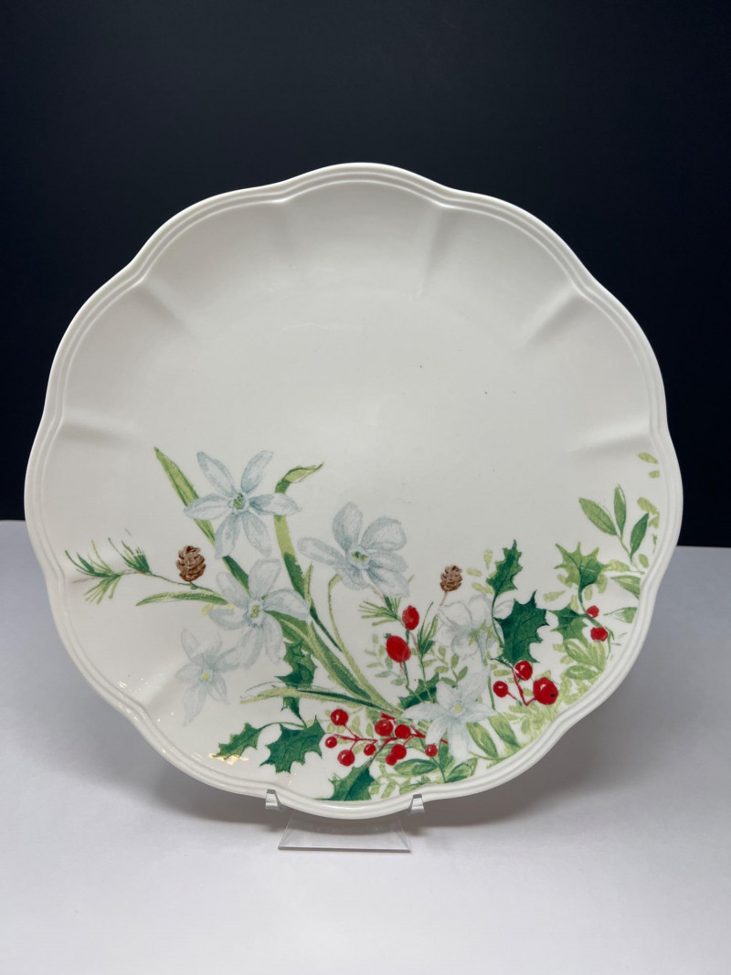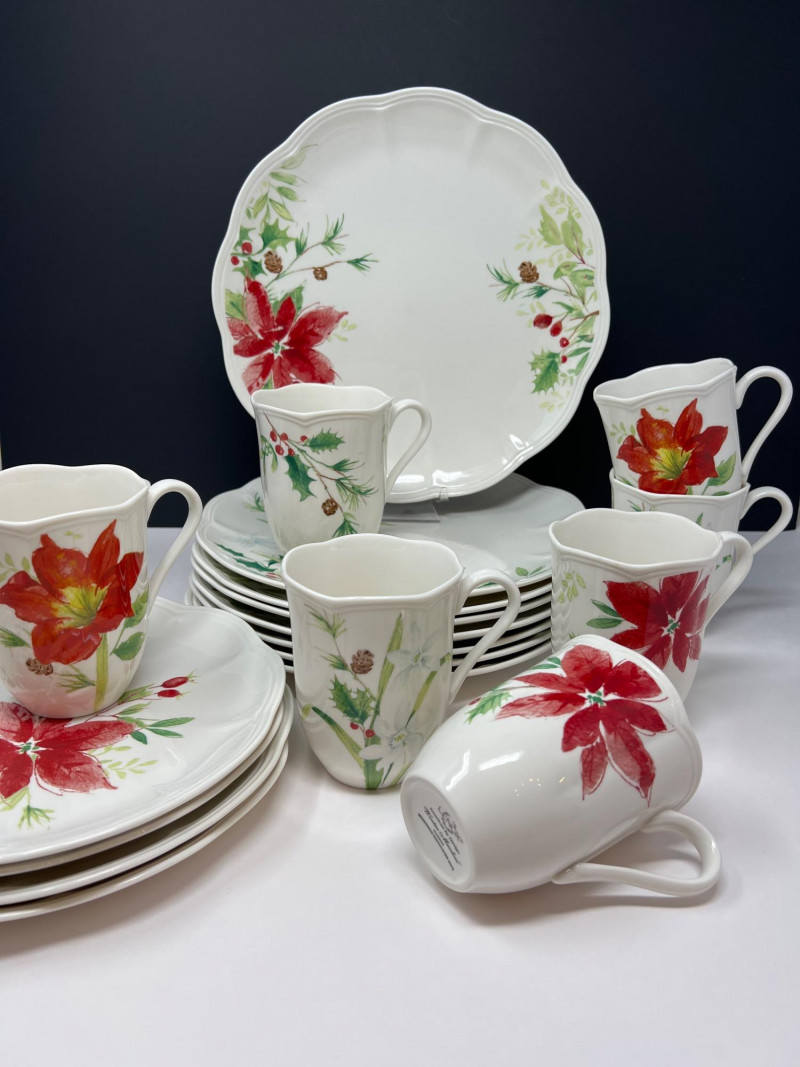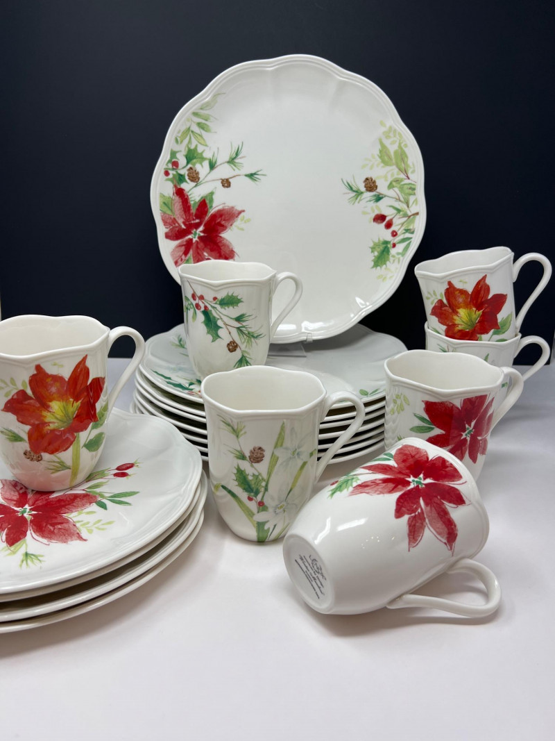 Graceful porcelain dishware set from Lenox’s Winter Meadow collection featuring leaf and floral motifs across plates, bowls, and serveware. Elegant cream base with pastel accents—perfect for seasonal gatherings. Contents: 4 dinner plates – poinsettia pattern (11" diameter) 2 dinner plates – white winter floral (11" diameter) 2 dinner plates – red amaryllis (11" diameter) 4 salad plates – mixed designs (9.25" diameter) 7 handled mugs – coordinated holiday motifs (4.5" tall) Features: Porcelain construction Holiday patterns include poinsettia, holly, berries, and winter florals Coordinated pieces suitable for seasonal use or display Dishwasher safe Friendly Reminder: This auction will start closing at 6:30pm on Tuesday, August 12th