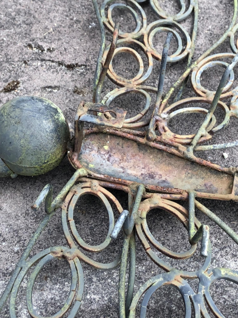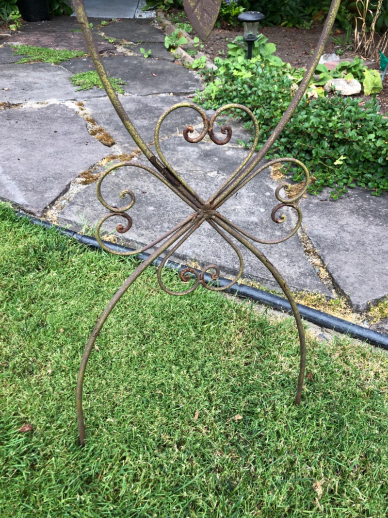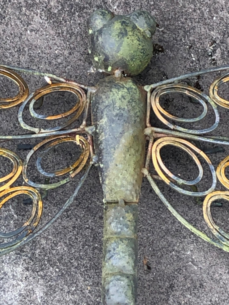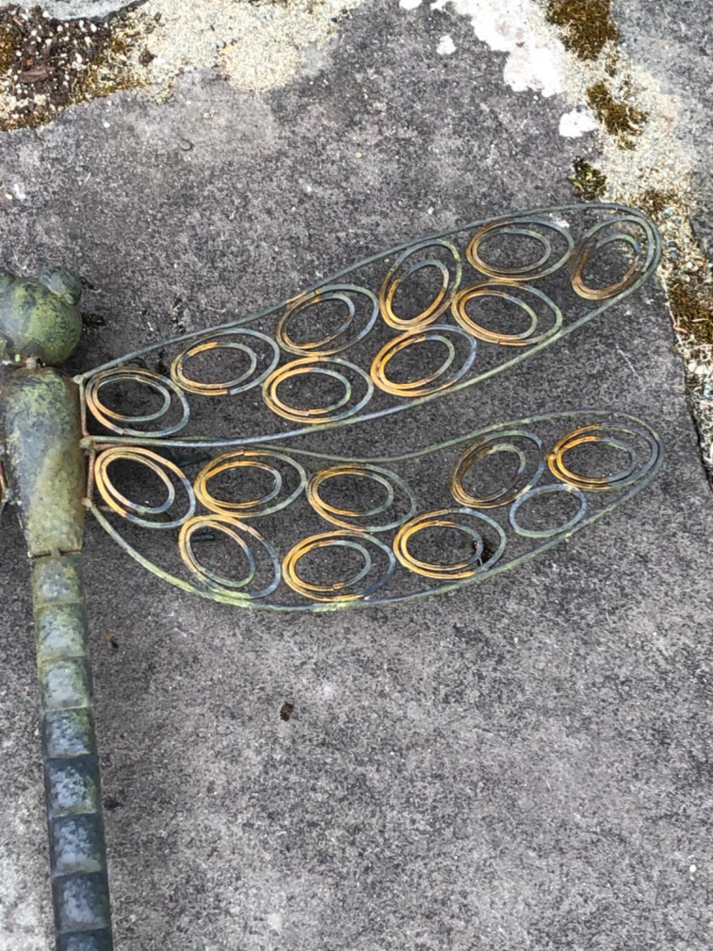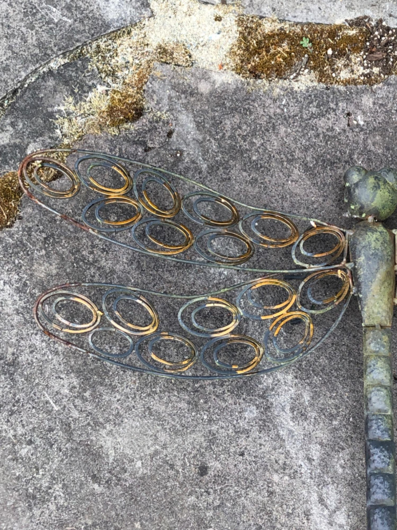 Pair of metal garden sculptures featuring a butterfly and dragonfly in stylized forms. Decorative silhouettes add movement and natural detail to outdoor spaces and planter areas. Butterfly Dimensions: 45" high x 20" wide Dragonfly Dimensions: 16" long x 26" wide Friendly Reminder: This auction will start closing at 6:30pm on Tuesday, August 12th