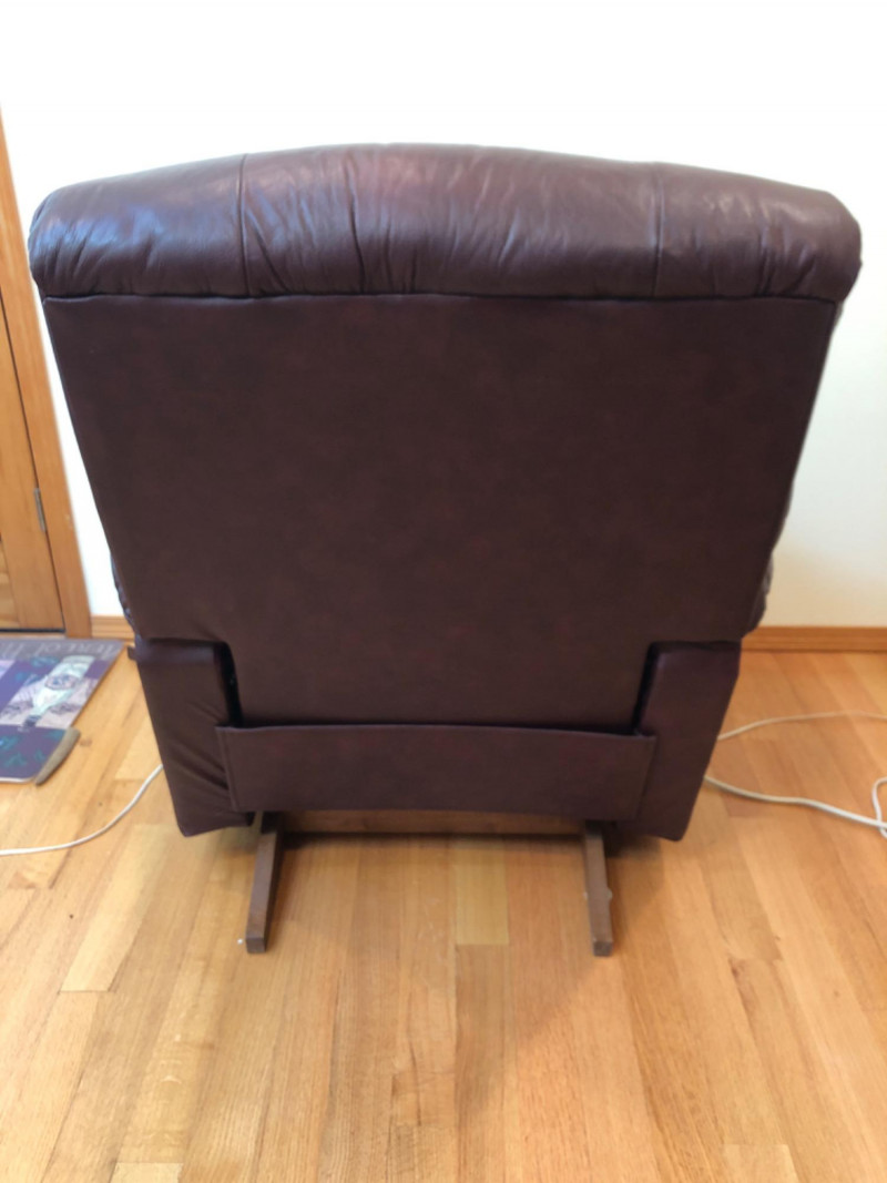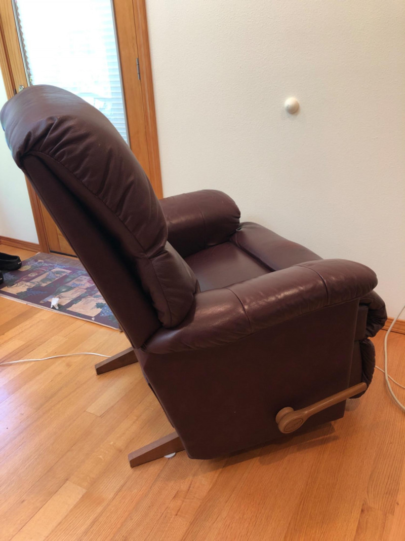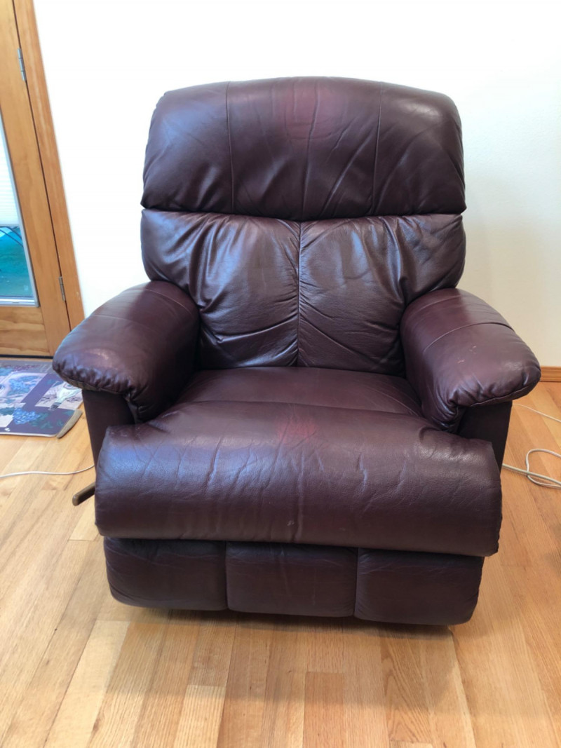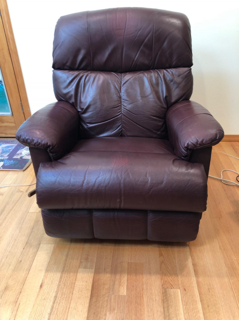 La-Z-Boy recliner rocker offers cushioned comfort with manual recline function and gentle rocking motion. Upholstered in soft polyurethane (bonded leather) fabric with padded arms and tiered back support. Dimensions: 39" - Ground to top of back 17" - Ground to top of seat 36" wide 37" deep Bidding on this lot is an agreement that: (1.) You will have 2 capable, able-bodied persons to lift and load at a minimum. (2.) You