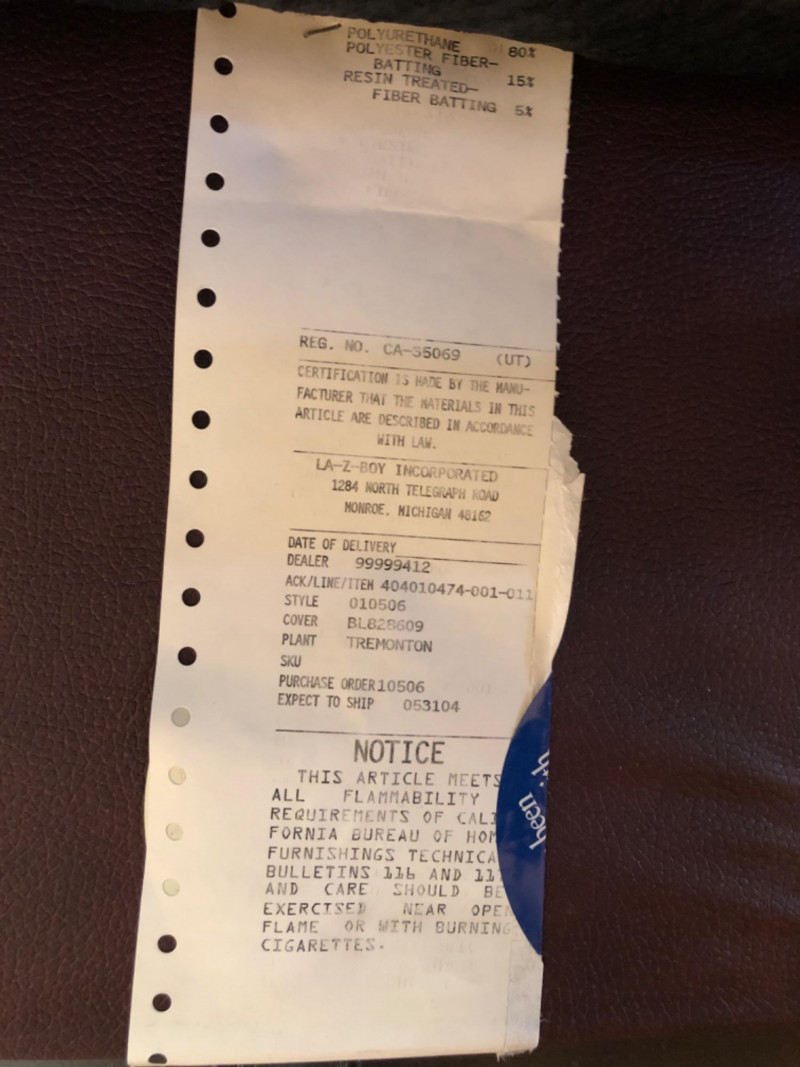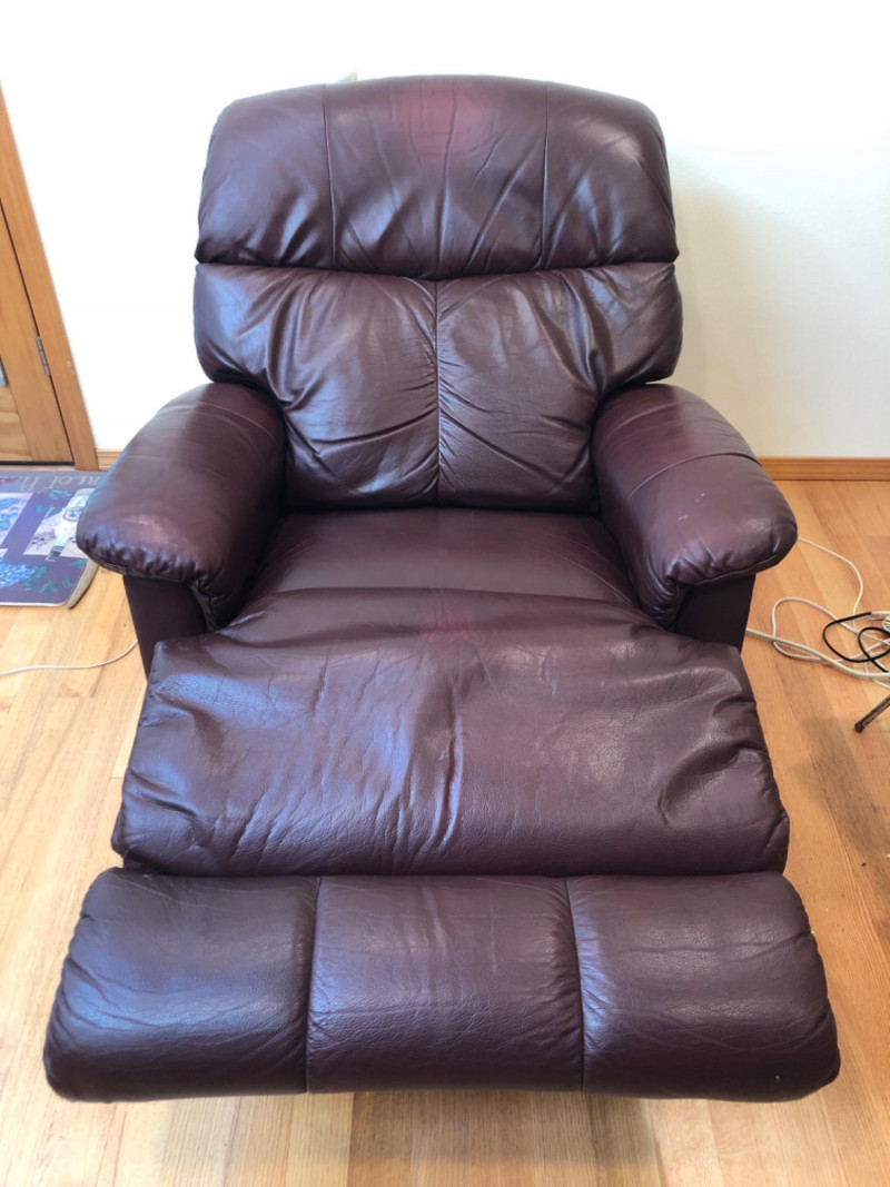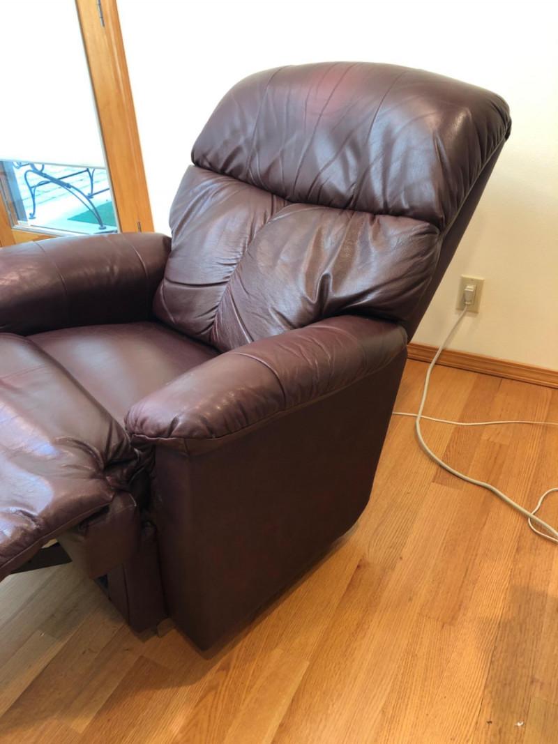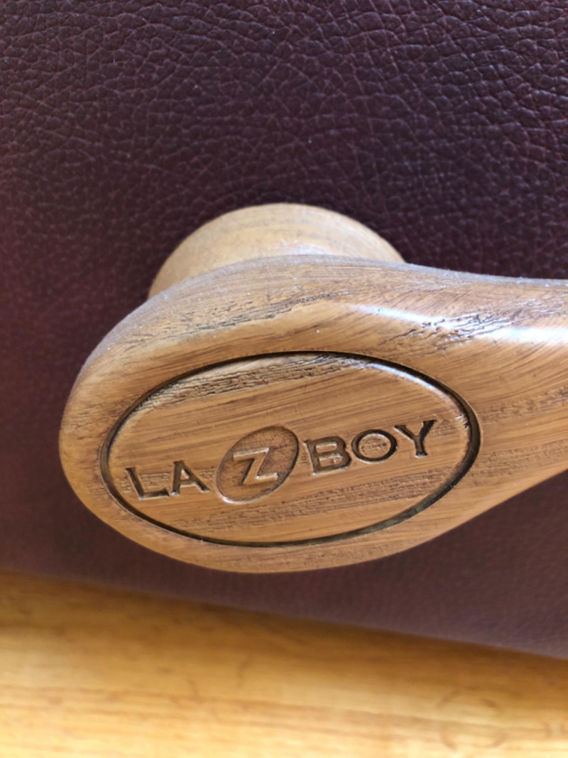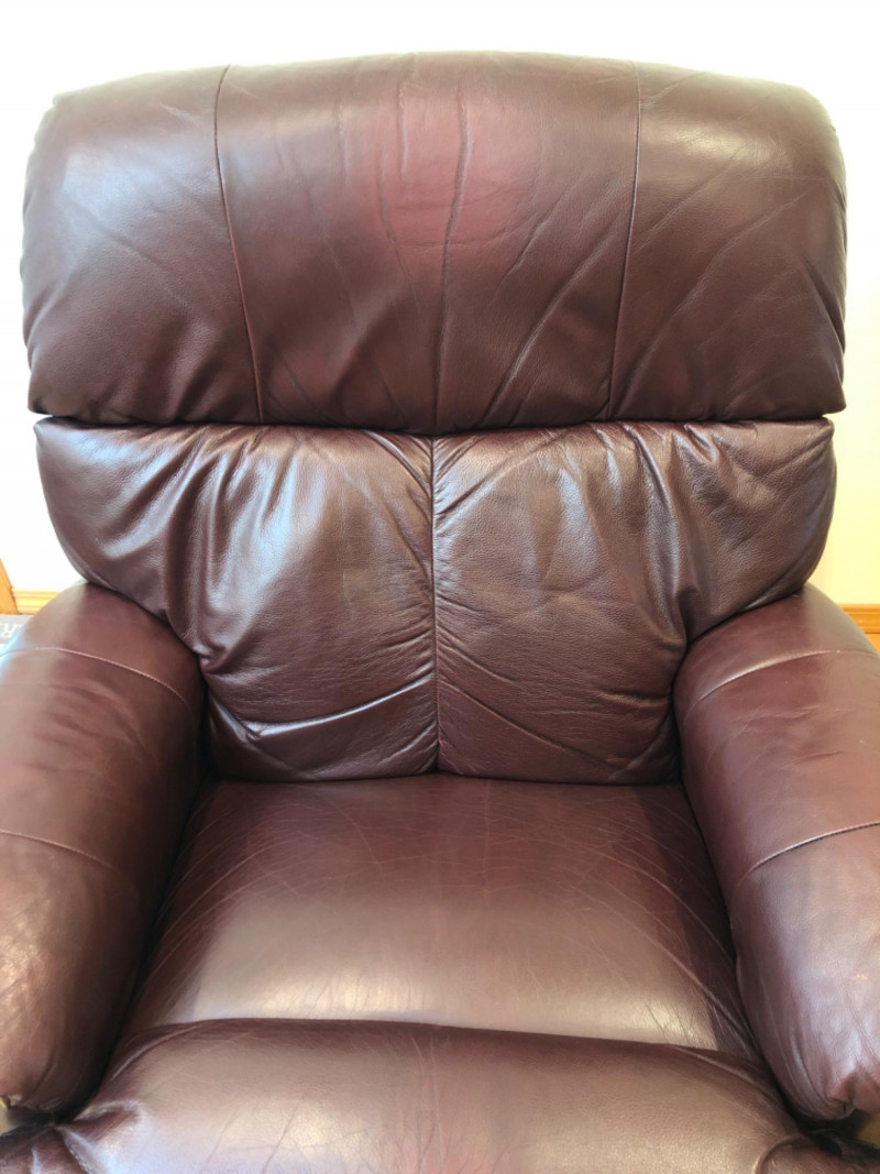 La-Z-Boy recliner rocker offers cushioned comfort with manual recline function and gentle rocking motion. Upholstered in soft polyurethane (bonded leather) fabric with padded arms and tiered back support. Dimensions: 39" - Ground to top of back 17" - Ground to top of seat 36" wide 37" deep Bidding on this lot is an agreement that: (1.) You will have 2 capable, able-bodied persons to lift and load at a minimum. (2.) You
