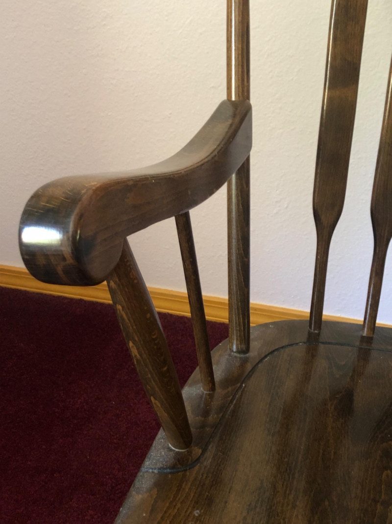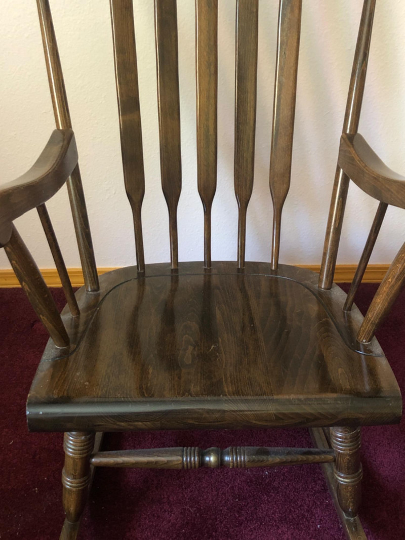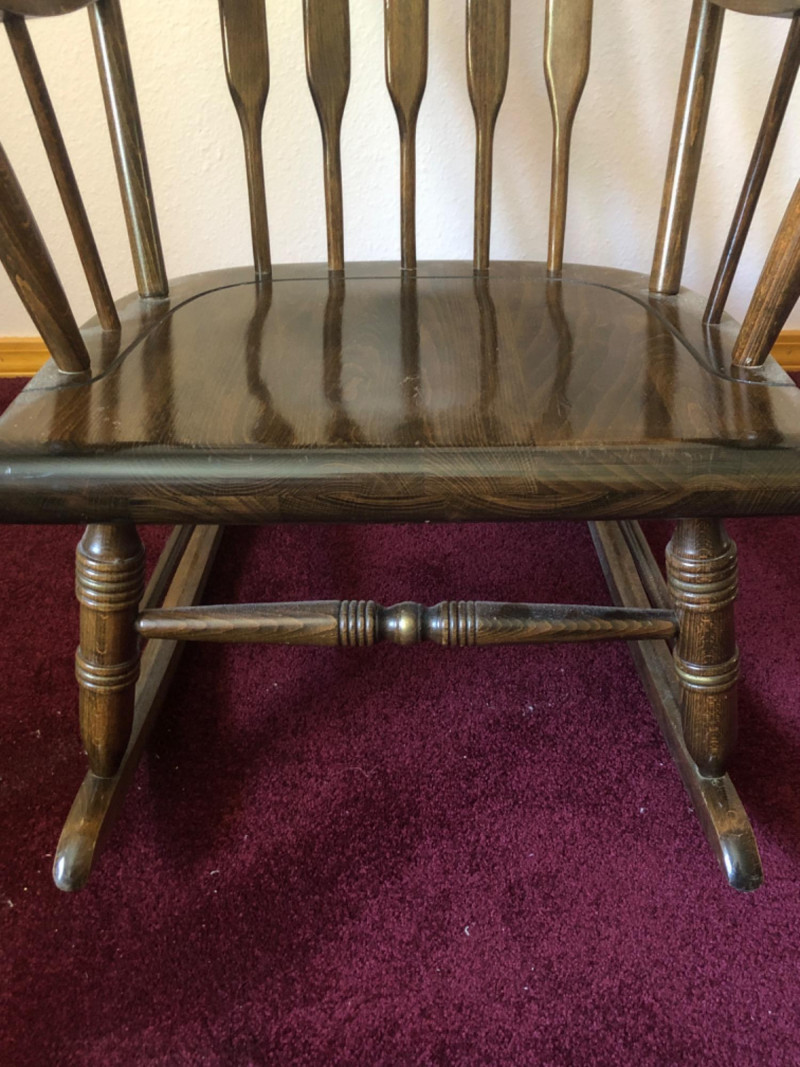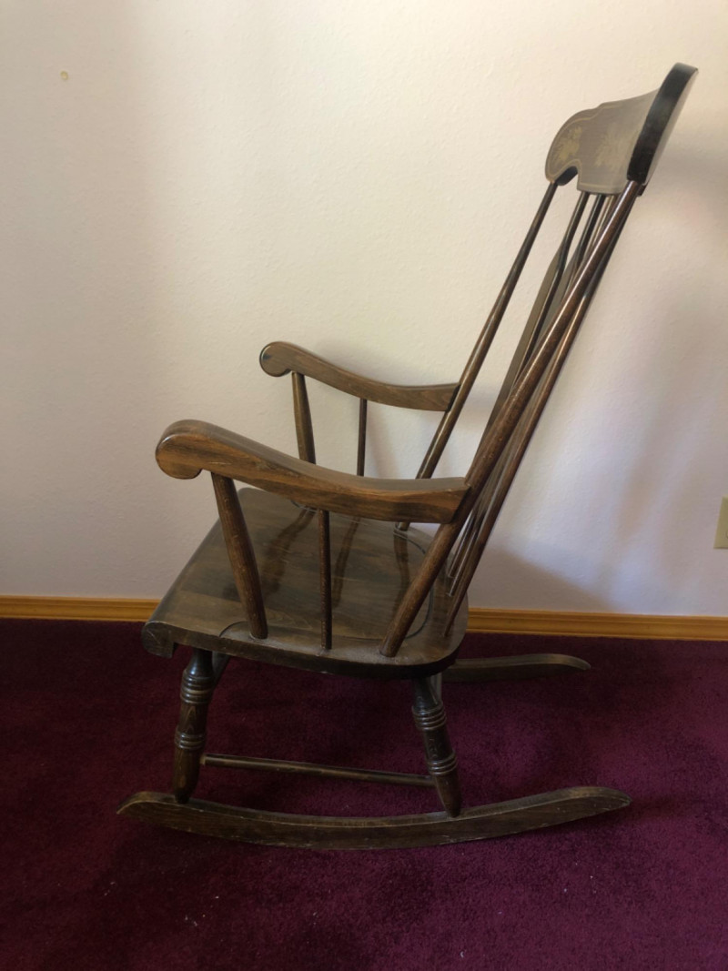 Classic wood rocking chair crafted by Novoles-Straza of Yugoslavia. Features simple contours and warm wood tones—designed with traditional European craftsmanship. Located on second floor, staircase nearby (15 steps) to ground level exit. Friendly Reminder: This auction will start closing at 6:30pm on Tuesday, August 12th