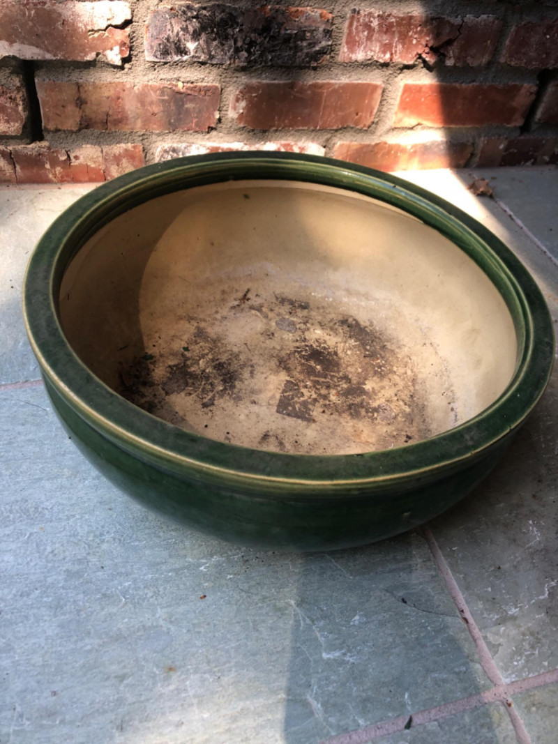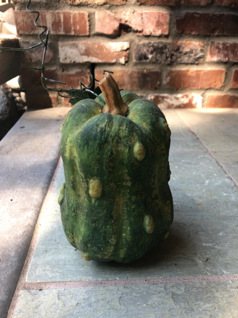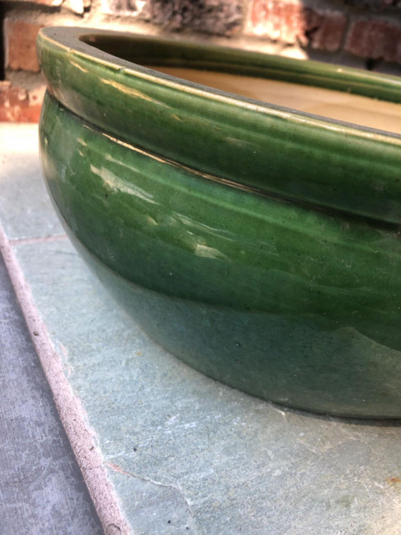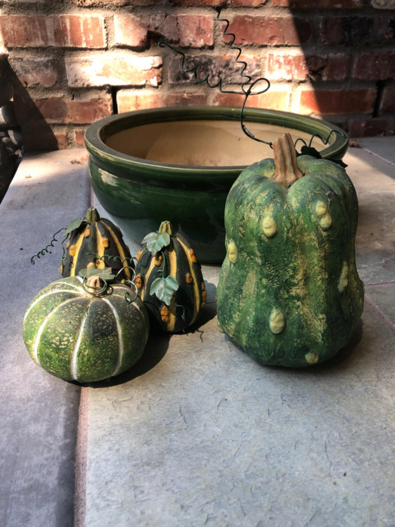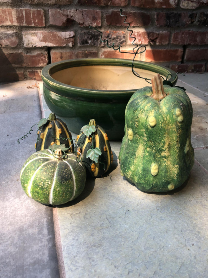 Lush green ceramic planter paired with a grouping of decorative gourds. A seasonal ensemble ideal for patios, porch displays, or autumn-inspired interiors. Bowl Dimensions: 6" high x 14" wide Gourd Dimensions: Friendly Reminder: This auction will start closing at 6:30pm on Tuesday, August 12th
