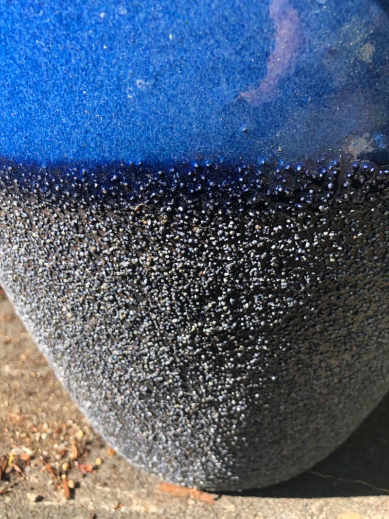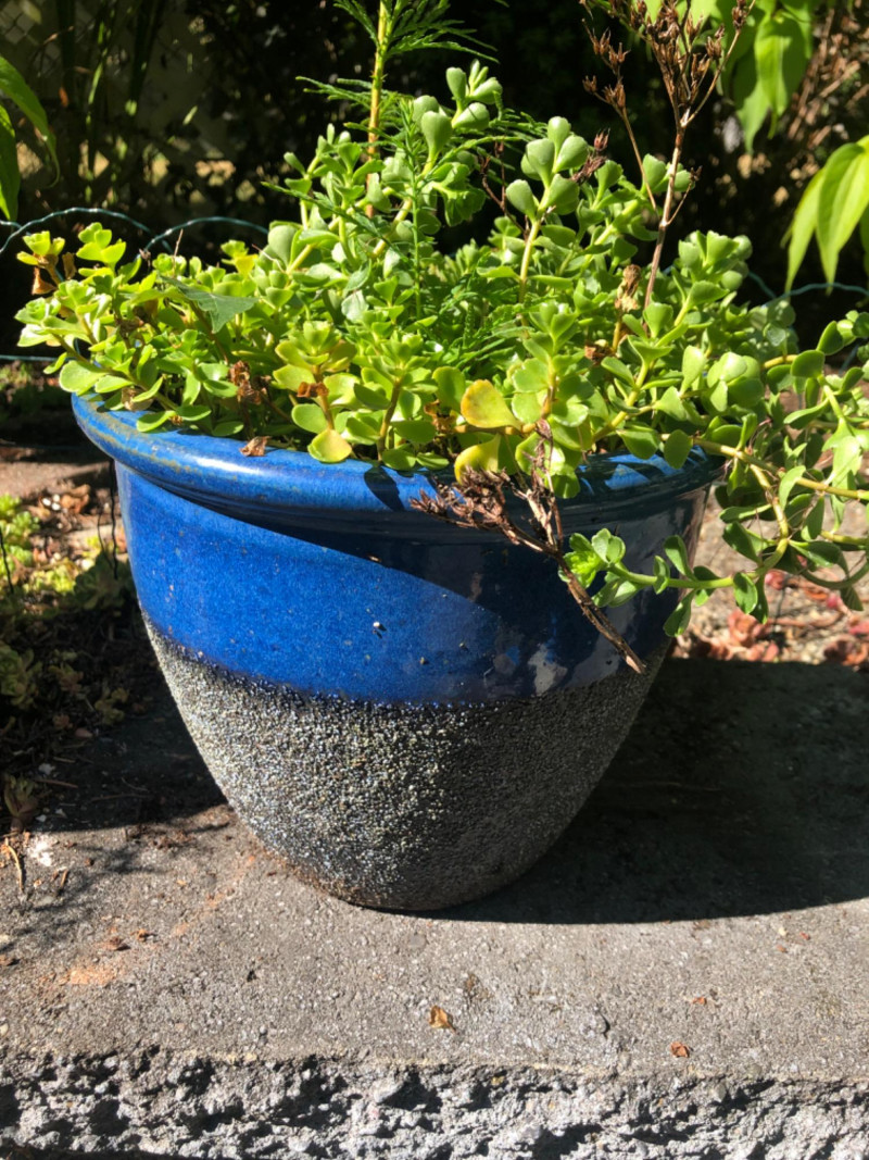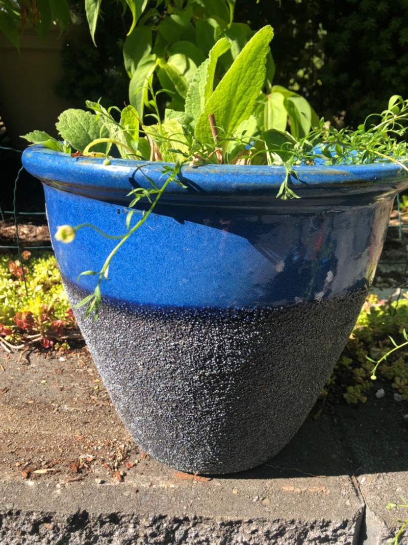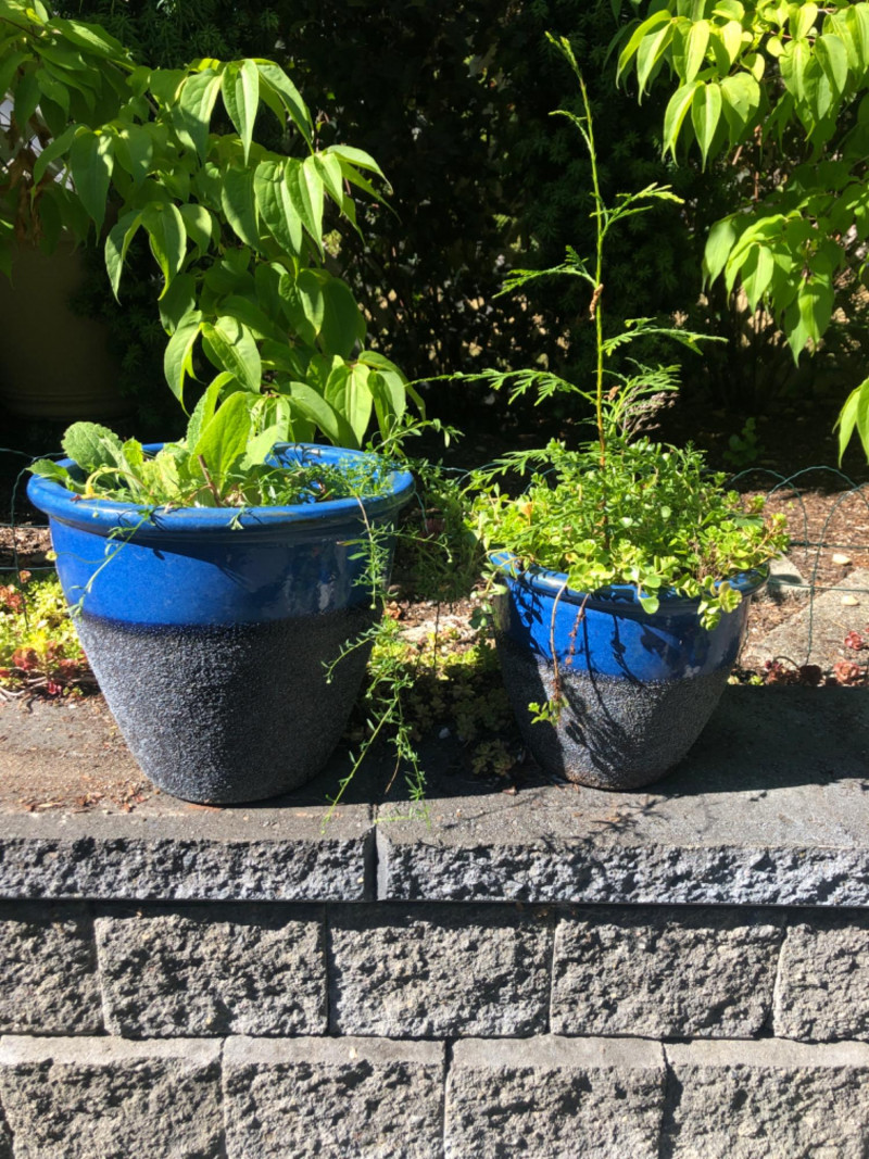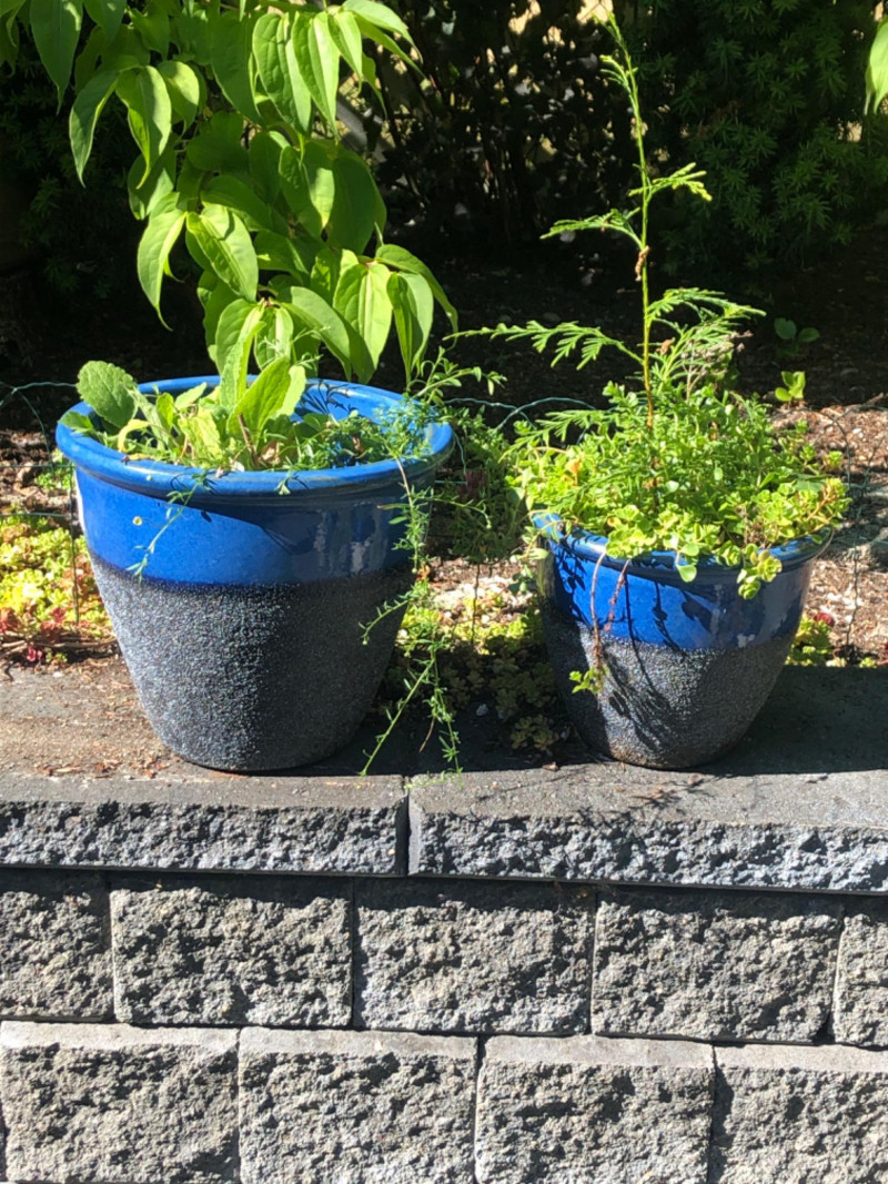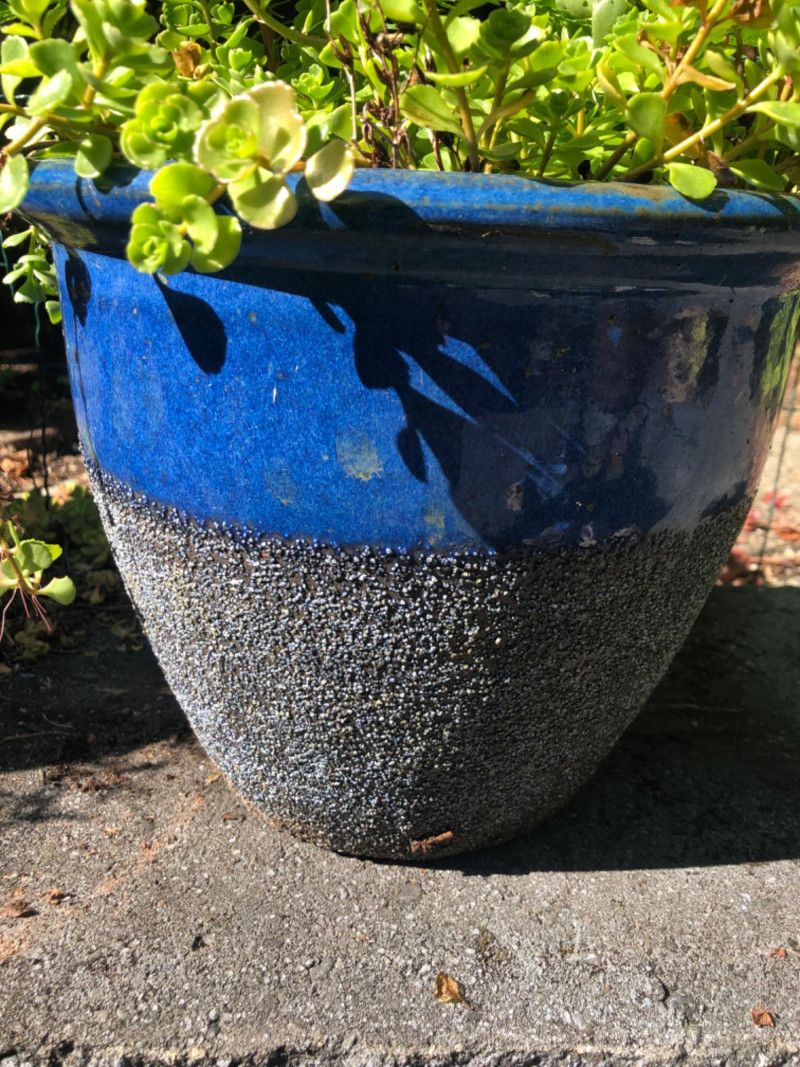 Two decorative ceramic planters in a rich blue glaze finish, each containing live plants. Designed for patio, entryway, or interior display. The pots showcase a rounded profile with subtle textures and make an eye-catching duo for nature lovers and home stylists alike. Pot Dimensions: Friendly Reminder: This auction will start closing at 6:30pm on Tuesday, August 12th
