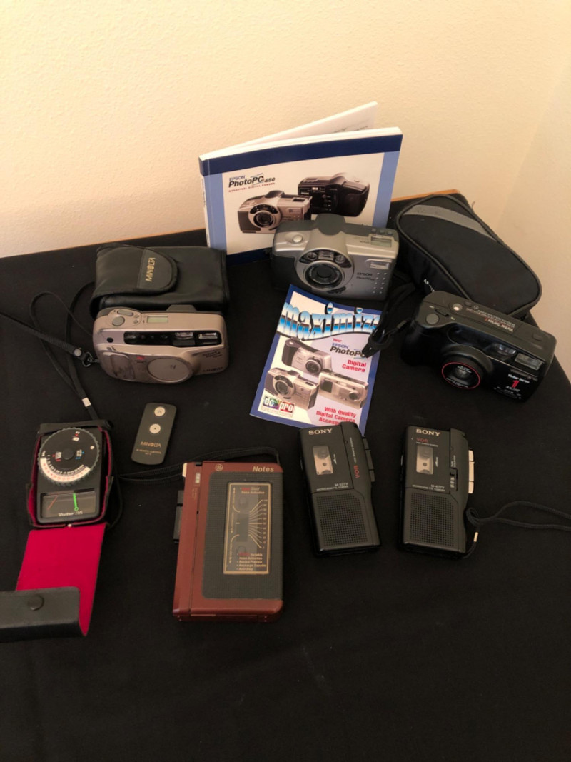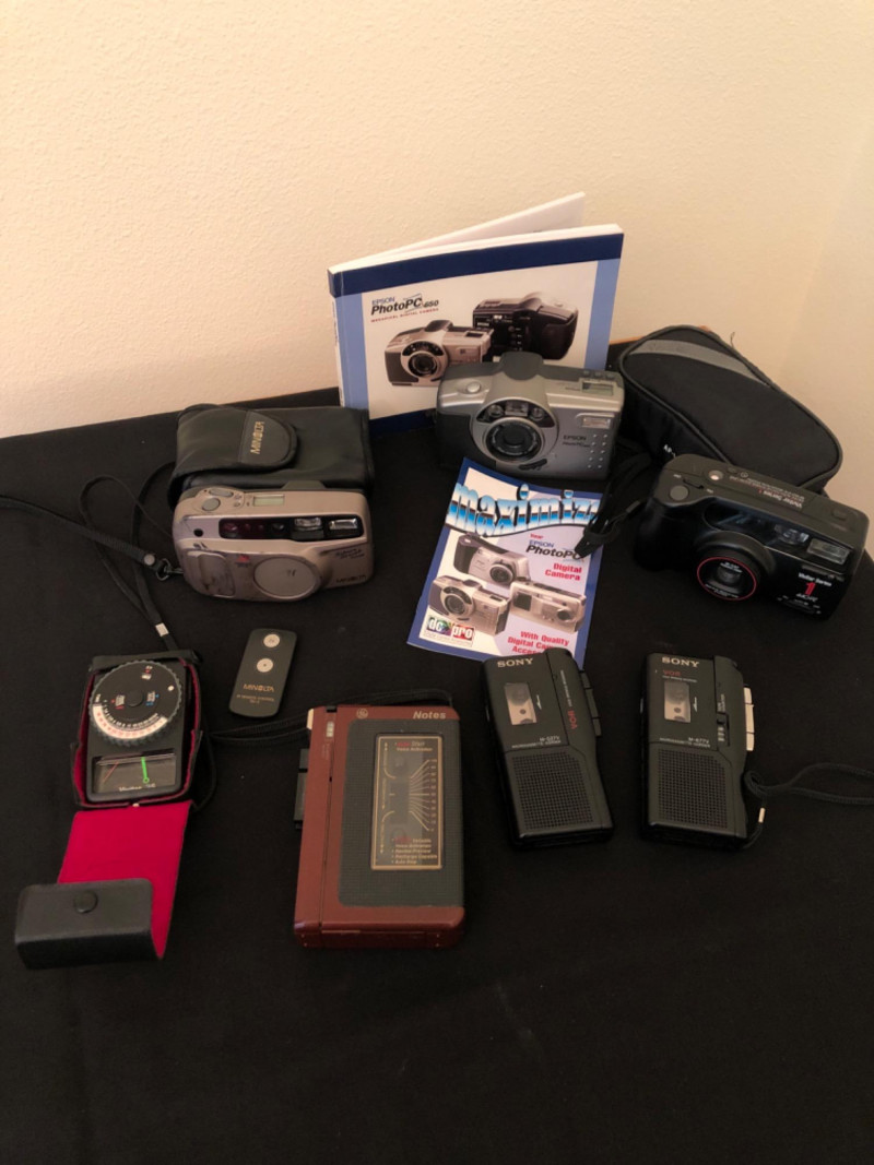 A vintage tech bundle for photography and audio enthusiasts! Includes: Vivitar Series 1 35mm Camera with Auto Focus, Power Zoom Lens & Red Eye Reduction Epson PhotoPC 650 Digital Camera (Mega Pixel) Minolta Silver Streak Zoom 35mm Camera with Remote Vivitar 35 Exposure Meter in case Microcassette Recorders: GE Notes, Sony M-527V, Sony M-677V Friendly Reminder: This auction will start closing at 6:30pm on Tuesday, August 12th