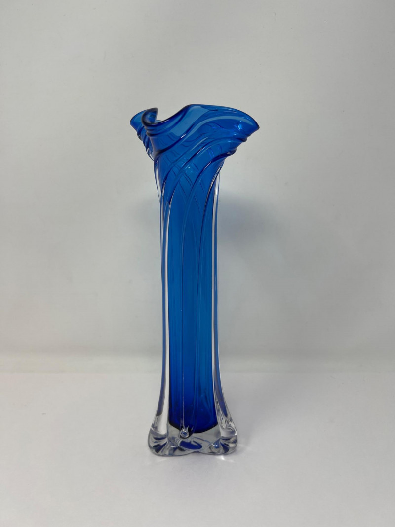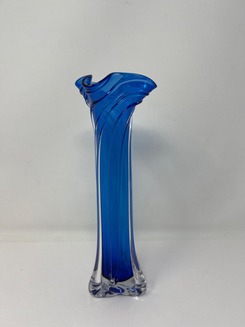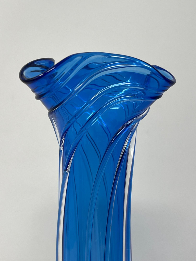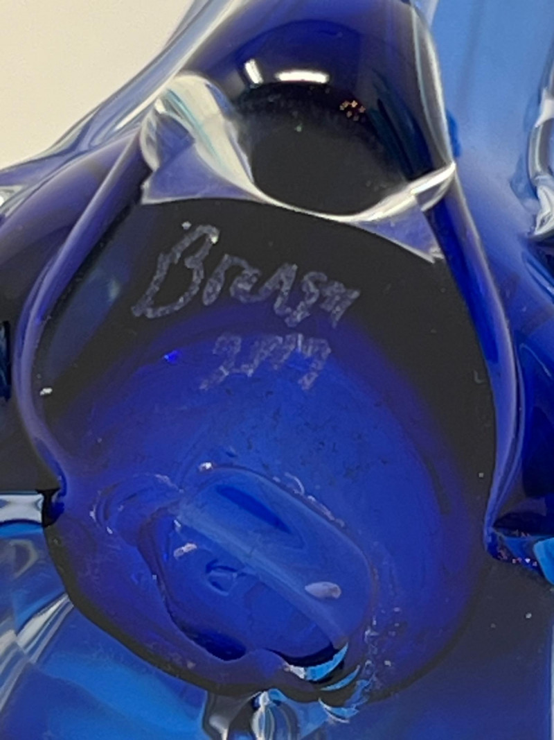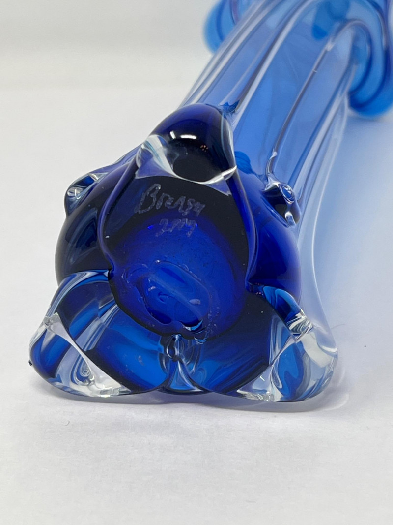 Hand-blown art glass vase by American glass artist Ed Branson, featuring a deep cobalt blue body with clear base and a flared, asymmetrical rim. The sculptural form and color gradient reflect Branson’s signature style from the early 1990s. Details: Artist: Ed Branson Material: Hand-blown glass Signature: Etched on base A striking example of contemporary studio glass, suitable for collectors or display in modern interiors. Number etched on base appears to be an artist style number and not the year. The vase is similar in style to those created by Branson in the 1990s. Friendly Reminder: This auction will start closing at 6:30pm on Tuesday, August 12th